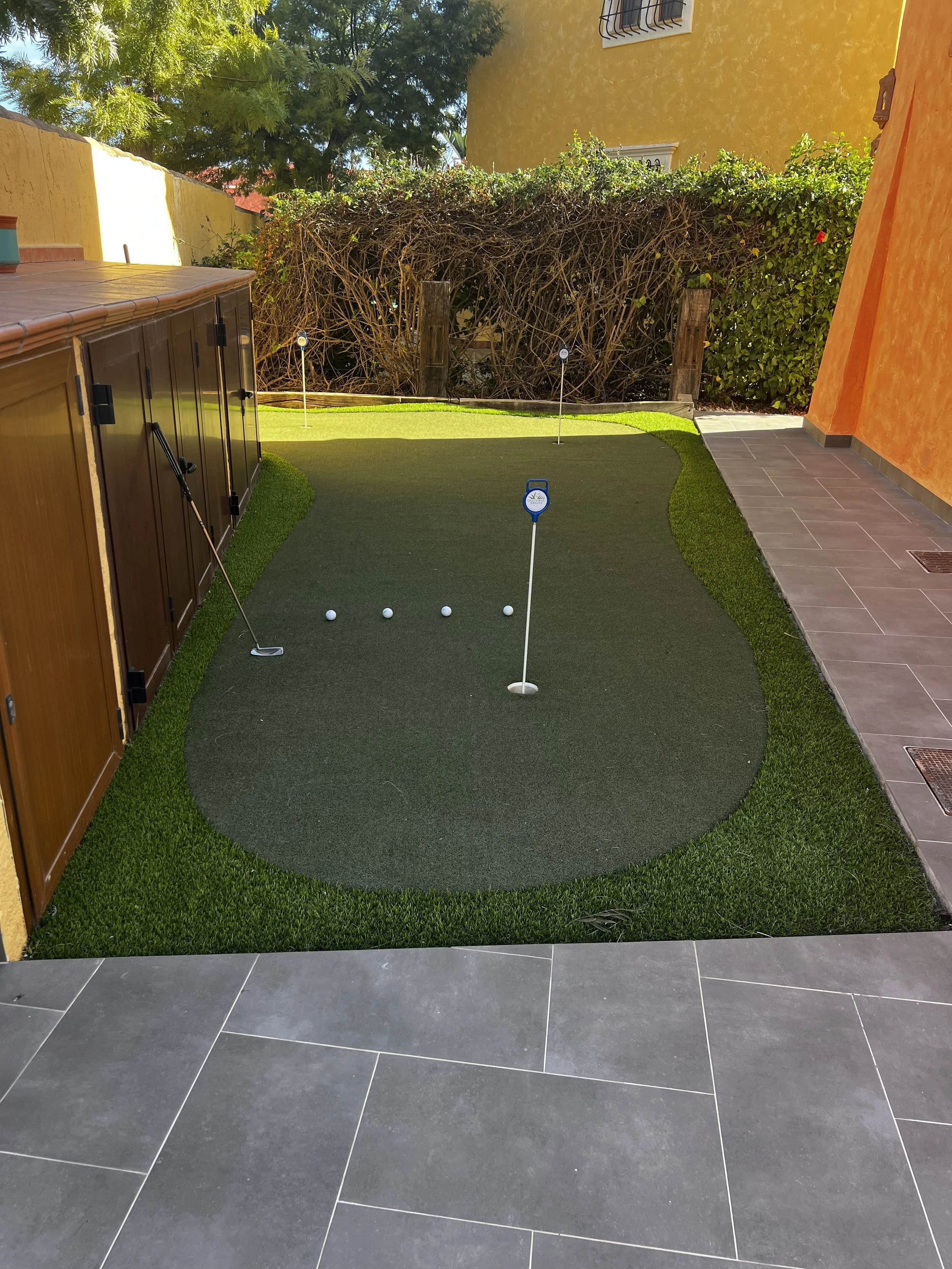 At the rear of the property, there is a practical storage area, complemented by a mini-golf practice zone. Additional storage is available on the top terrace, providing ample space. The gardens are level and meticulously maintained, featuring stylish tiling throughout. You can also enjoy a cosy seating area and an outdoor dining space, all within the privacy of a walled garden. The property also boasts its own garage, offering added security and convenience.