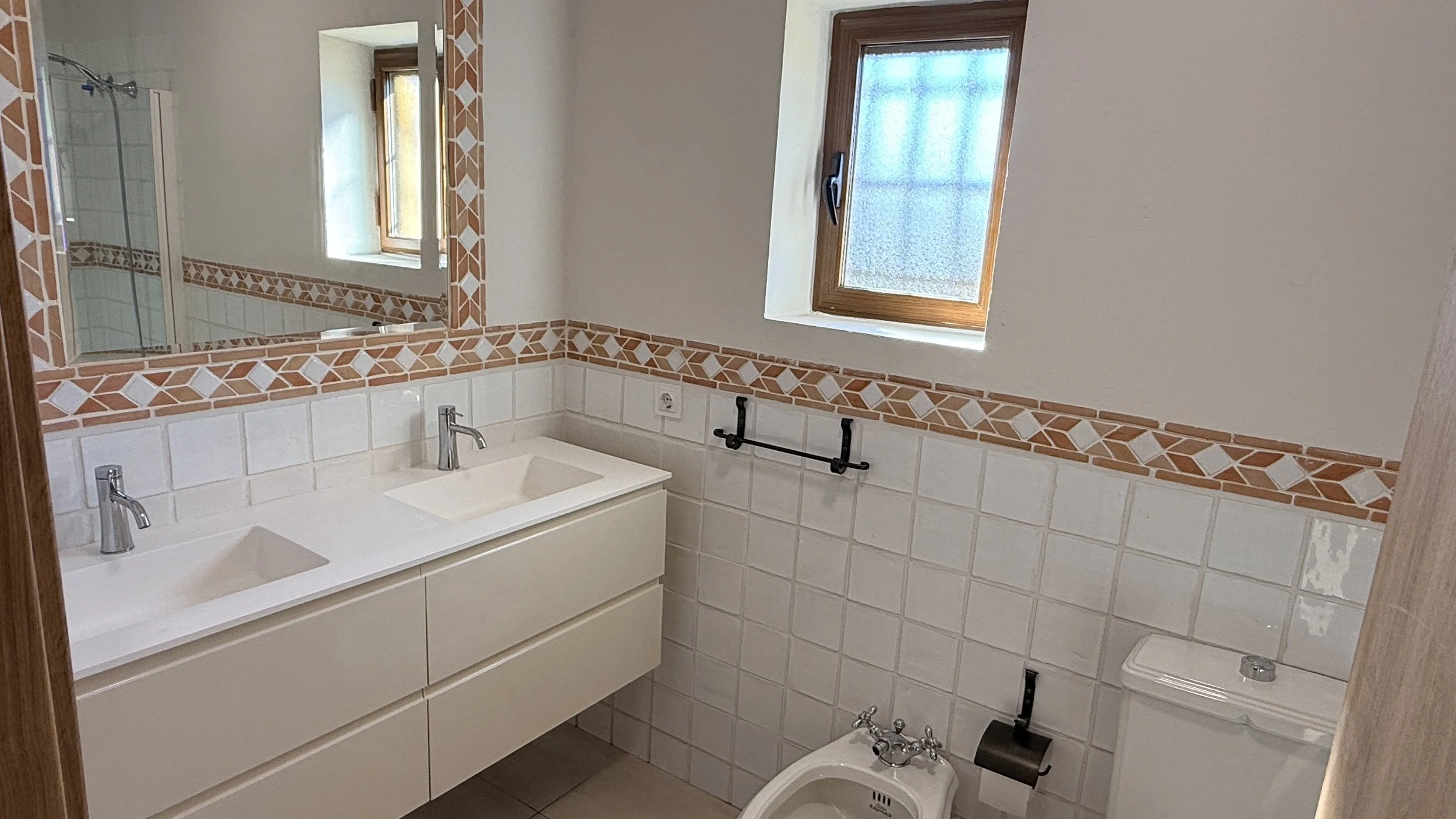 On the ground floor, you'll find a living/dining area with an open fireplace, a fitted kitchen, a washroom, two bedrooms (one currently serving as an office), and a family bathroom. Upstairs, two spacious double bedrooms each offer en-suite bathrooms with upgraded sinks. The master bedroom includes double doors leading out to a large terrace—a peaceful, private spot for enjoying tranquil views.