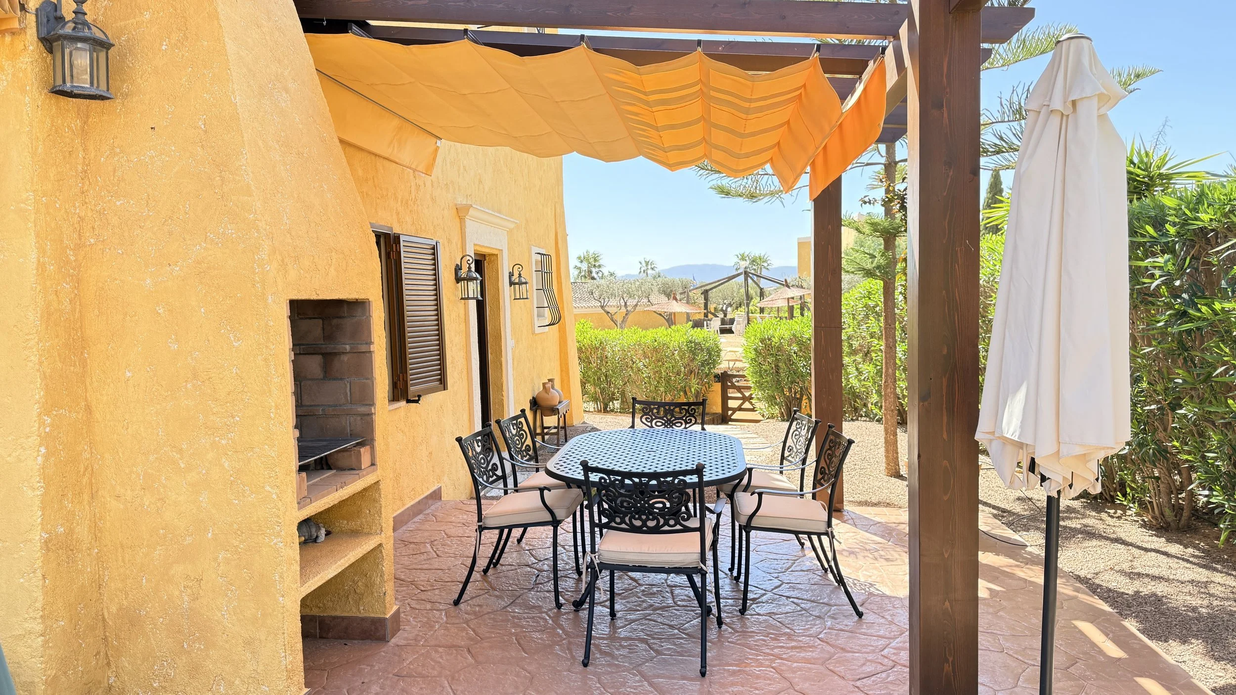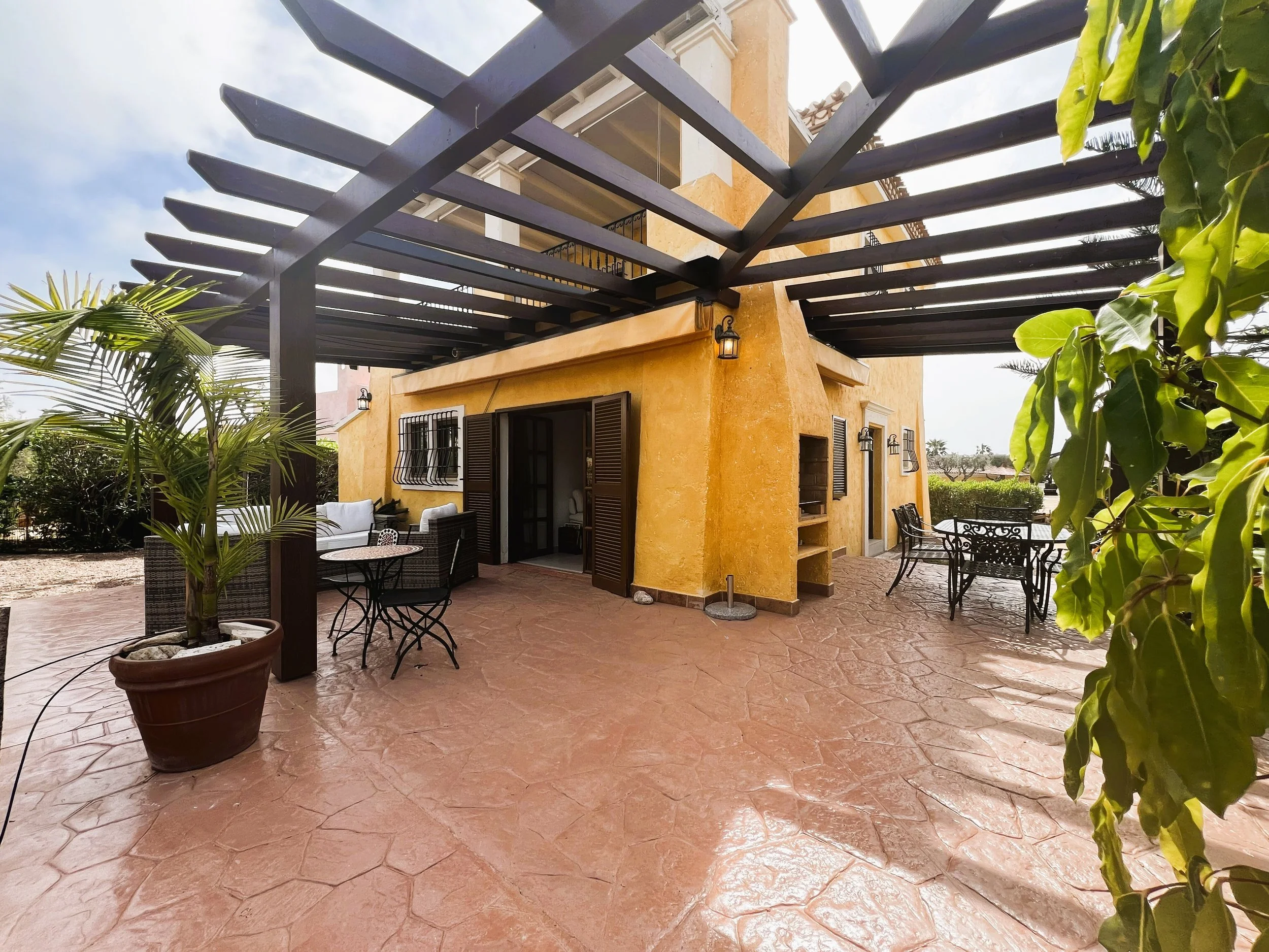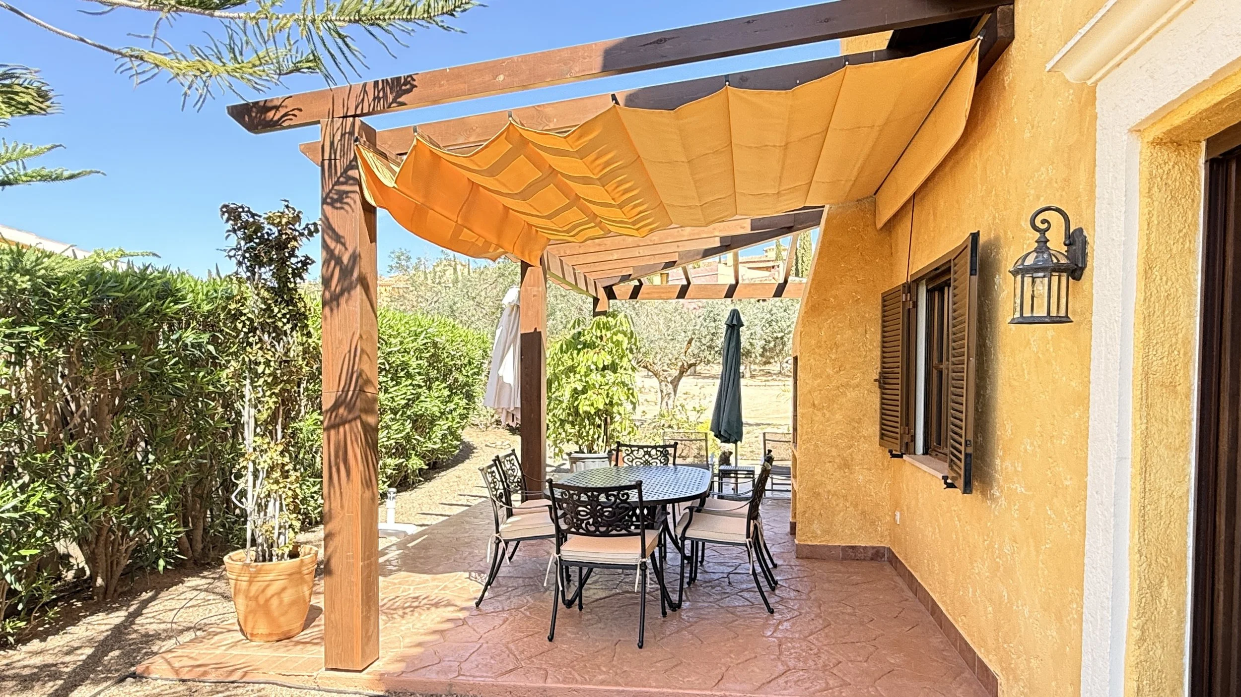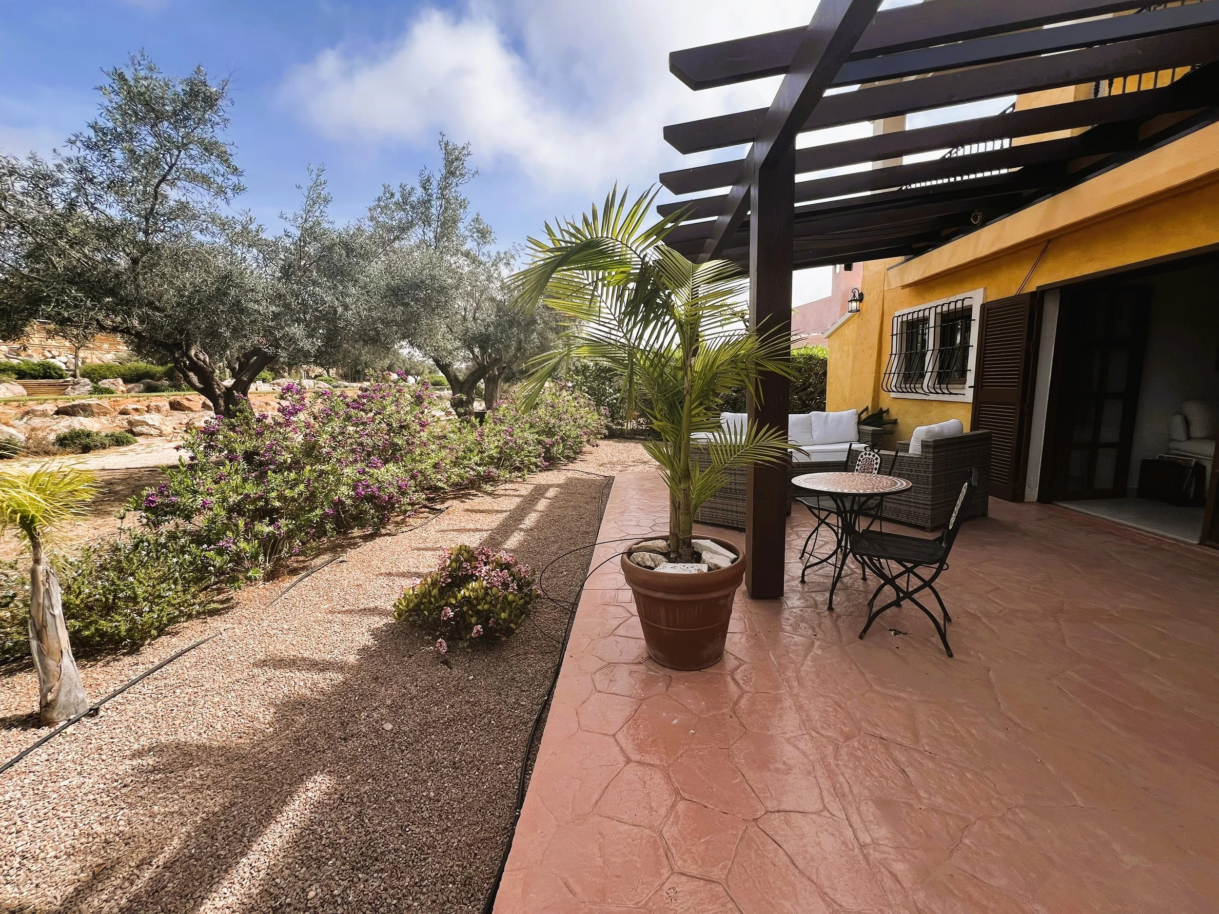 Entering through the garden gate, which sits beside the newly renovated and well-kept communal swimming pool in the welcoming La Rosa community, you'll find an easy-to-care-for garden. A pathway leads to the main entrance of this detached villa, surrounded by a wrap-around terrace complete with pergolas and blinds—an ideal complement to an exceptional property boasting charming views over the first tee.