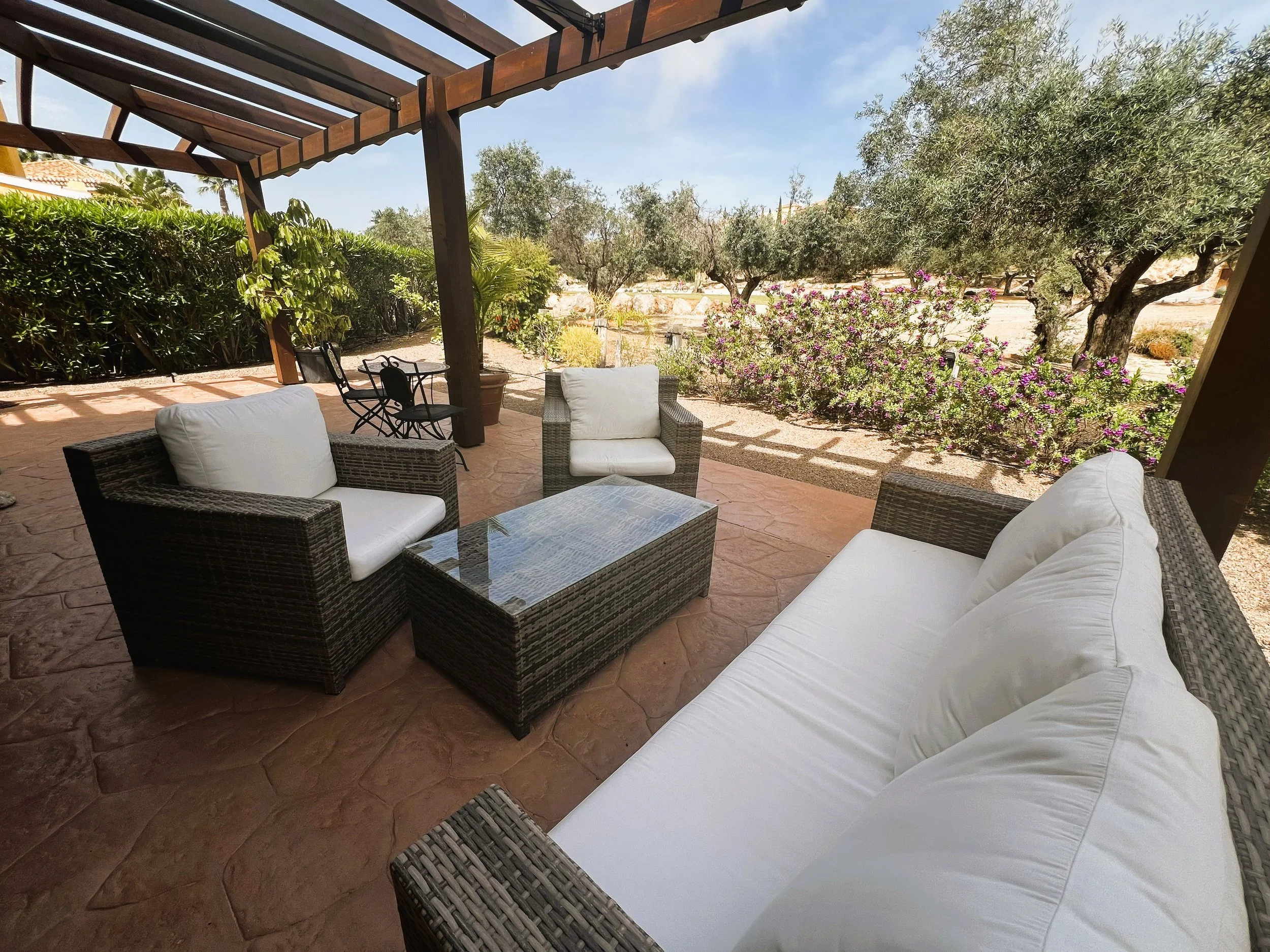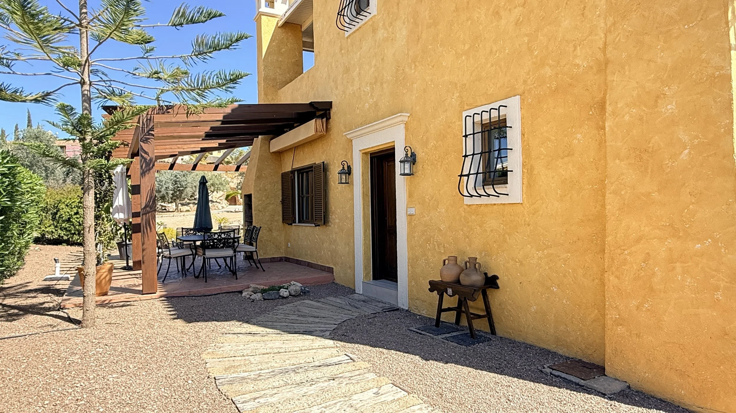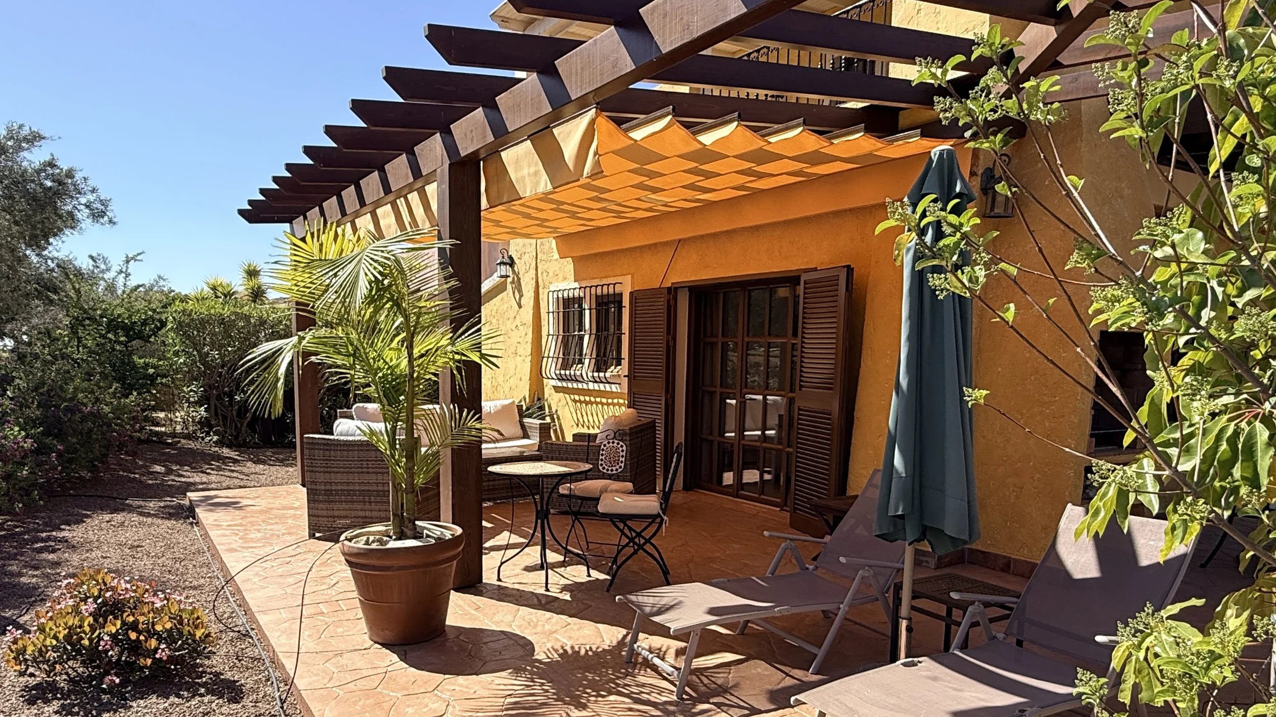 Entering through the garden gate, which sits beside the newly renovated and well-kept communal swimming pool in the welcoming La Rosa community, you'll find an easy-to-care-for garden. A pathway leads to the main entrance of this detached villa, surrounded by a wrap-around terrace complete with pergolas and blinds—an ideal complement to an exceptional property boasting charming views over the first tee.