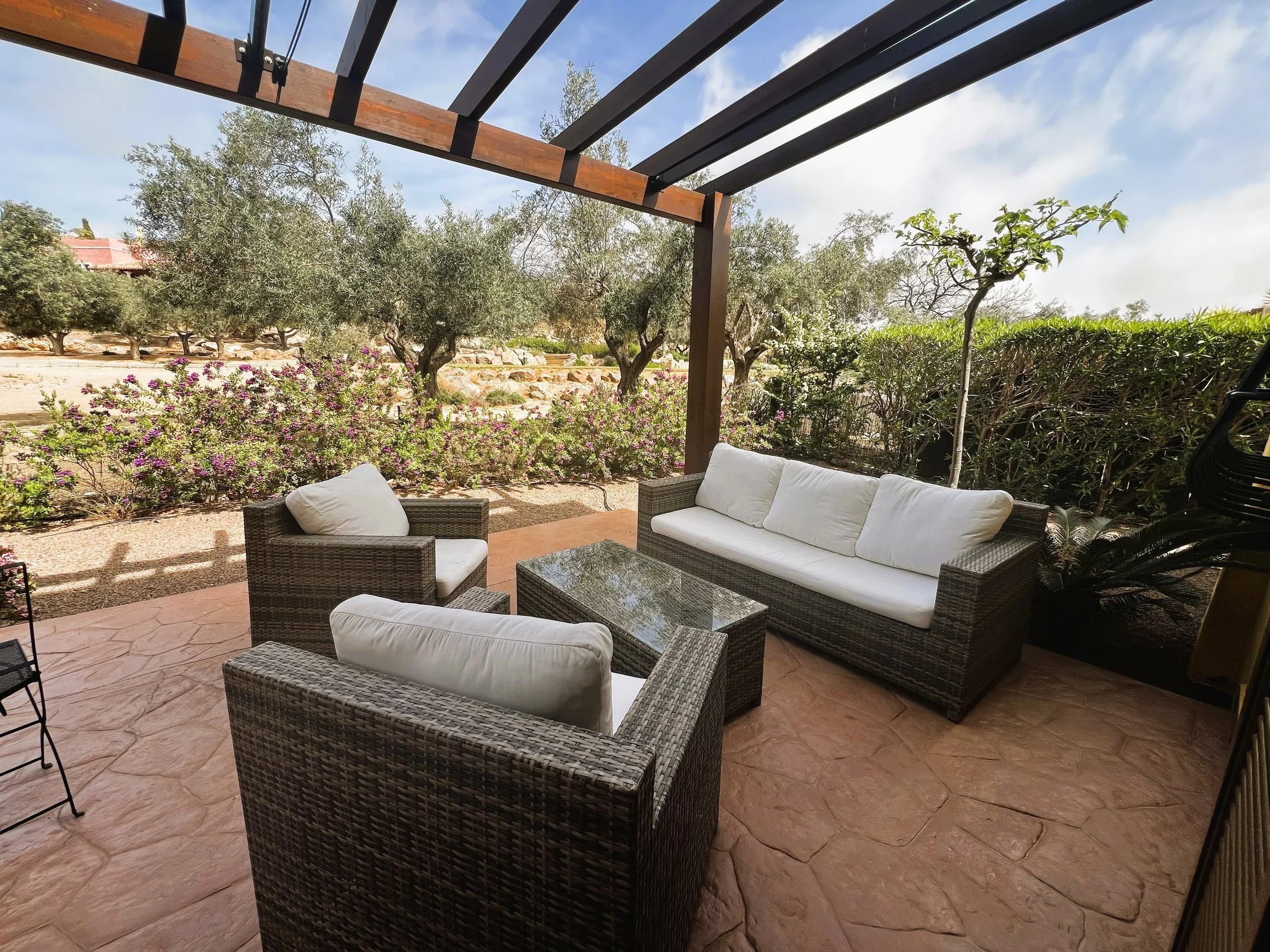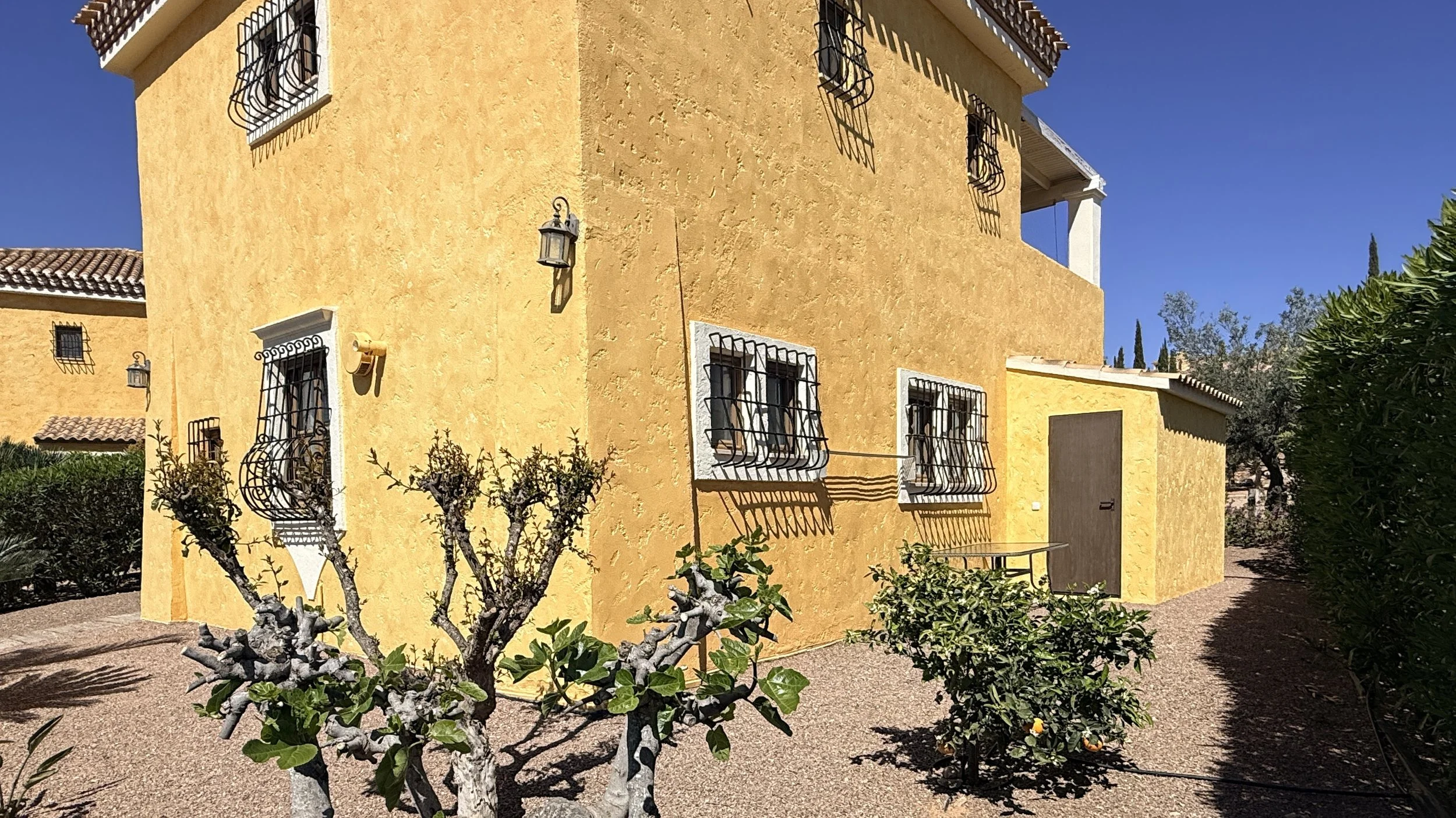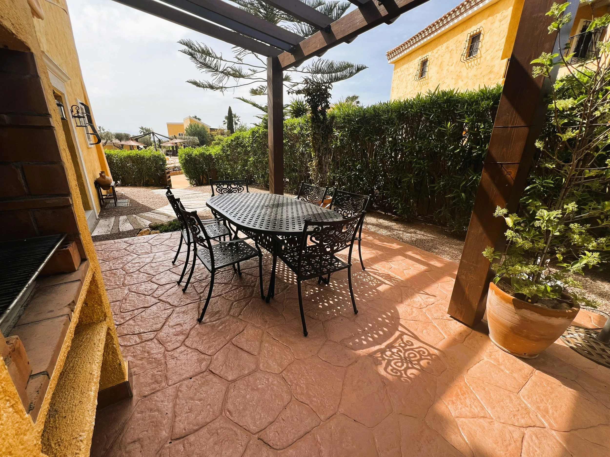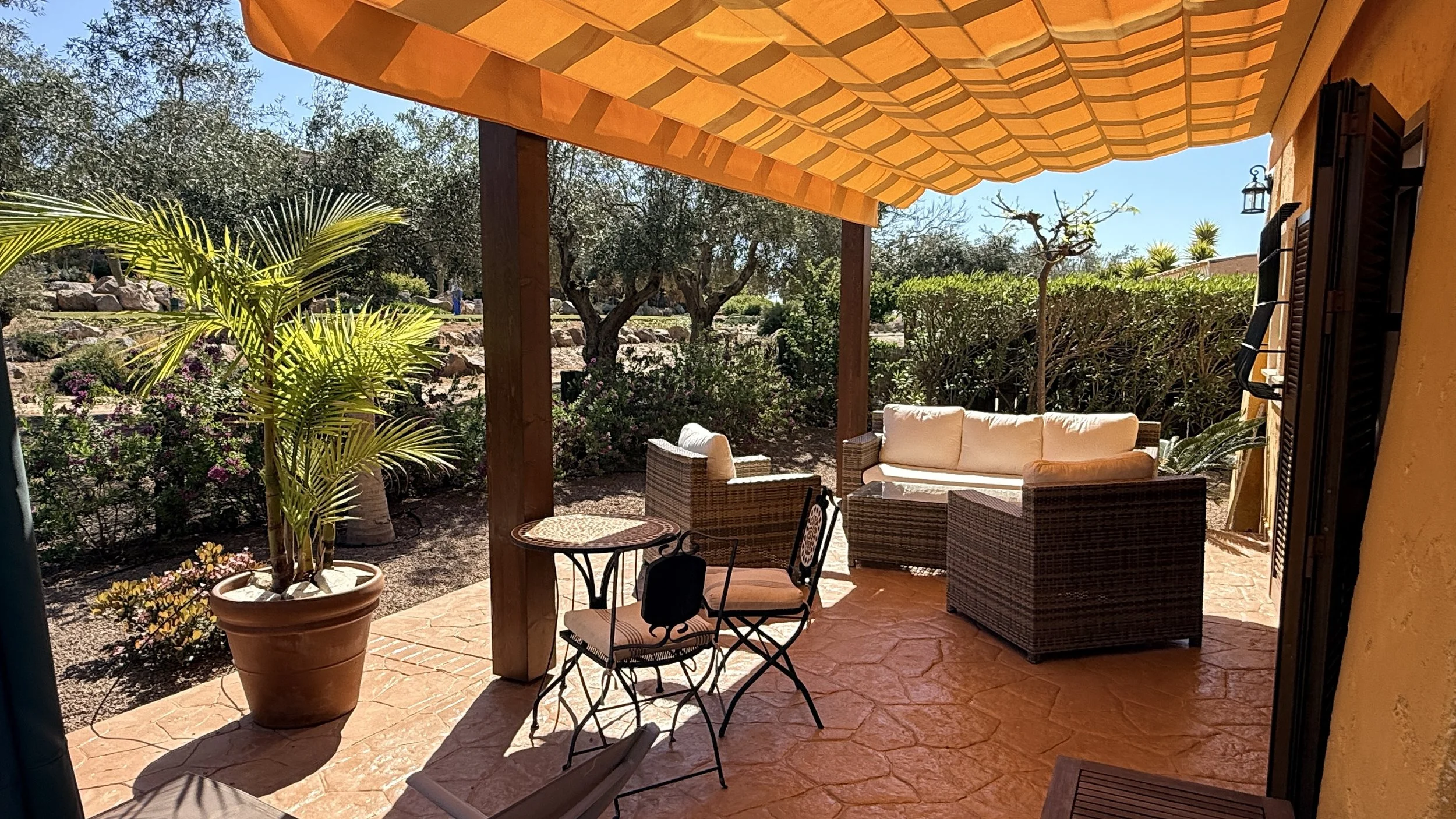 Entering through the garden gate, which sits beside the newly renovated and well-kept communal swimming pool in the welcoming La Rosa community, you'll find an easy-to-care-for garden. A pathway leads to the main entrance of this detached villa, surrounded by a wrap-around terrace complete with pergolas and blinds—an ideal complement to an exceptional property boasting charming views over the first tee.