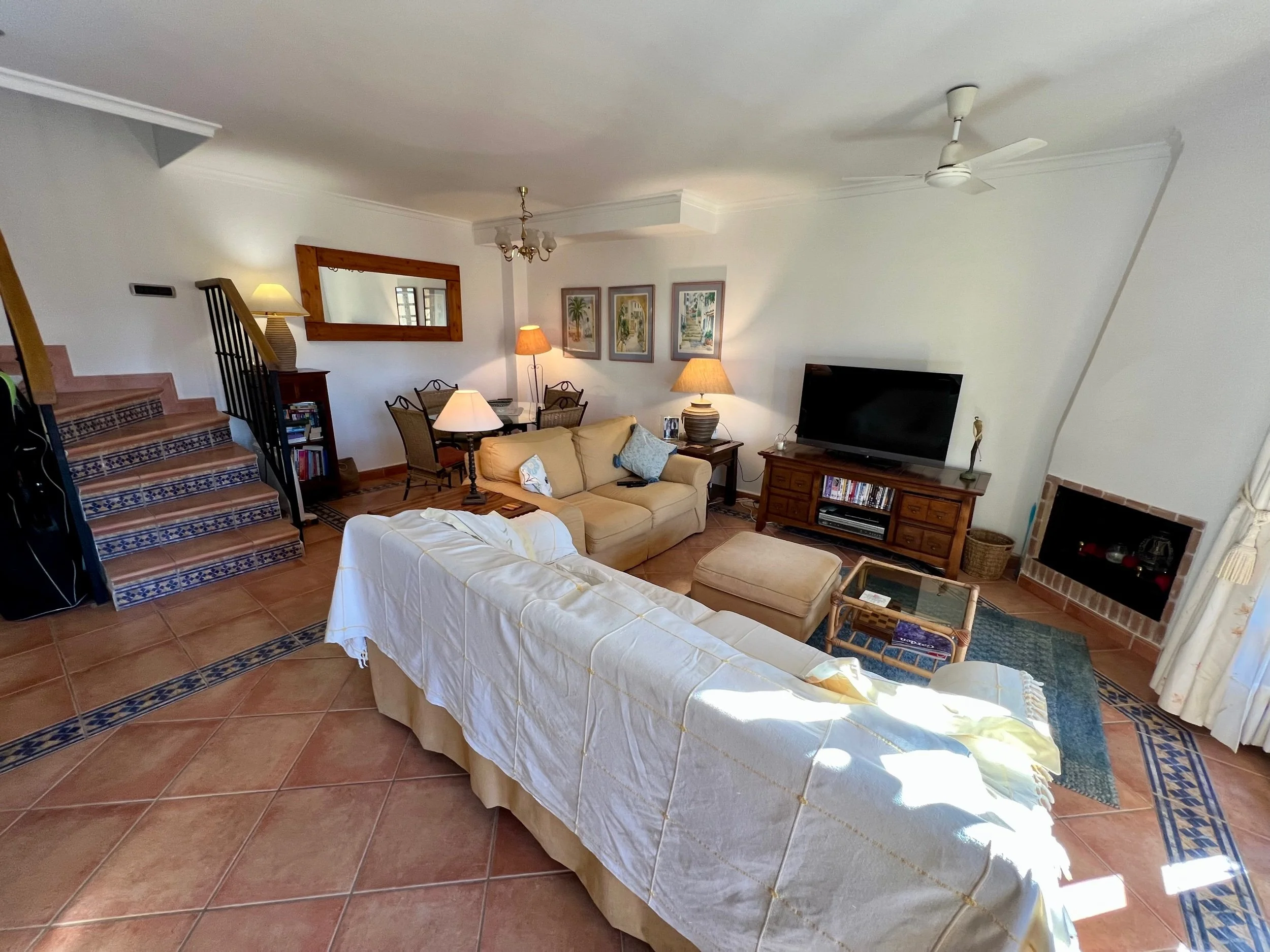 This is a corner end of terraced town house situated in a fantastic position enjoying some spectacular views over the golf course fist and 18th fairways and beyond over the magnificent mountains. The property offers spacious accommodation with terracotta tiled floors with hall and cloakroom, fitted kitchen, large living/dining room with doors to a lovely west facing terrace on the ground floor. The first floor has 3 bedrooms the master with en-suite and private terrace and second shower room. Stairs rise from the landing to the roof solarium with outstanding views.