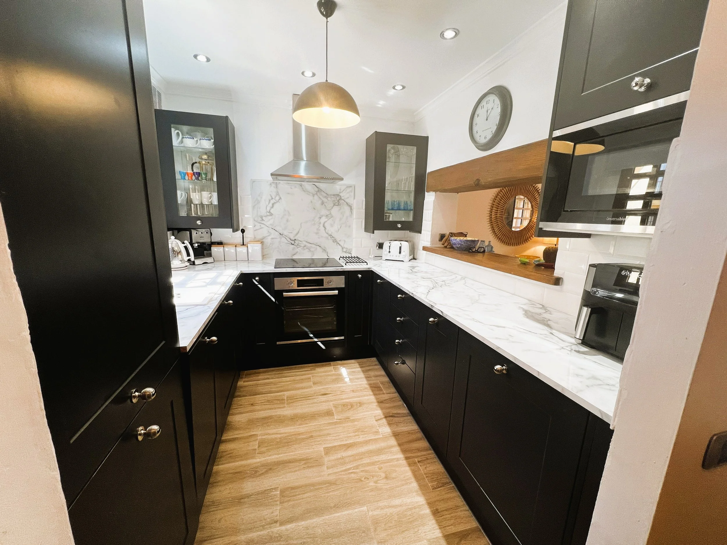 The ground floor includes a welcoming entrance hall and a convenient cloakroom. The spacious living and dining room is enhanced by a wood-burning stove, creating a cosy atmosphere. Adjacent to this is a fully fitted and redesigned kitchen, providing practicality and style that includes a dishwasher, extra storage cupboards and a lovely marble worksurface.