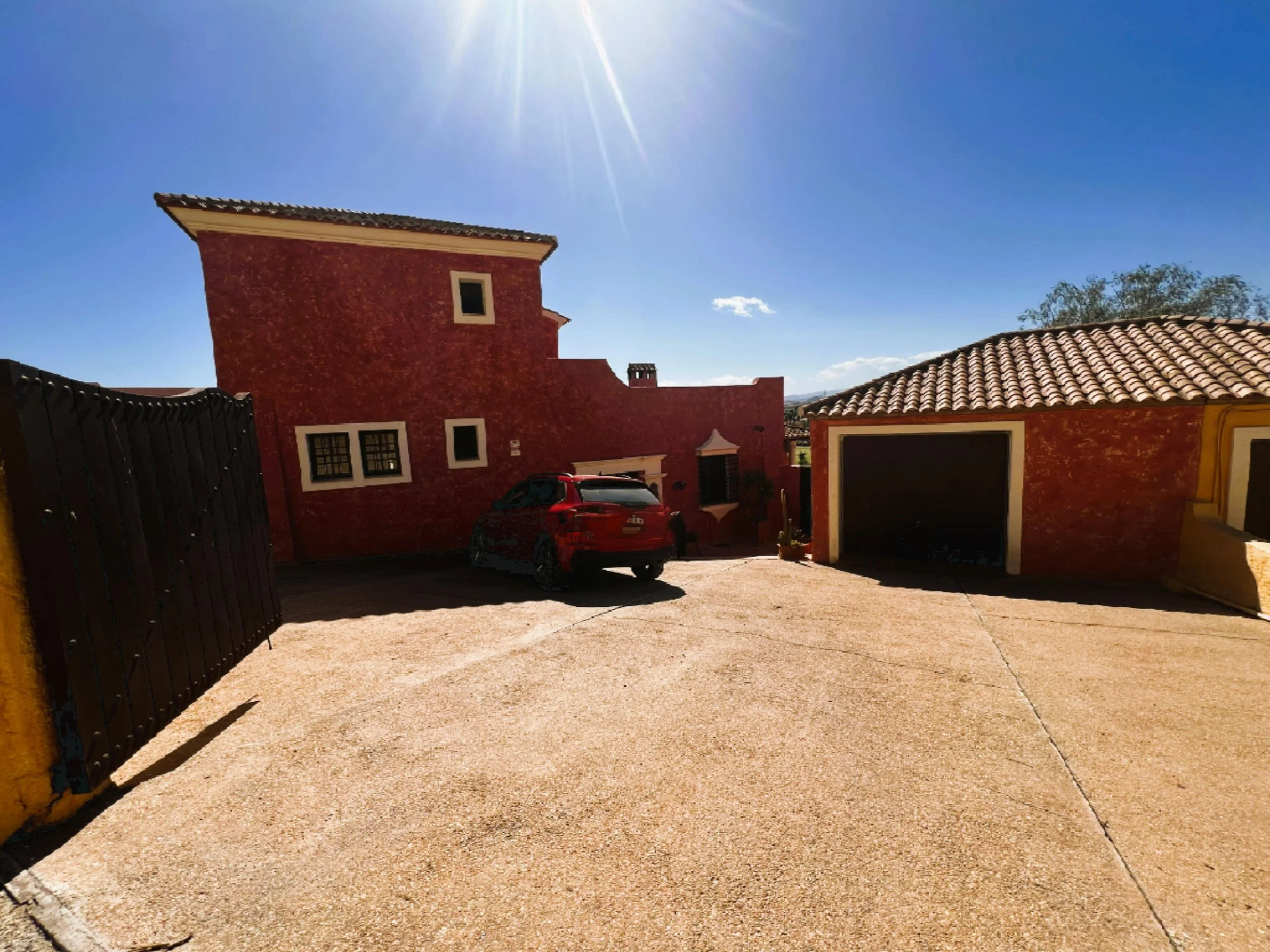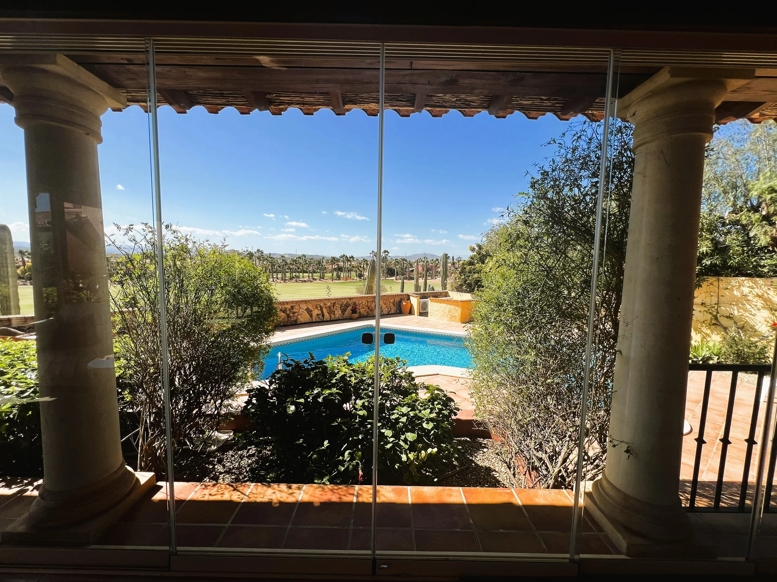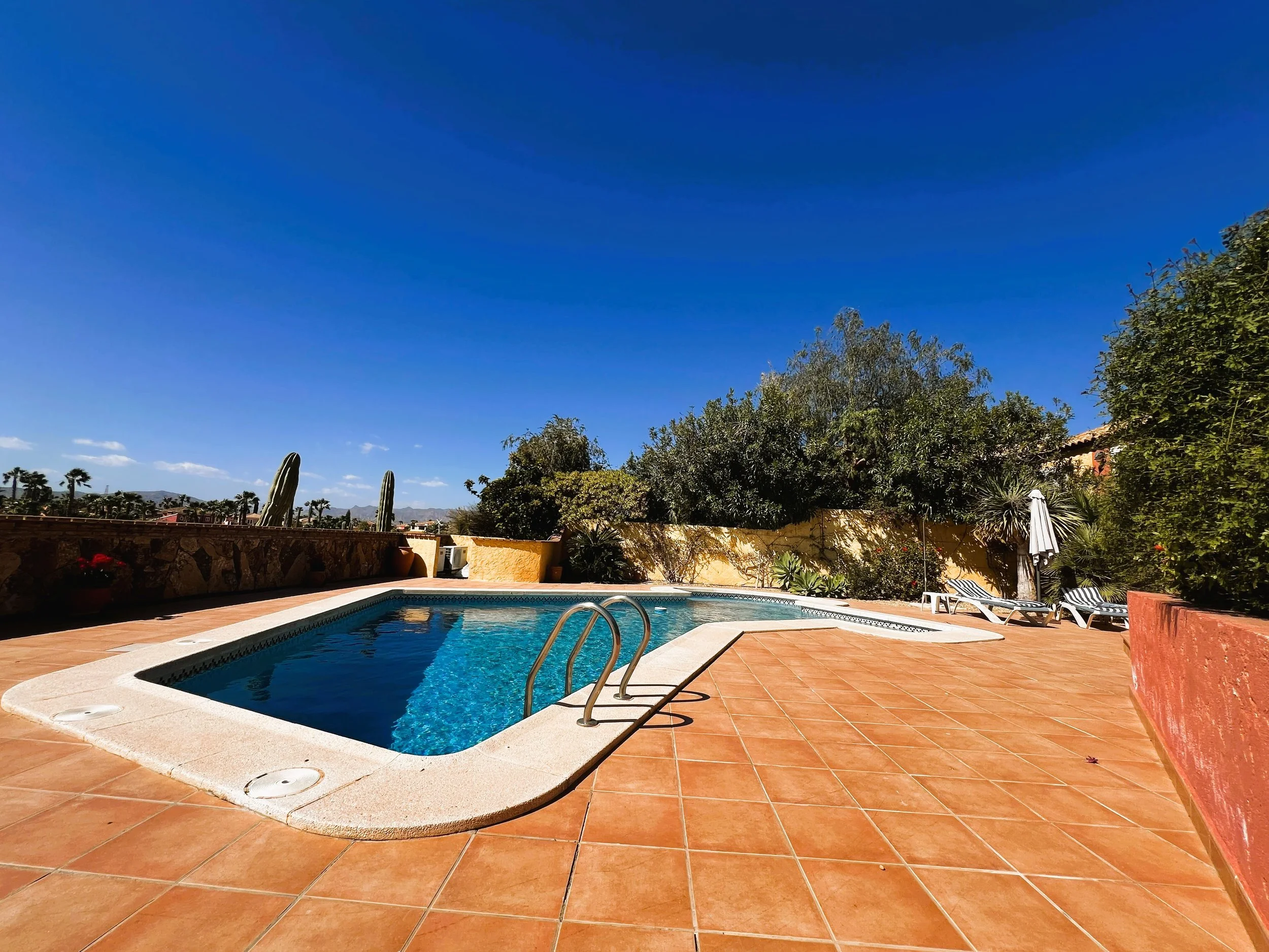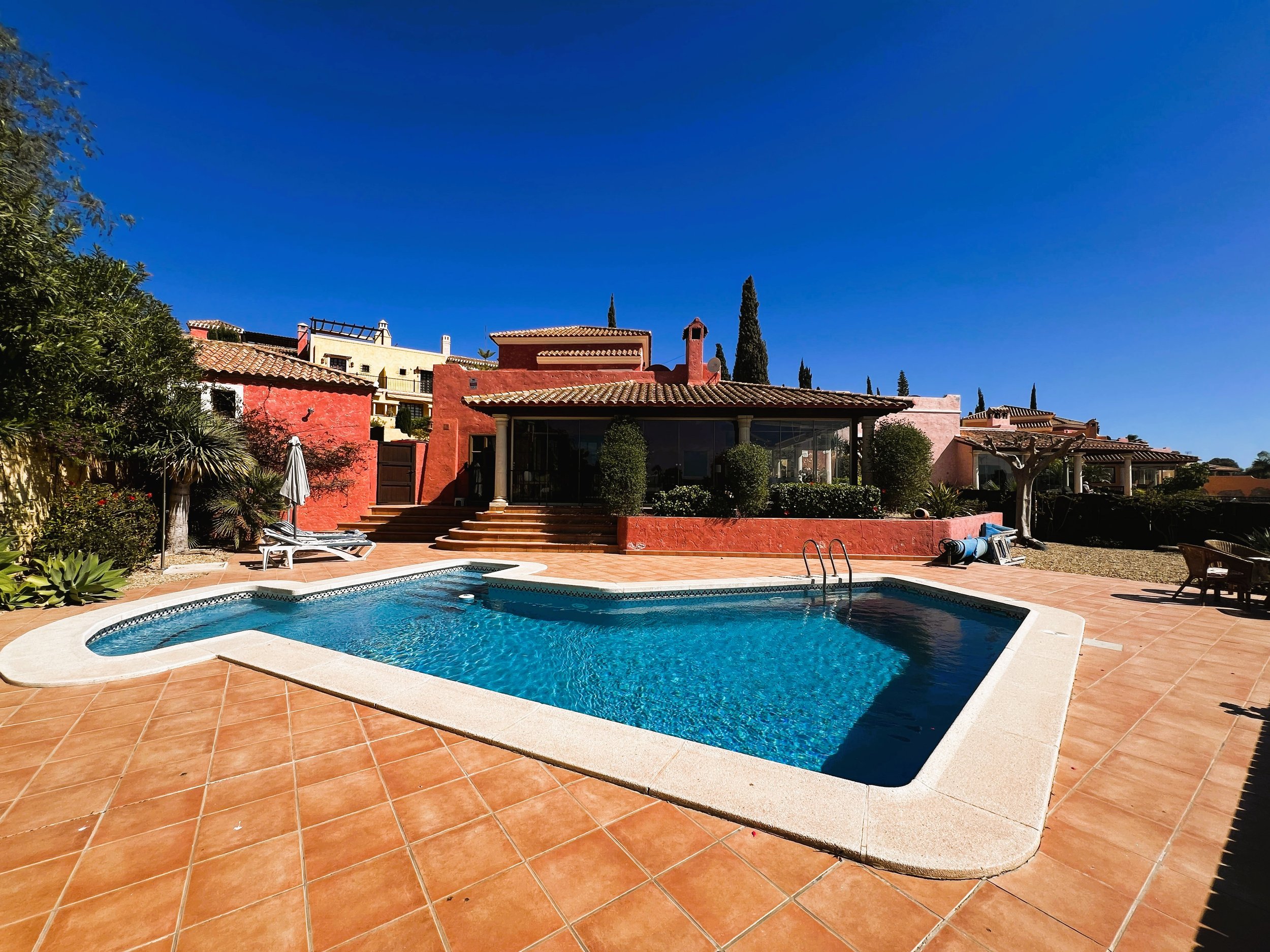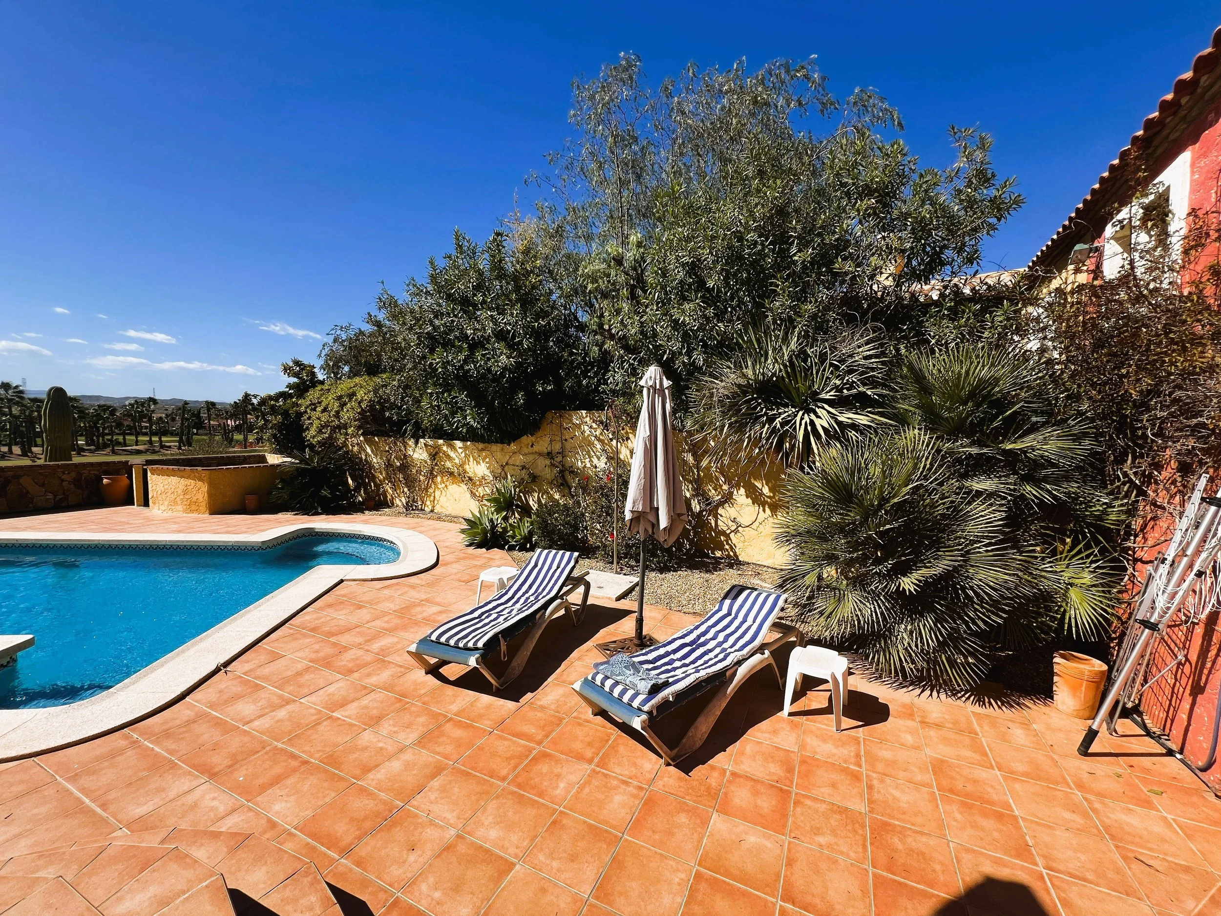 The double garage provides ample parking and storage space for bikes, golf clubs, and other sports equipment. Mature, well-planned gardens with fruit trees surround the property, enhancing the setting. A sizeable pool overlooks the golf course and is complemented by spacious sunbathing and relaxation zones. At the front, there is parking for several vehicles and a driveway leading to both the main entrance and the garage.