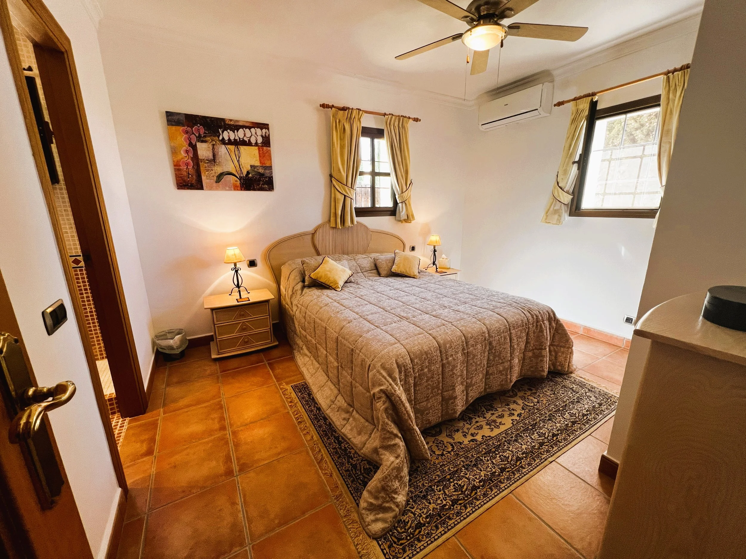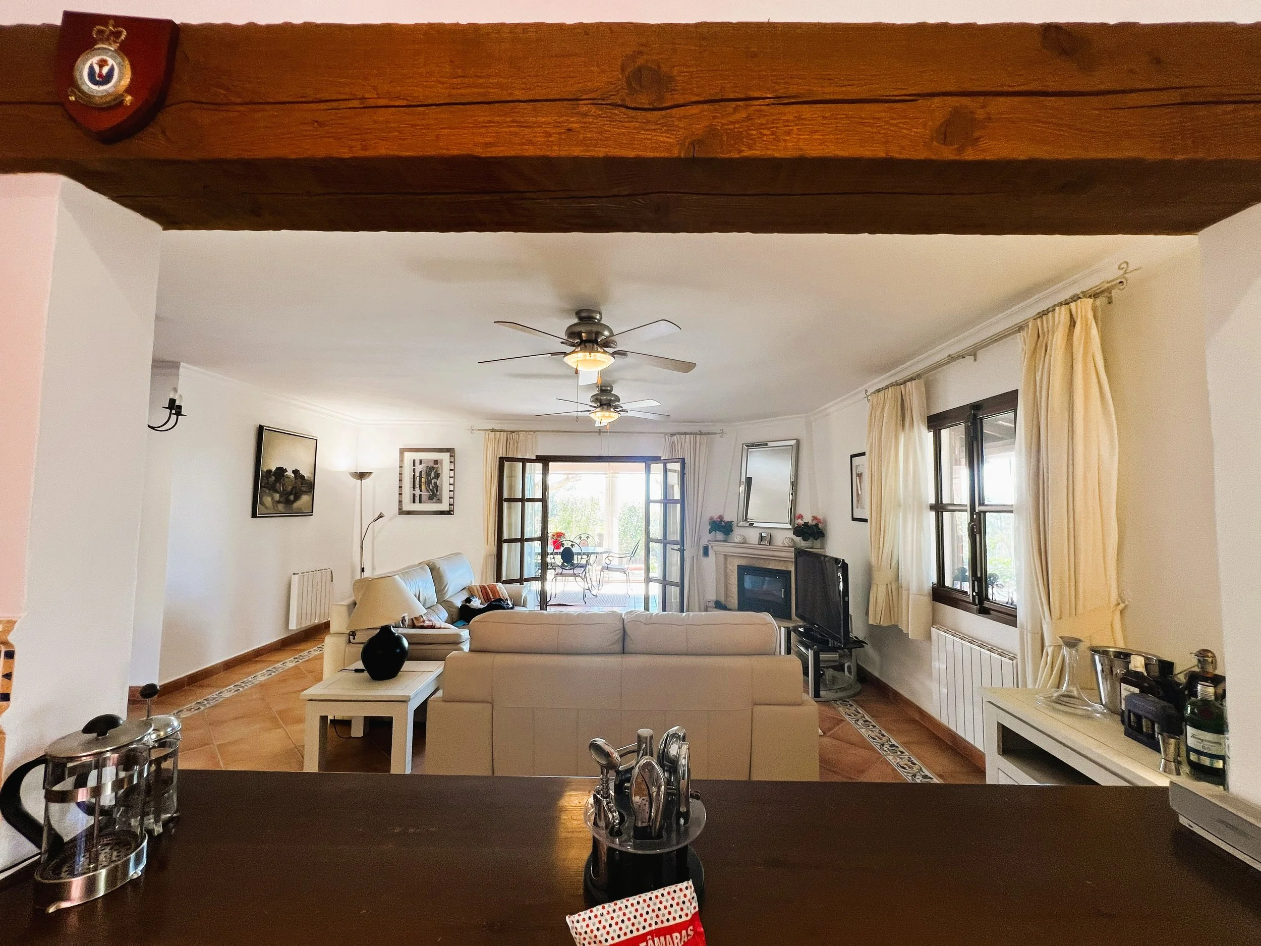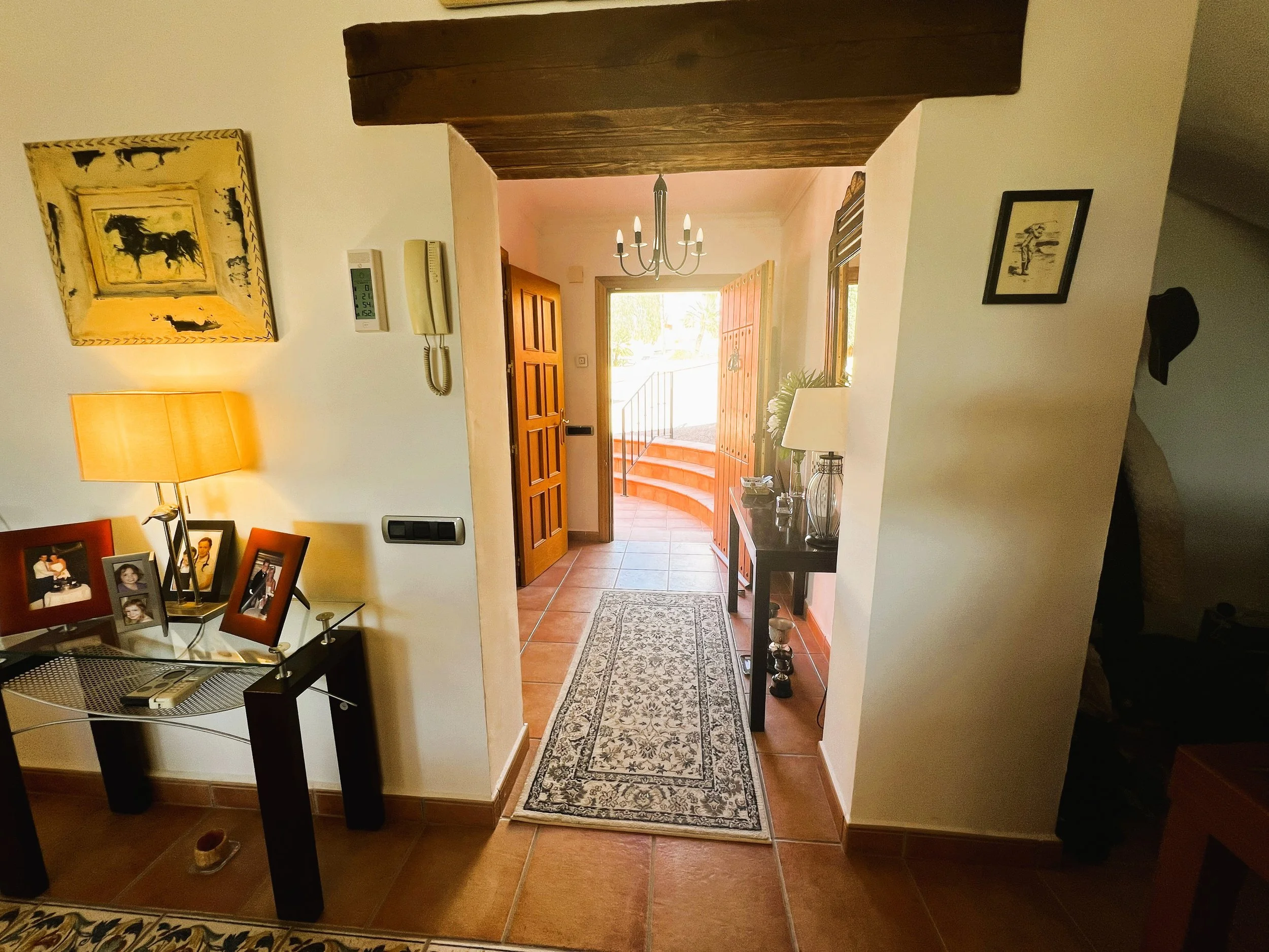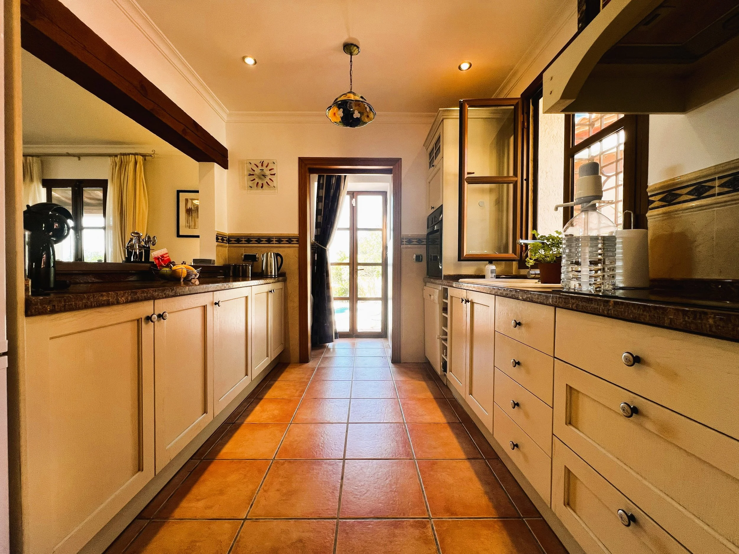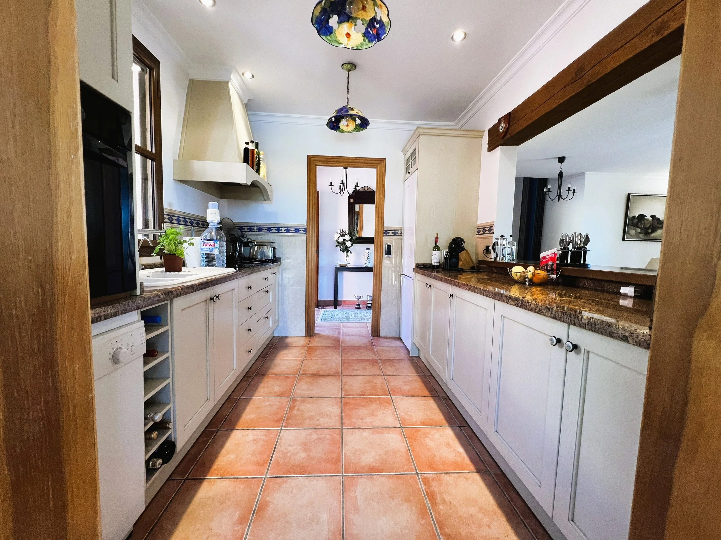 The villa provides superior accommodation, beginning with a welcoming hall and an extended living and dining area on the ground floor, complete with a cosy log burner. The semi-open plan kitchen is accessible via a substantial serving hatch and has been tastefully renovated to include ample storage, an impressive range cooker and a large American refrigerator. This space leads to a generous utility area and offers direct access into a breakfast room, which connects to an additional dining room.