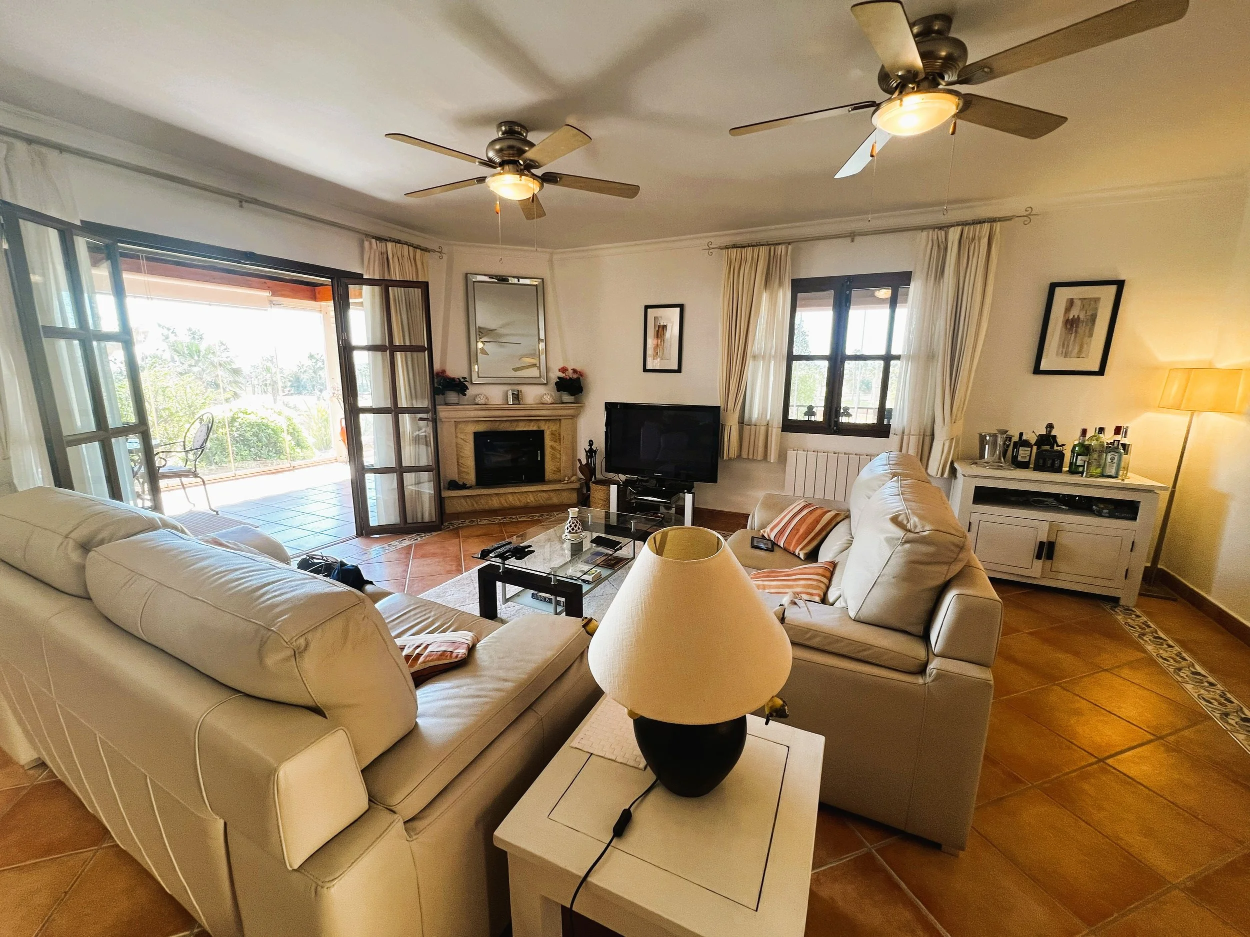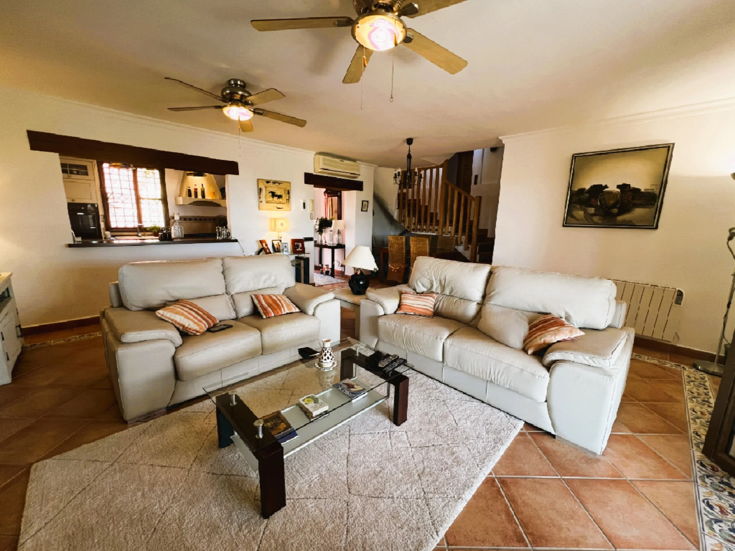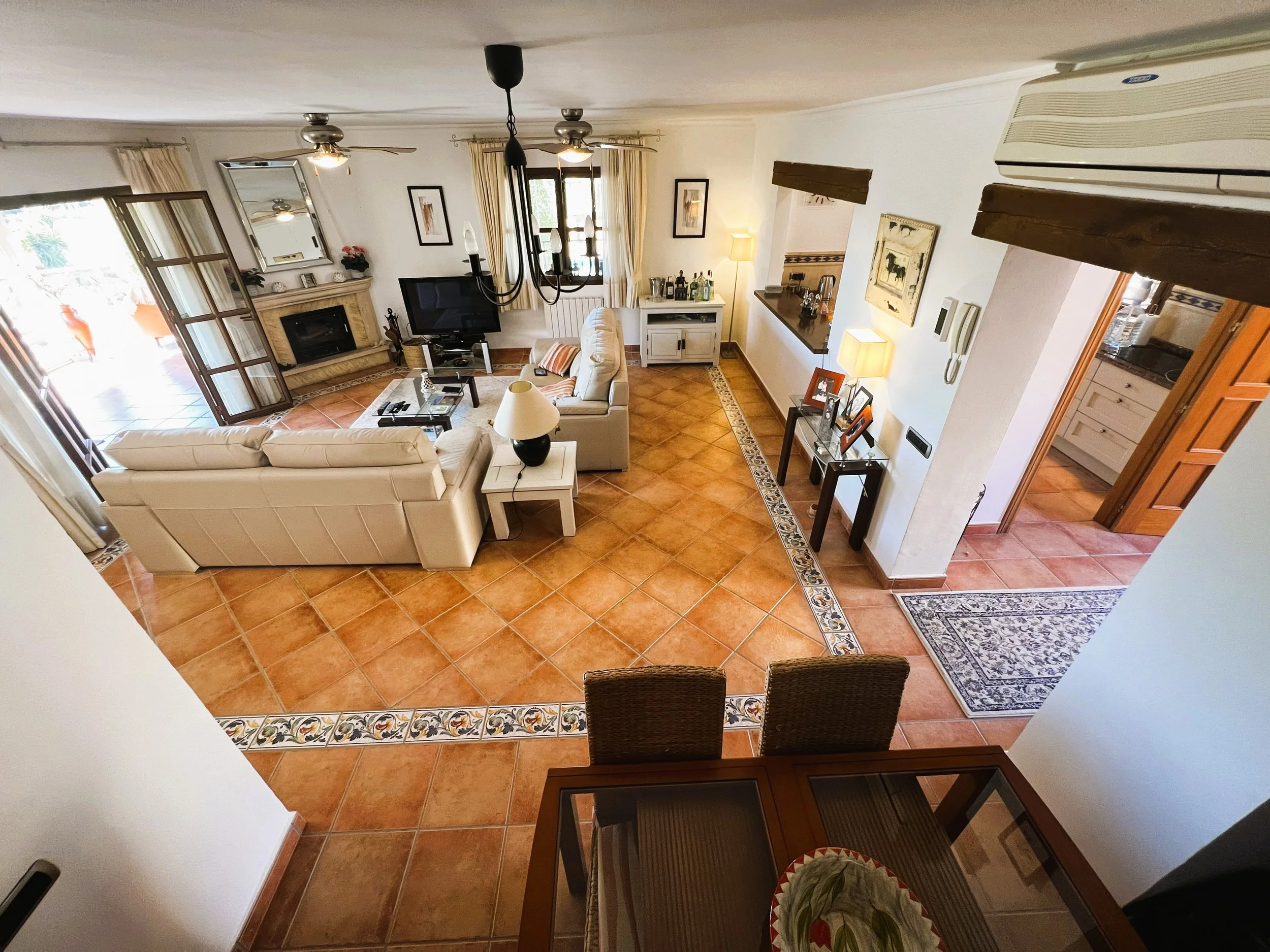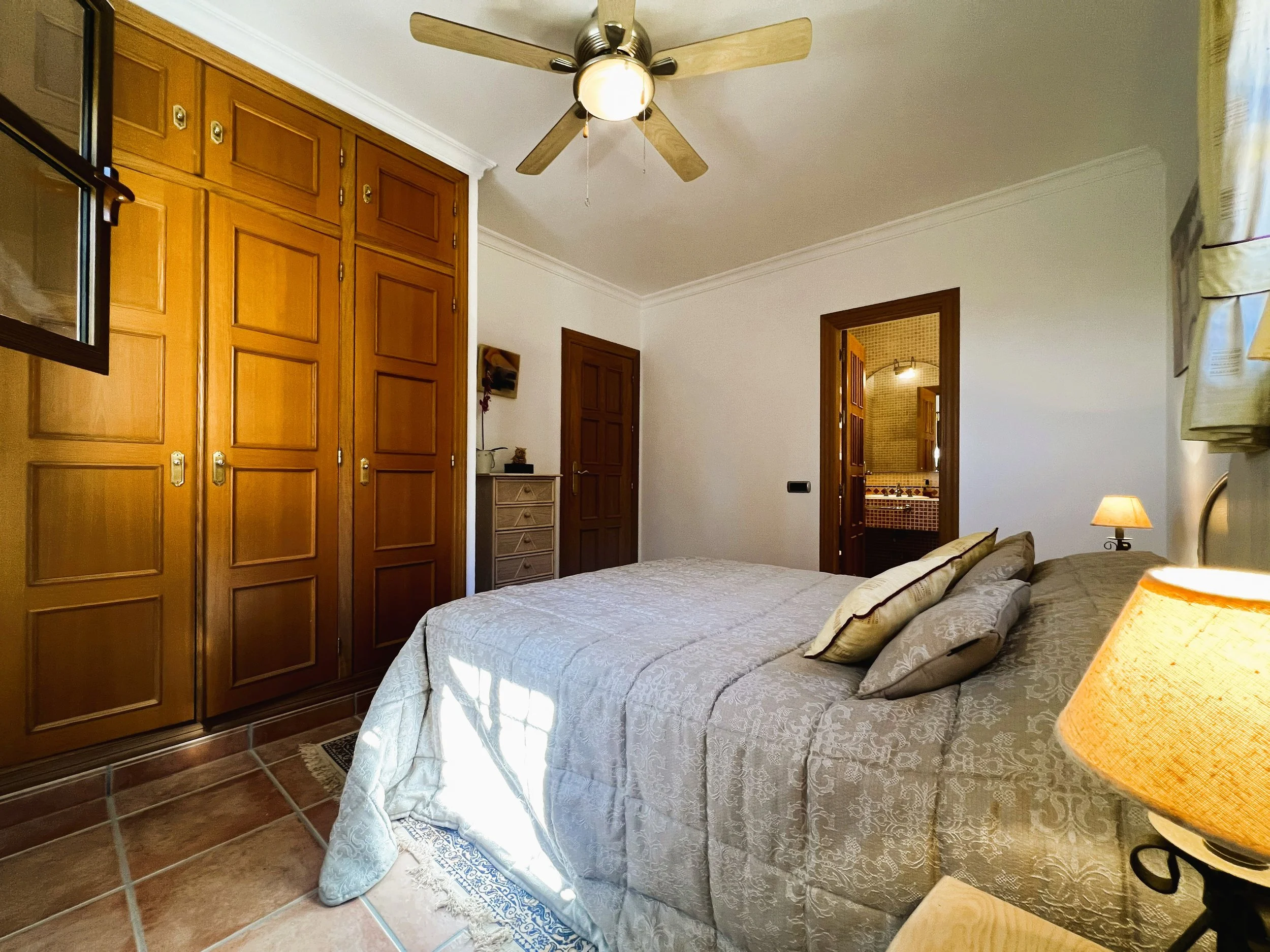 The villa provides superior accommodation, beginning with a welcoming hall and an extended living and dining area on the ground floor, complete with a cosy log burner. The semi-open plan kitchen is accessible via a substantial serving hatch and has been tastefully renovated to include ample storage, an impressive range cooker and a large American refrigerator. This space leads to a generous utility area and offers direct access into a breakfast room, which connects to an additional dining room.