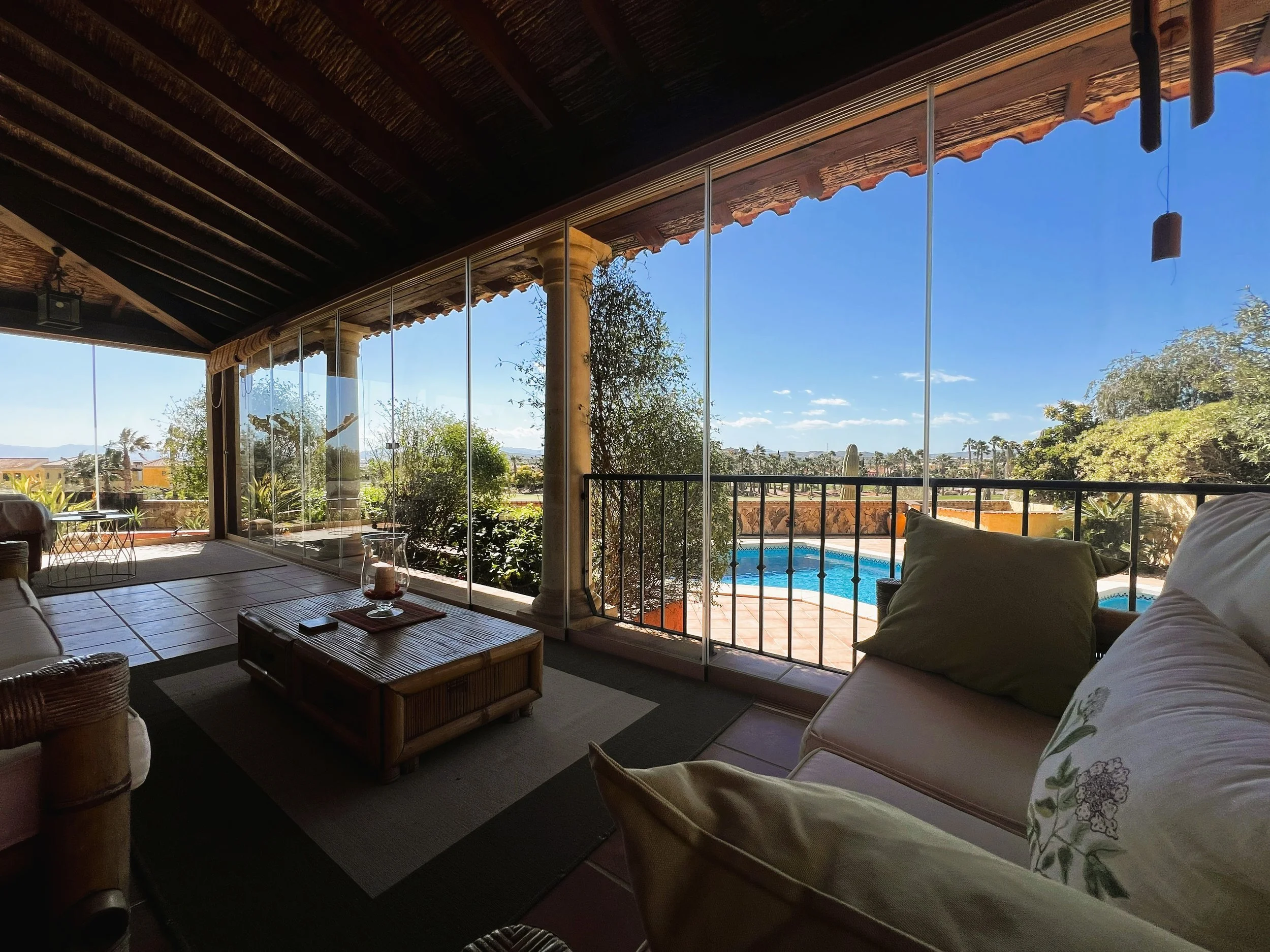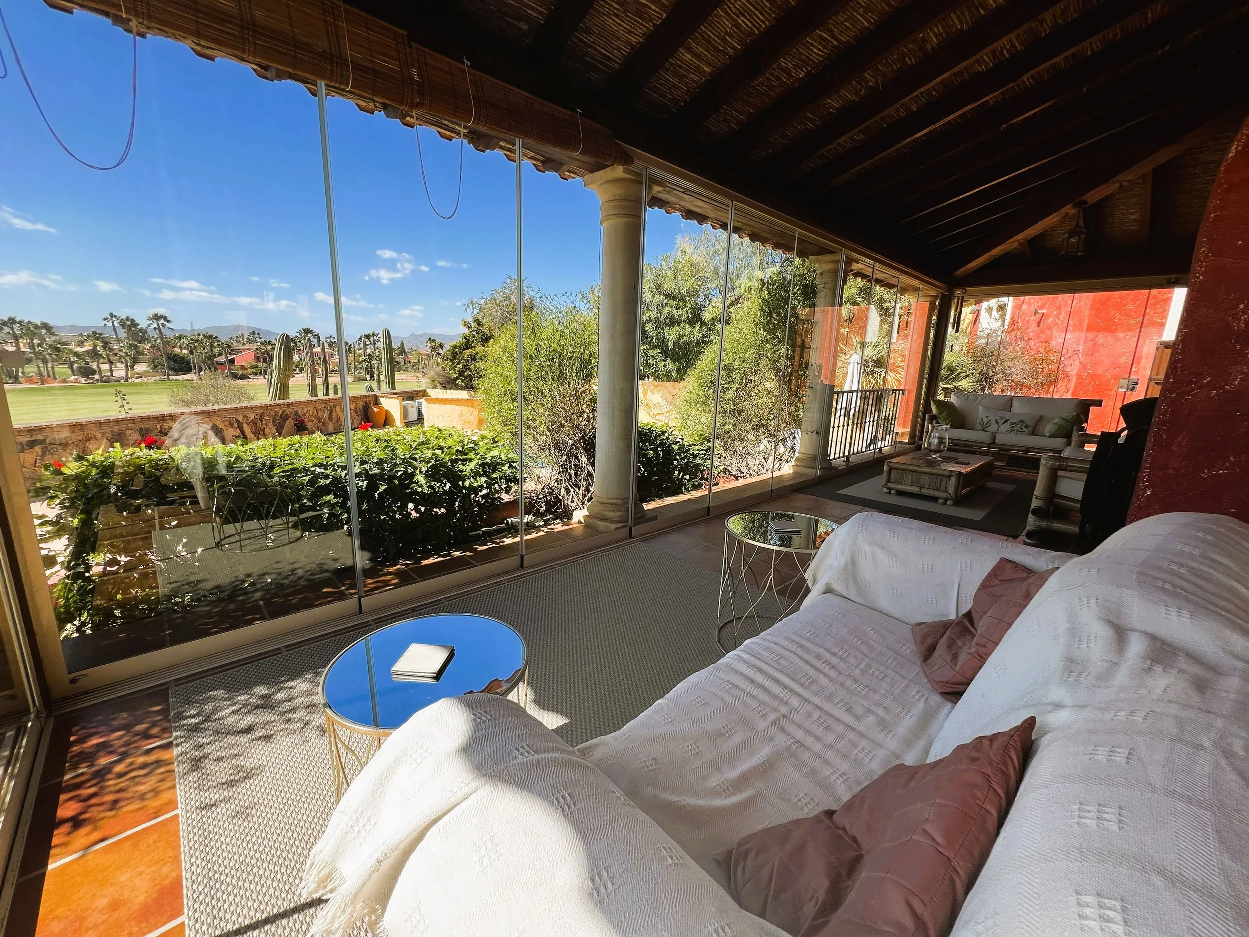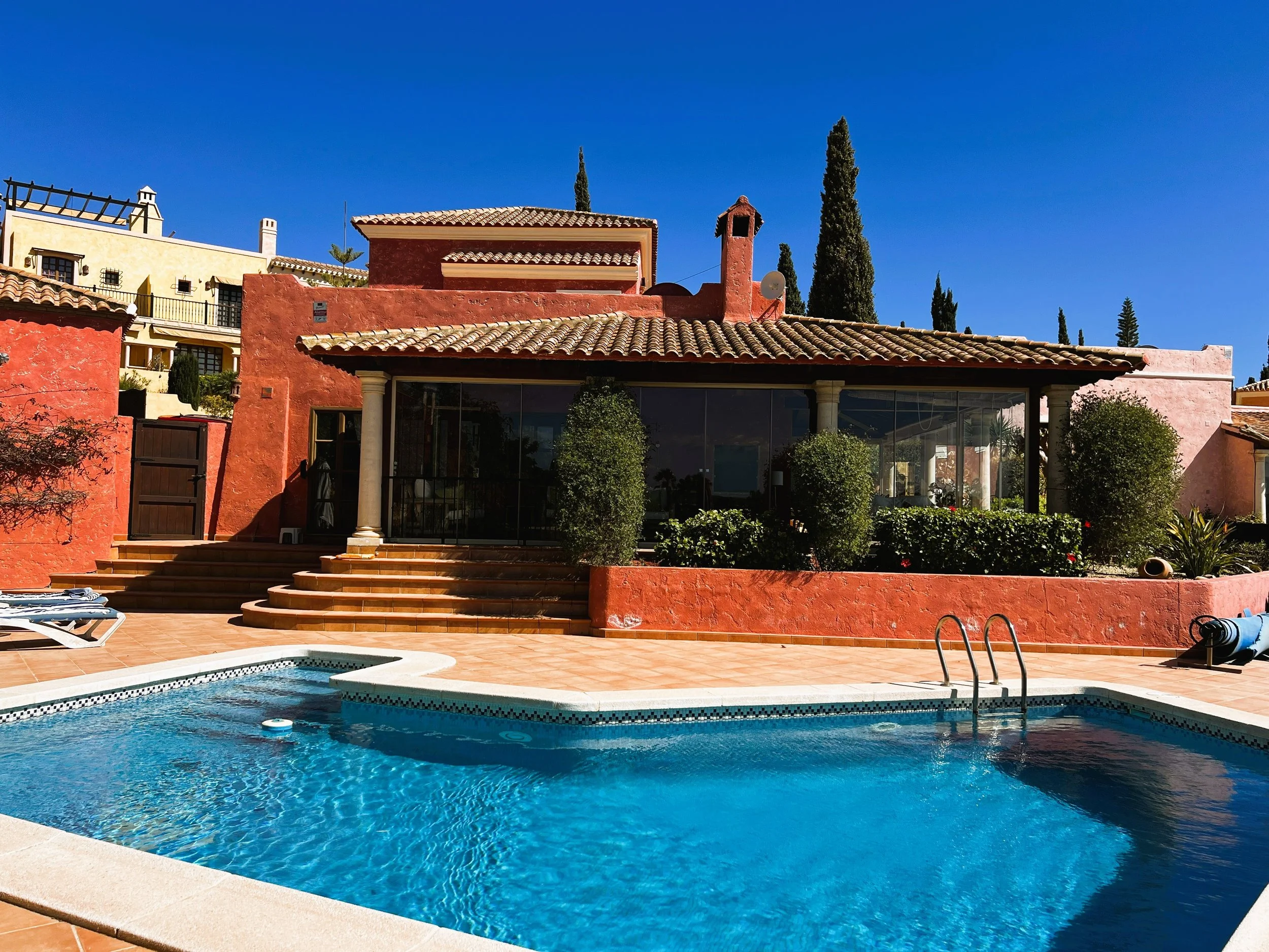 Folding doors open into a beautifully bright and airy sunroom, featuring double glazing and sliding doors. These lead onto a meticulously maintained terrace, which provides impressive views of the pool, garden, and adjacent golf course. There is a hot tub to enjoy leisurely moments after a round of golf. The property comprises four bedrooms, including two with ensuite facilities, as well as a family bathroom and an additional washroom.