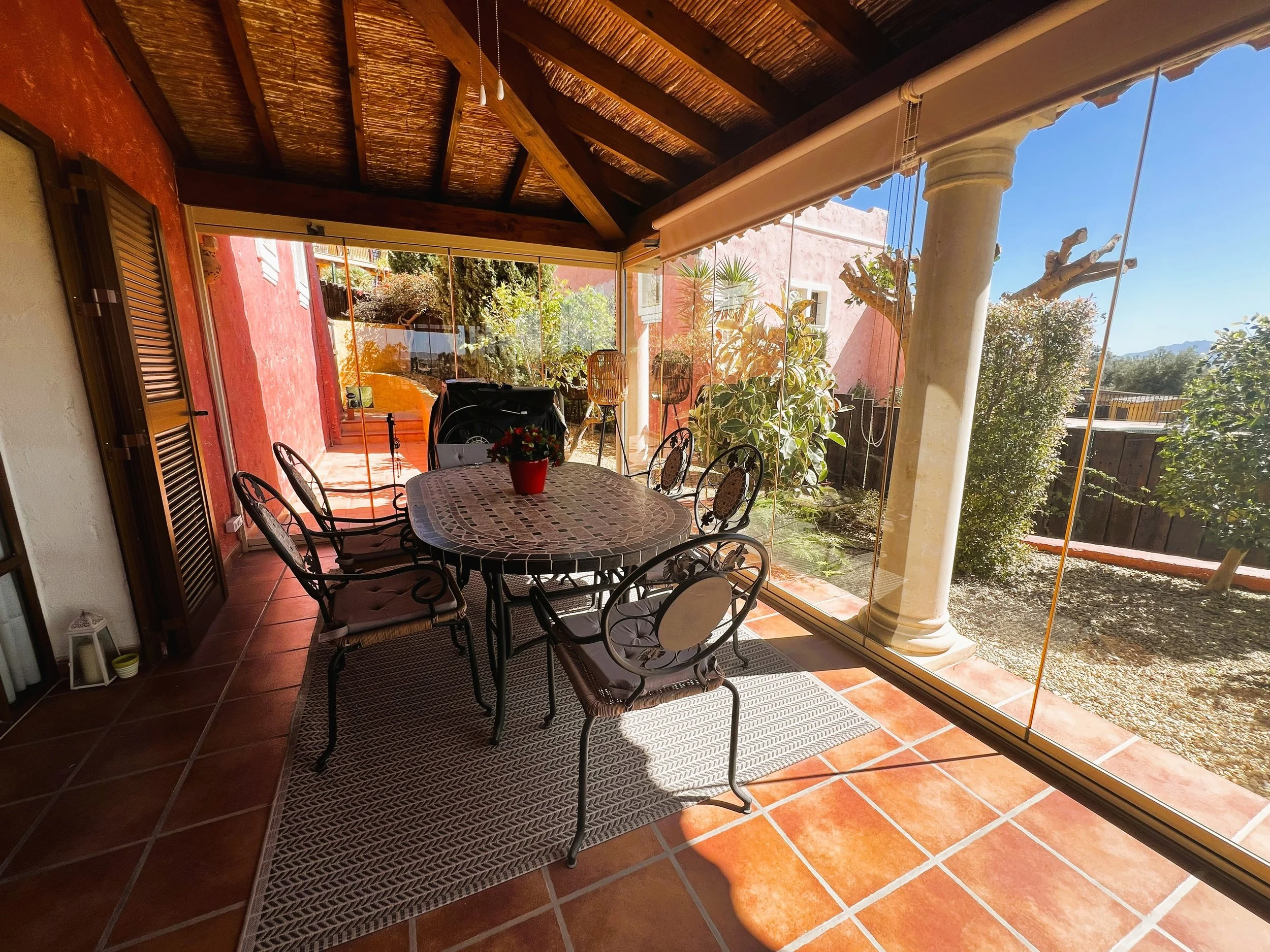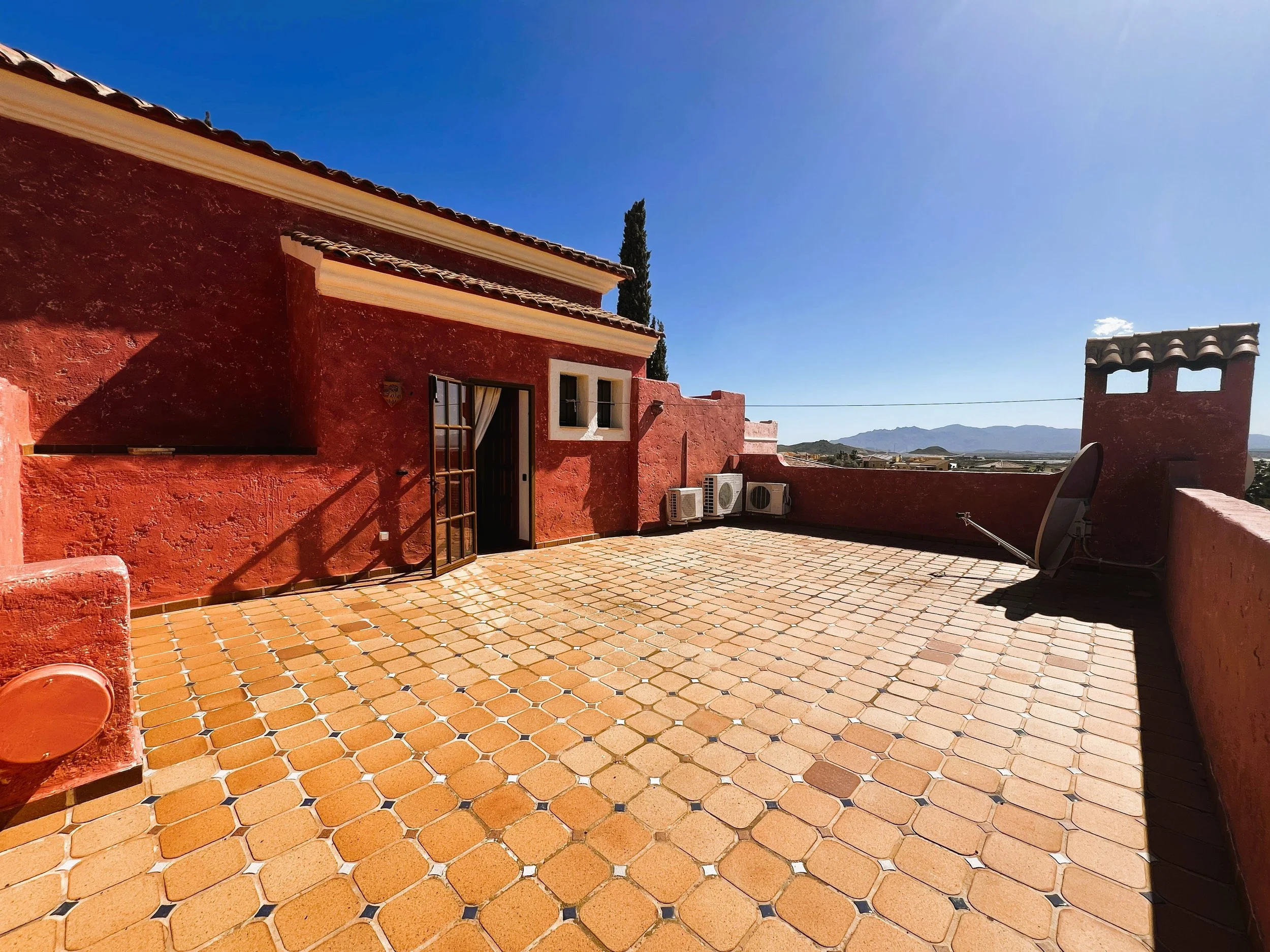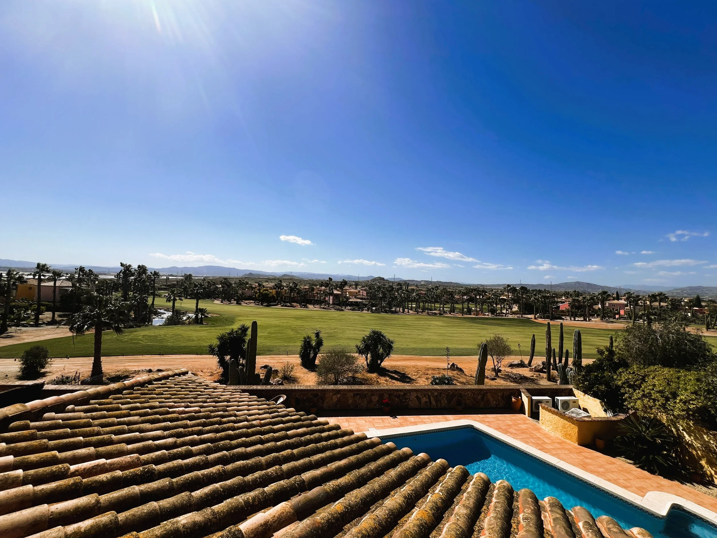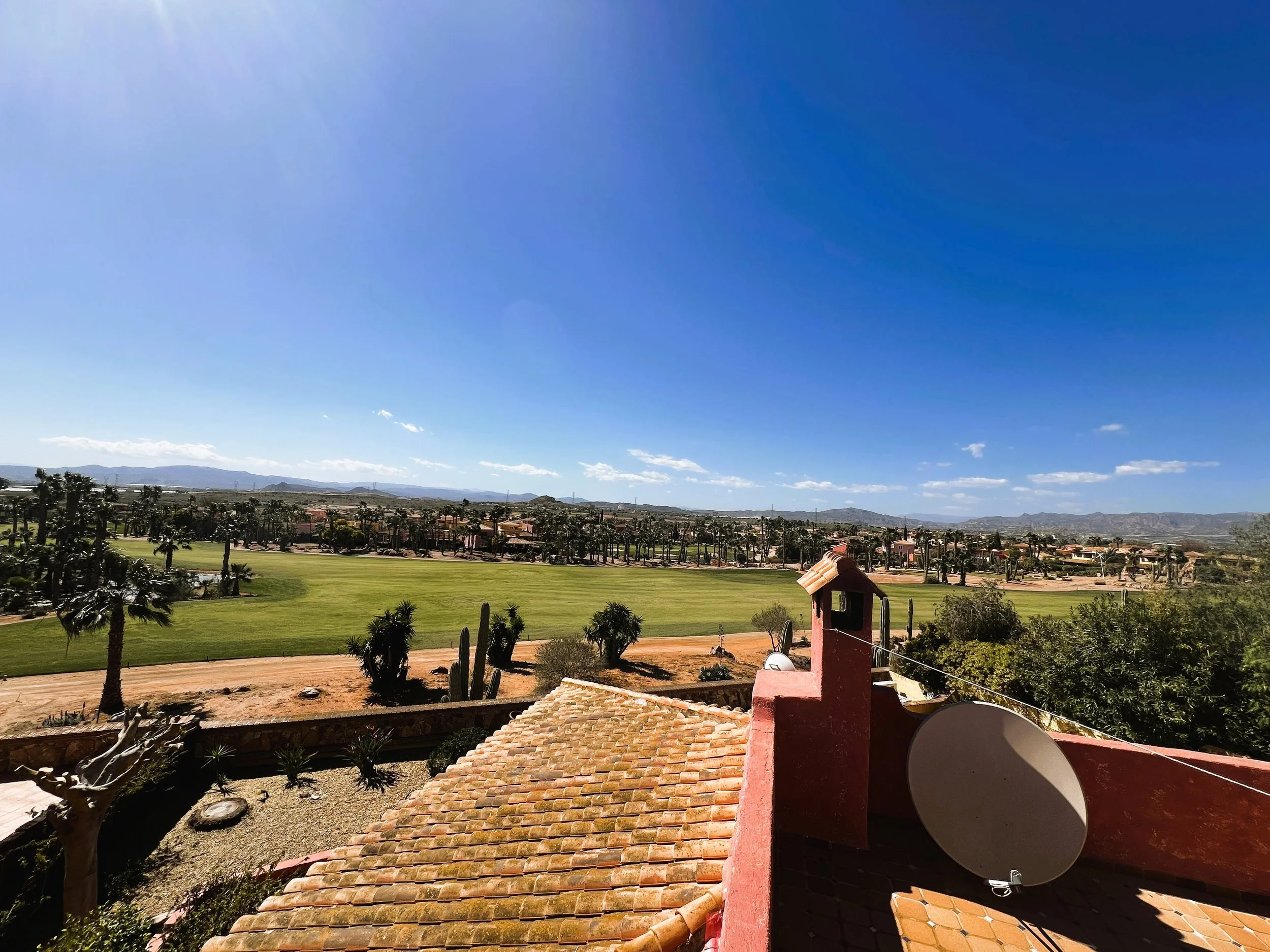 The villa includes a secluded garden area, thoughtfully designed for barbecuing and leisure, alongside landscaped gardens that are easy to maintain. The solarium occupies the entire rooftop, presenting opportunities for entertaining, sunbathing, gardening, or recreational activities as desired. The villa benefits from extensive vantage points over the first and eighteenth holes of the golf course, with far-reaching mountain vistas.