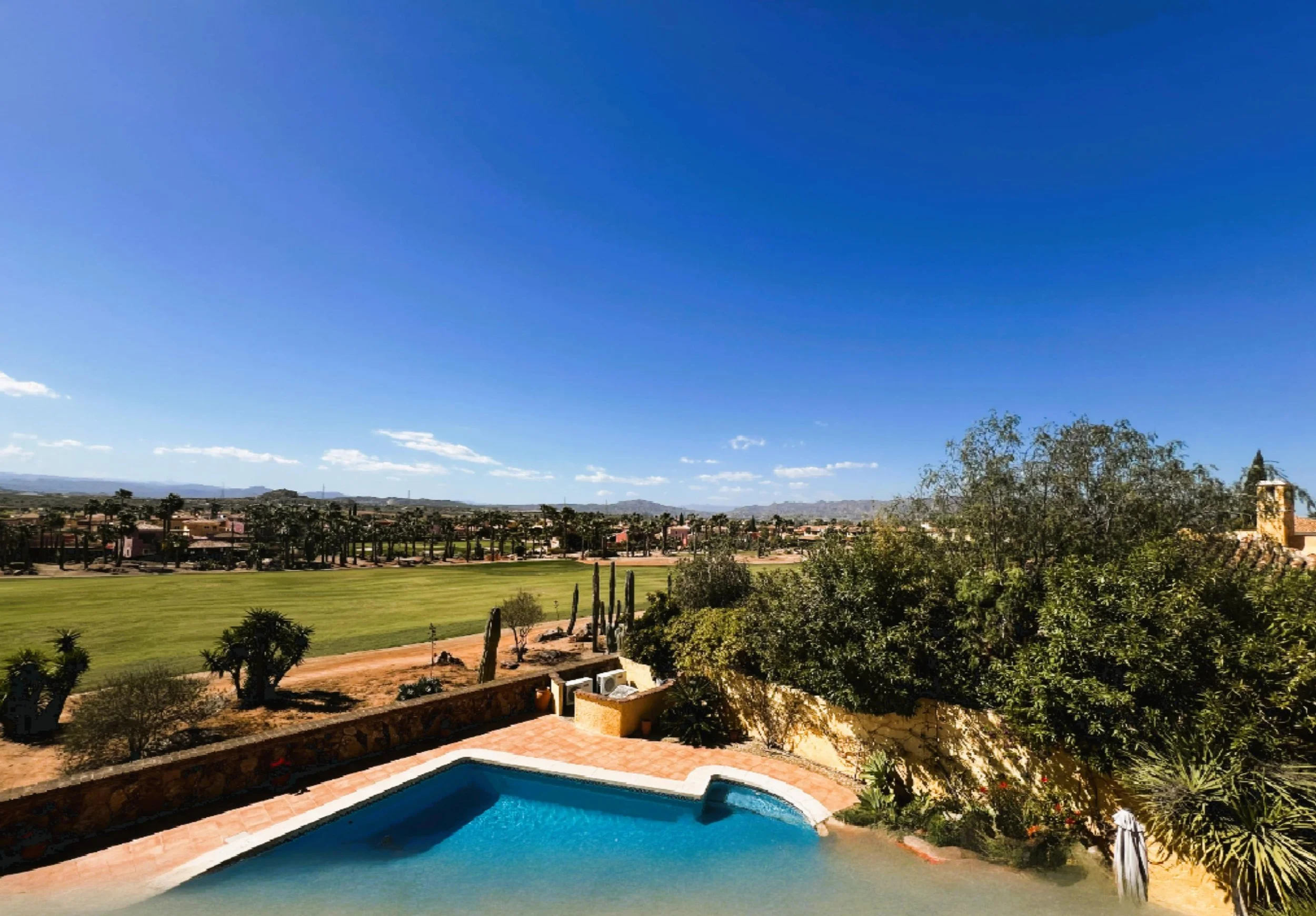 This well-presented Arizona-style detached villa is set in a private location within the community of Sierra Drive, a charming area of Desert Springs. The property boasts stunning views overlooking the golf course and the mountains in the background, offering a picturesque and tranquil environment.