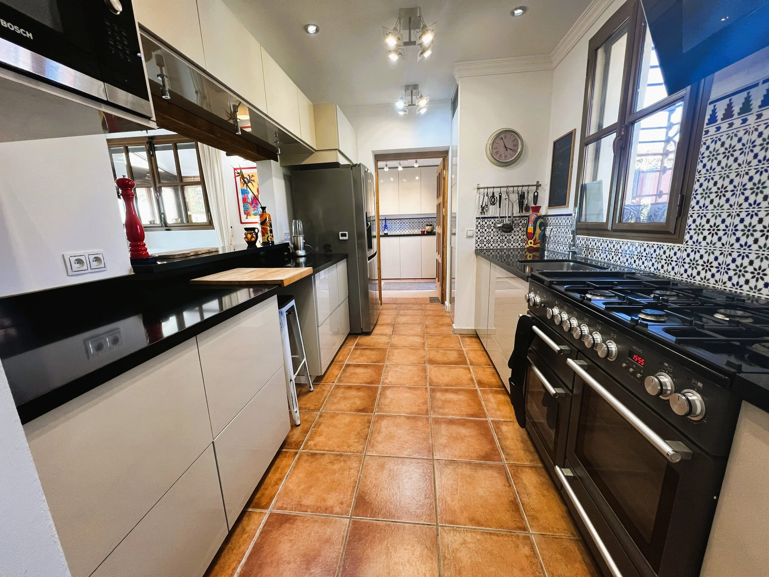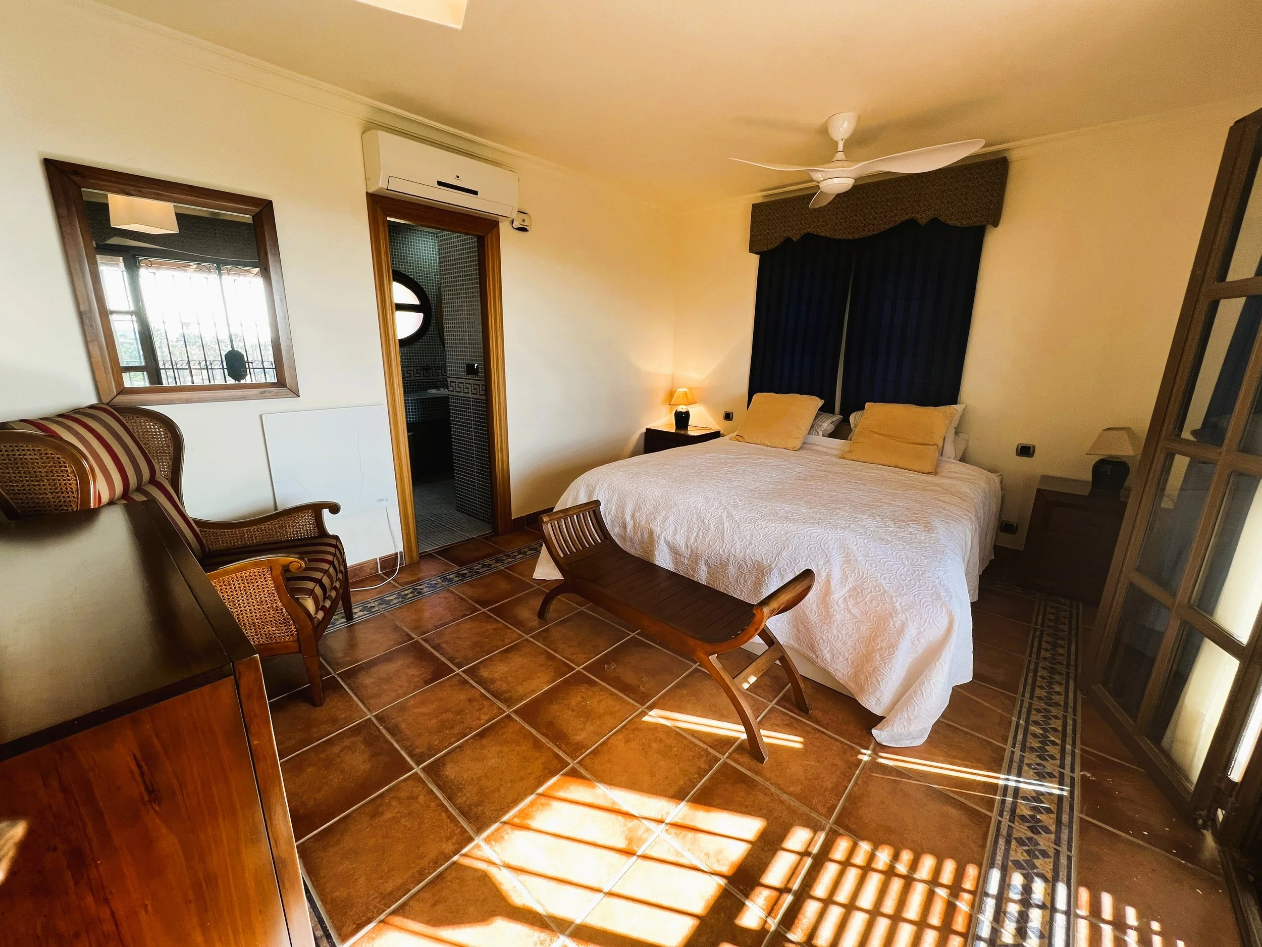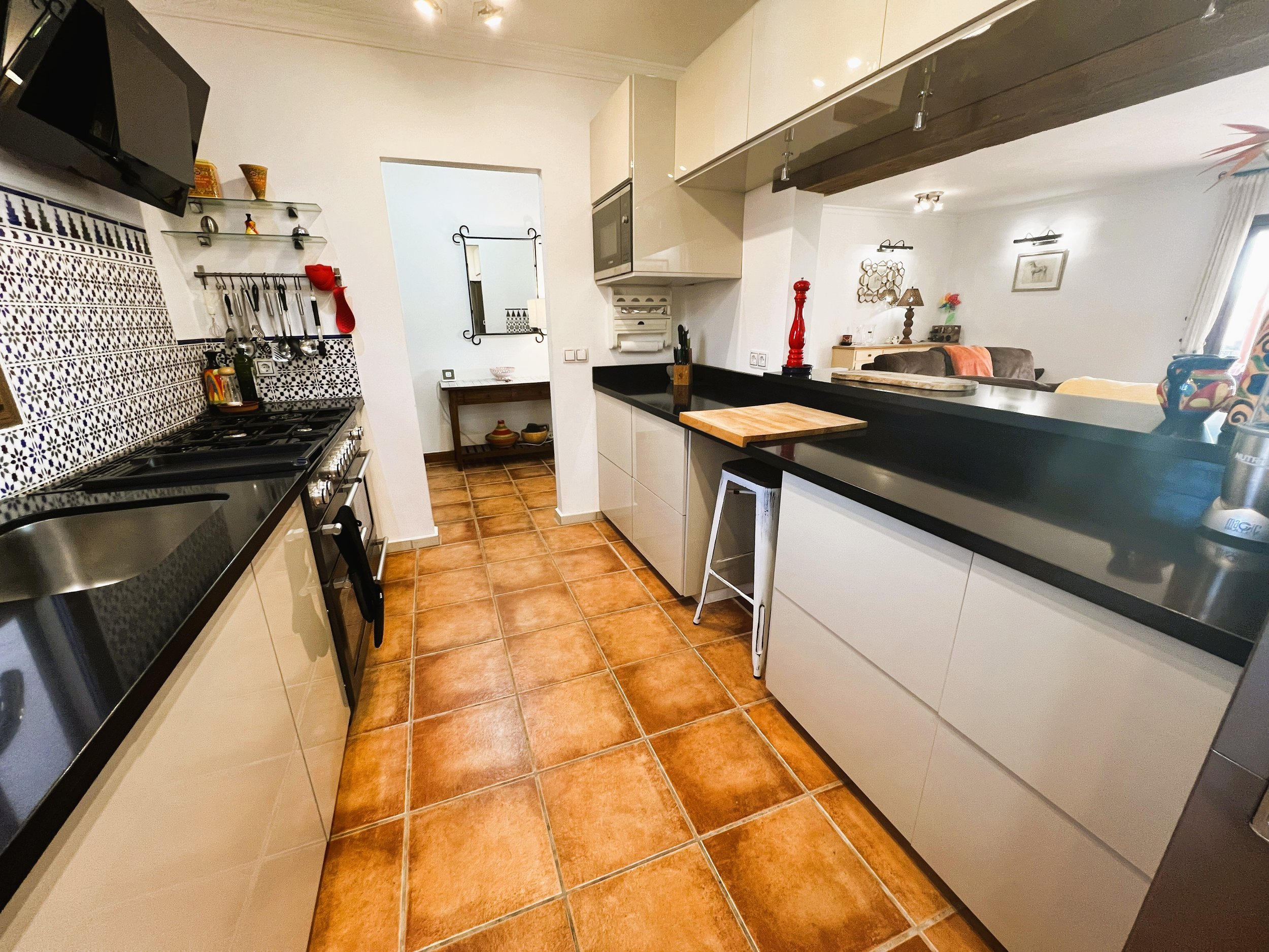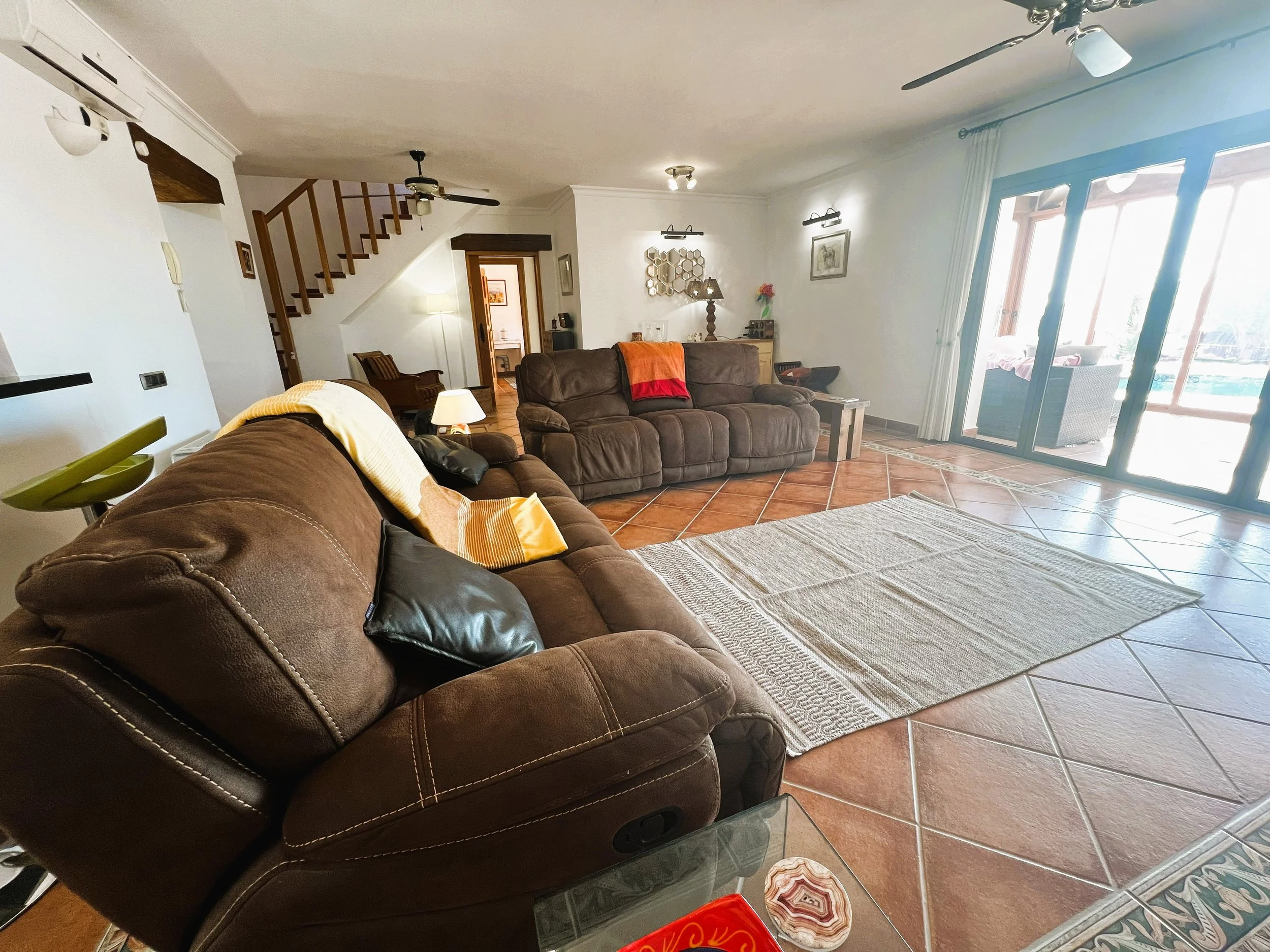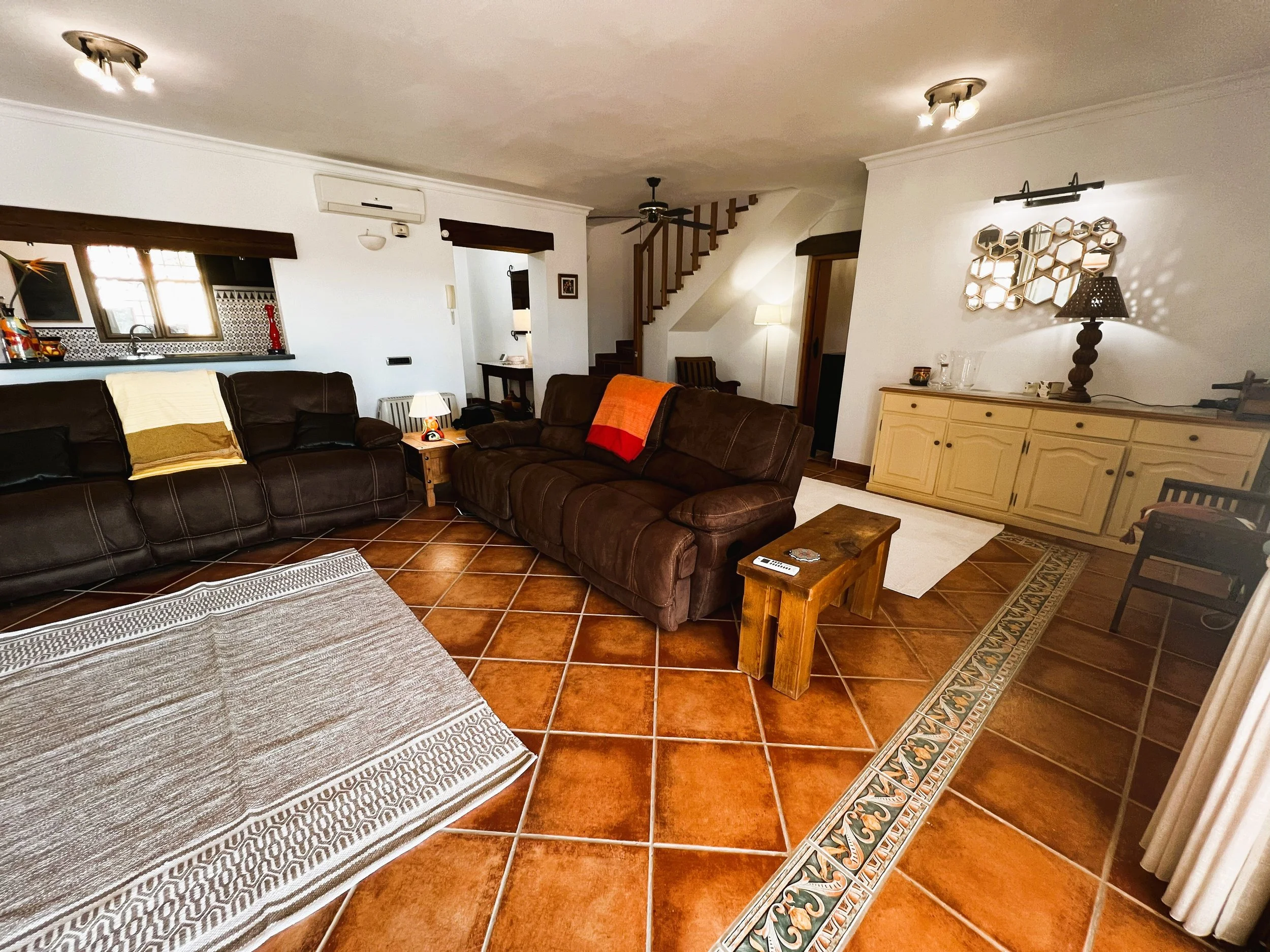 The villa provides superior accommodation, beginning with a welcoming hall and an extended living and dining area on the ground floor, complete with a cosy log burner. The semi-open plan kitchen is accessible via a substantial serving hatch and has been tastefully renovated to include ample storage, an impressive range cooker and a large American refrigerator. This space leads to a generous utility area and offers direct access into a breakfast room, which connects to an additional dining room.
