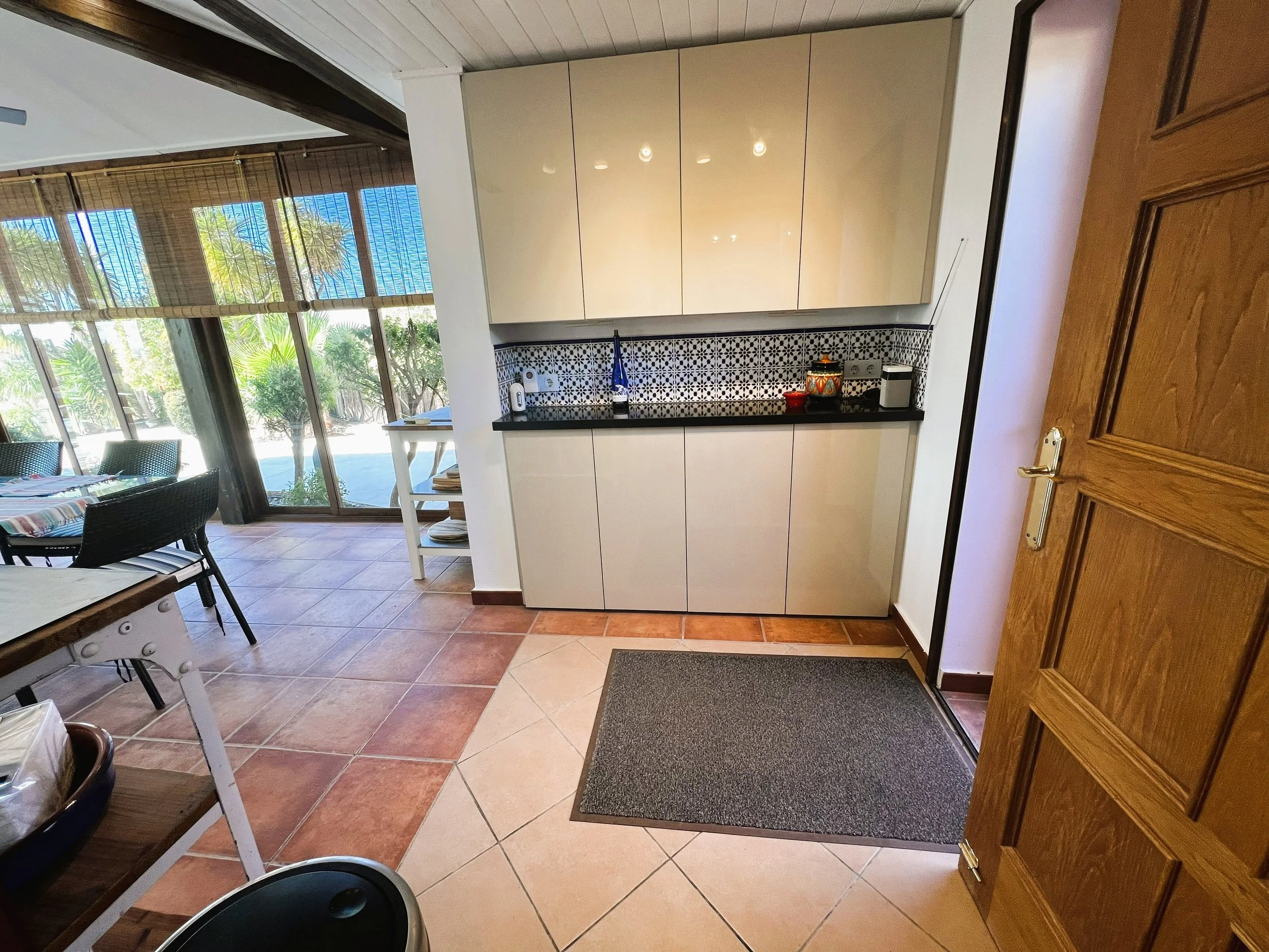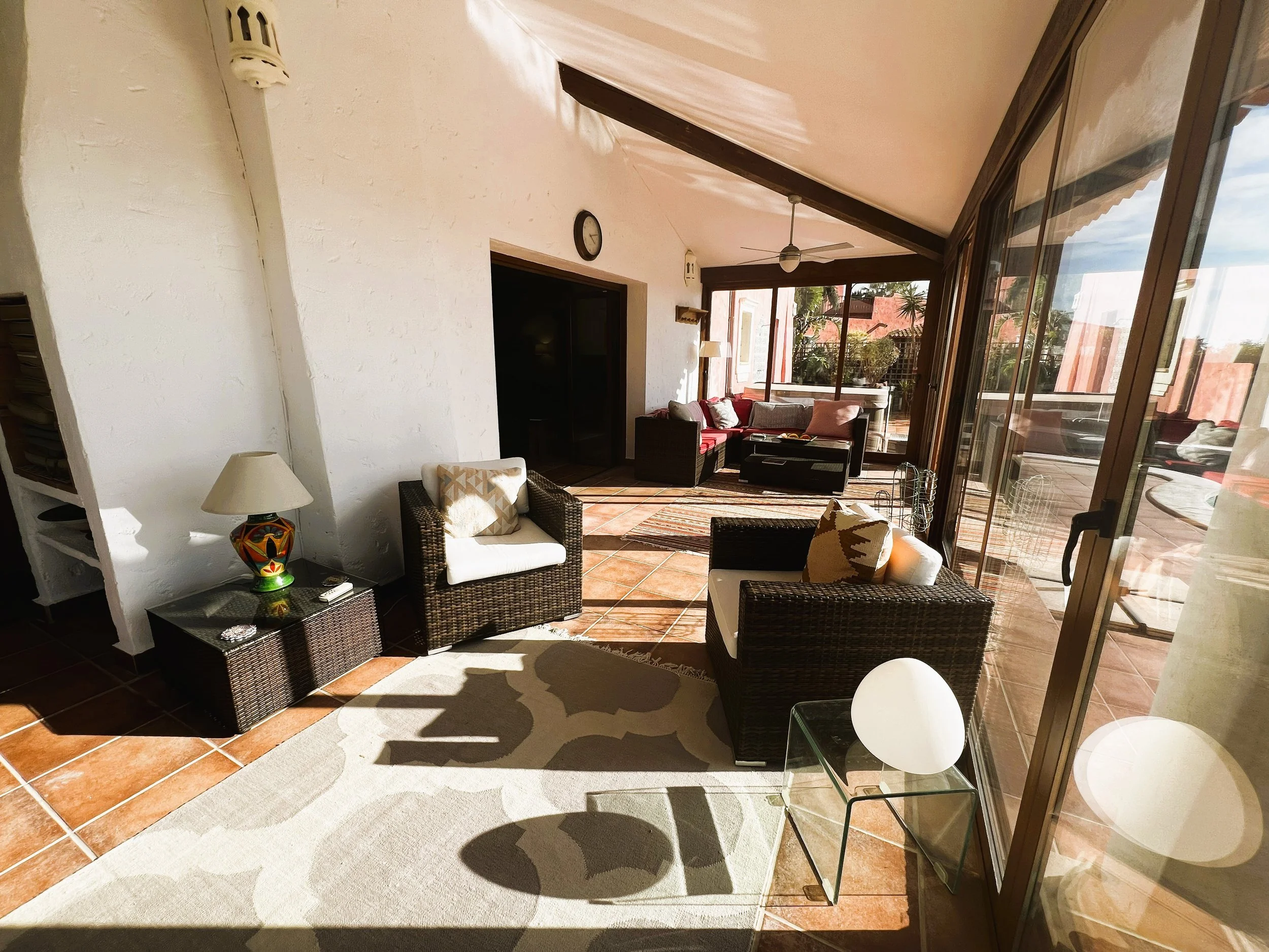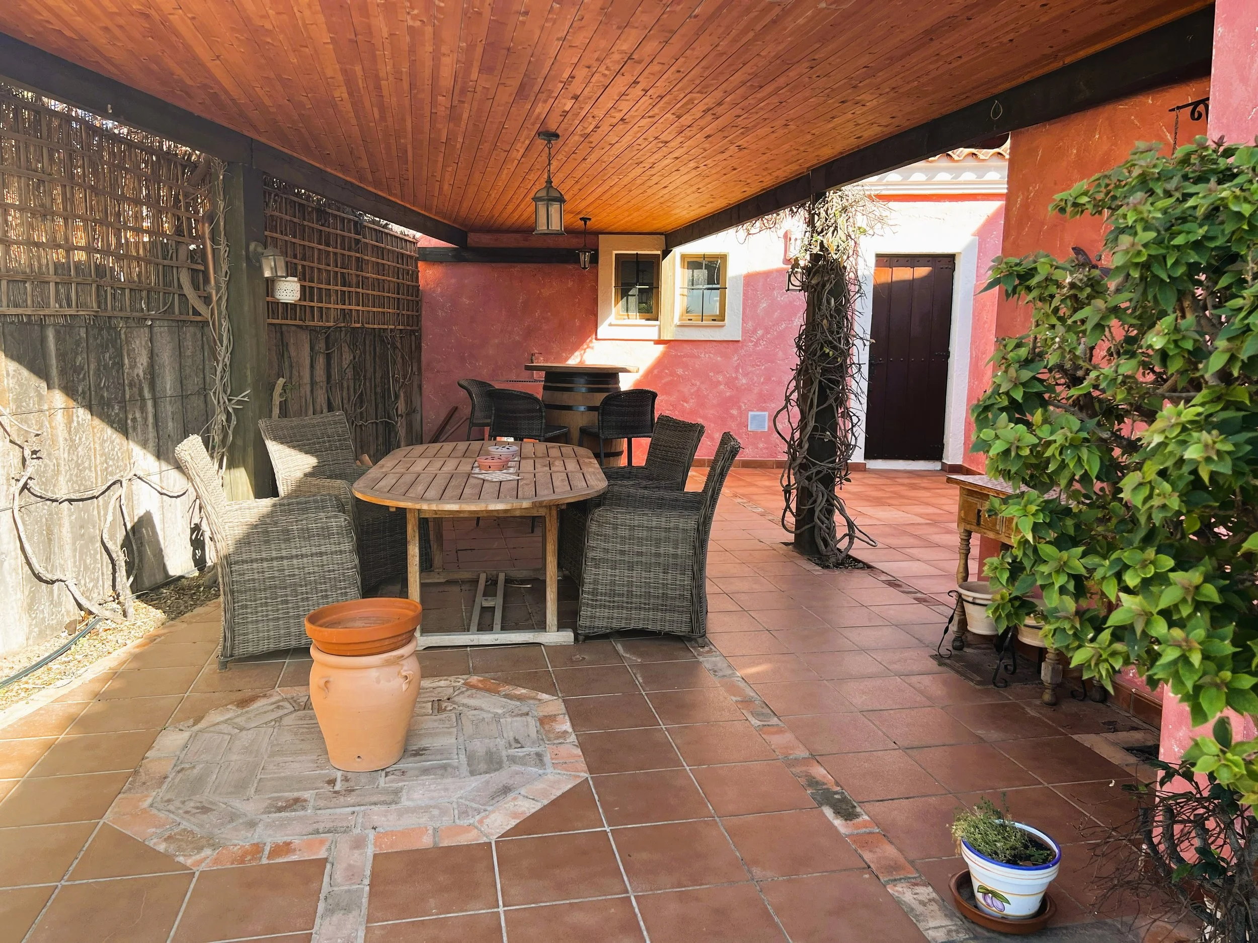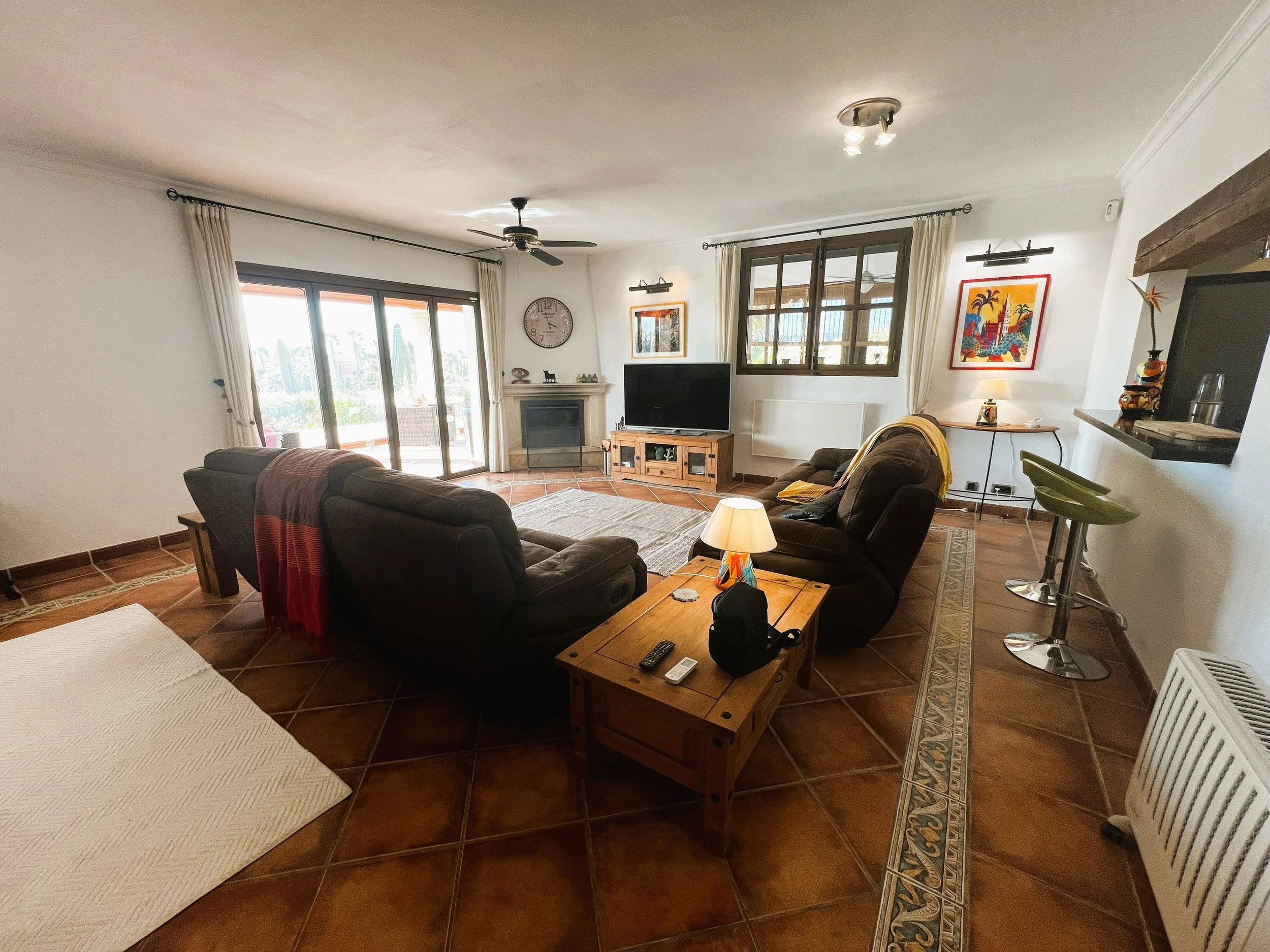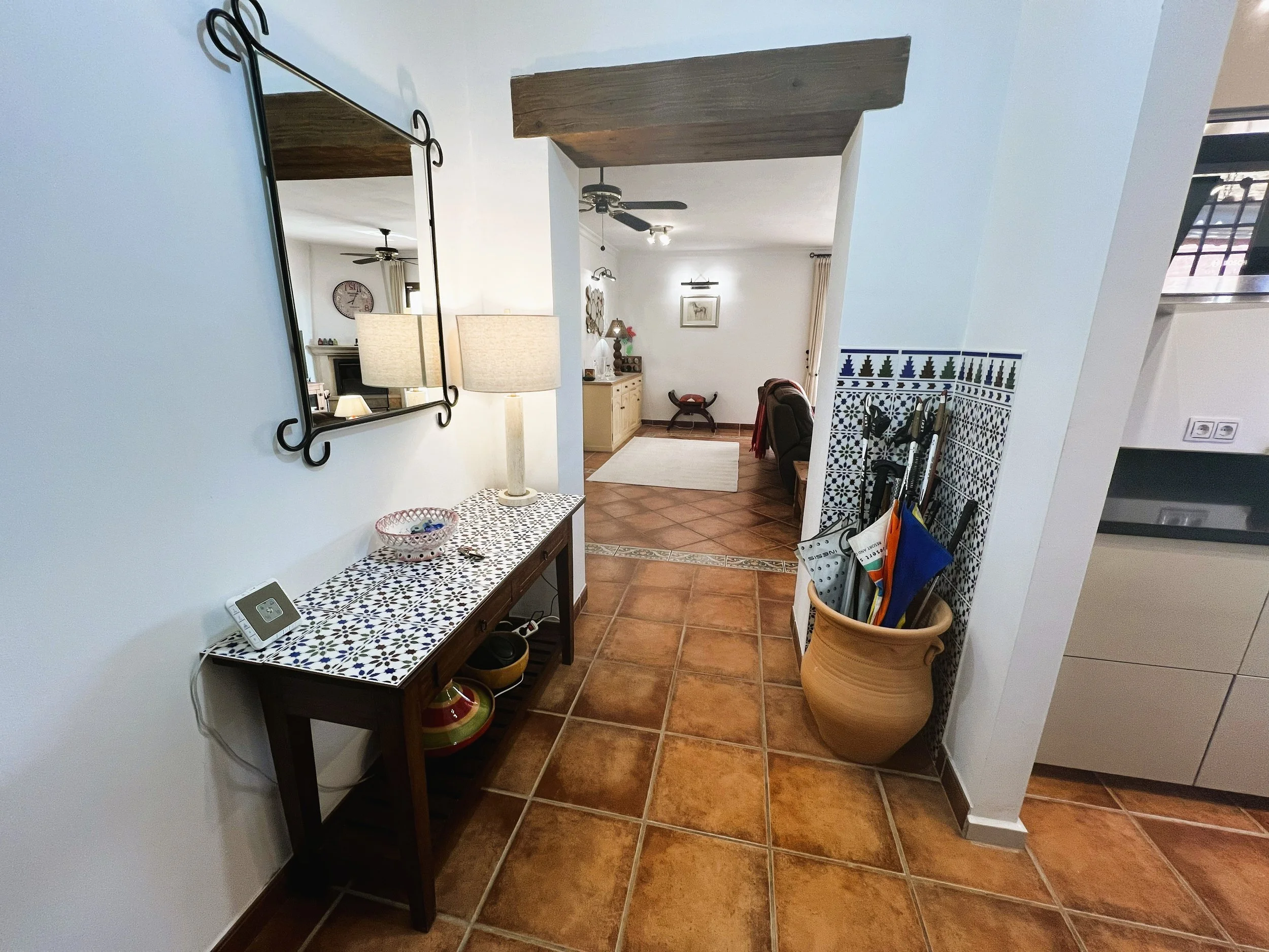 The villa provides superior accommodation, beginning with a welcoming hall and an extended living and dining area on the ground floor, complete with a cosy log burner. The semi-open plan kitchen is accessible via a substantial serving hatch and has been tastefully renovated to include ample storage, an impressive range cooker and a large American refrigerator. This space leads to a generous utility area and offers direct access into a breakfast room, which connects to an additional dining room.