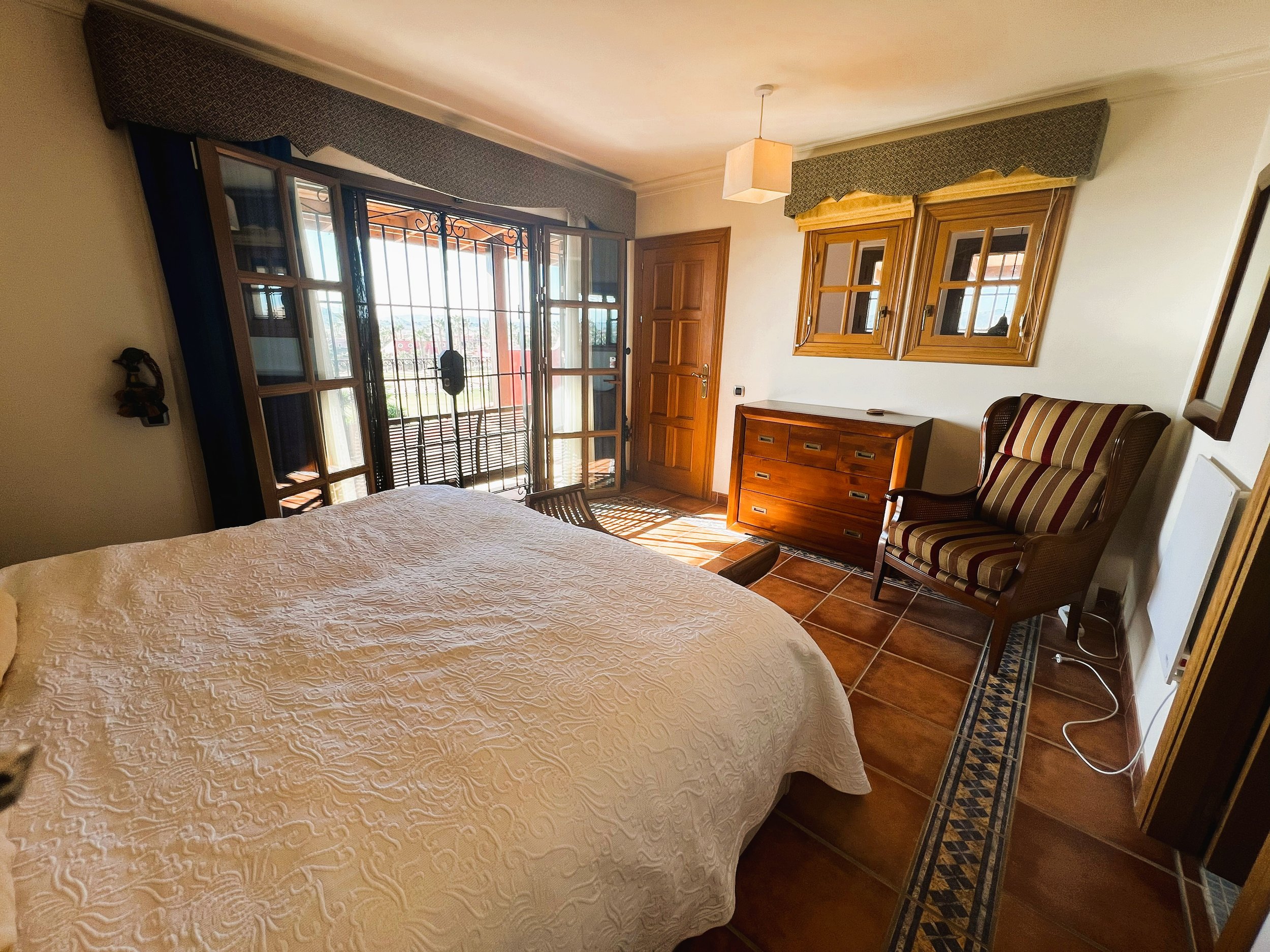 Folding doors open into a beautifully bright and airy sunroom, featuring double glazing and sliding doors. These lead onto a meticulously maintained terrace, which provides impressive views of the pool, garden, and adjacent golf course. There is a hot tub to enjoy leisurely moments after a round of golf. The property comprises four bedrooms, including two with ensuite facilities, as well as a family bathroom and an additional washroom.