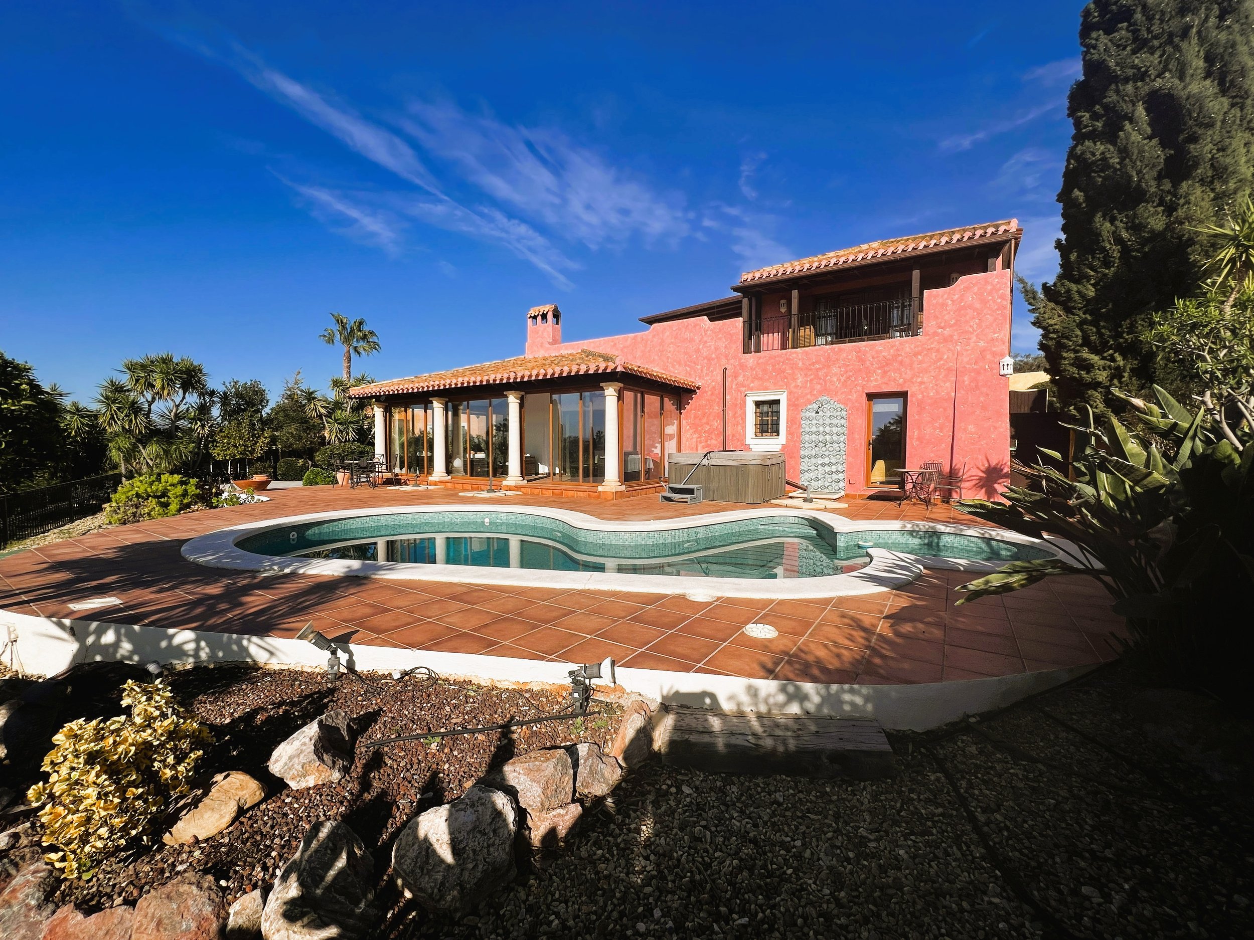 4 bedROOMS · 4 bathROOMS · open plan living room/dining room · REMODELLED kitchen/utility area · ADDITONAL DINING AREA · extended DOUBLE-GLAZED sunroom · private pool · HOT TUB · DOUBLE GARAGE · gardens