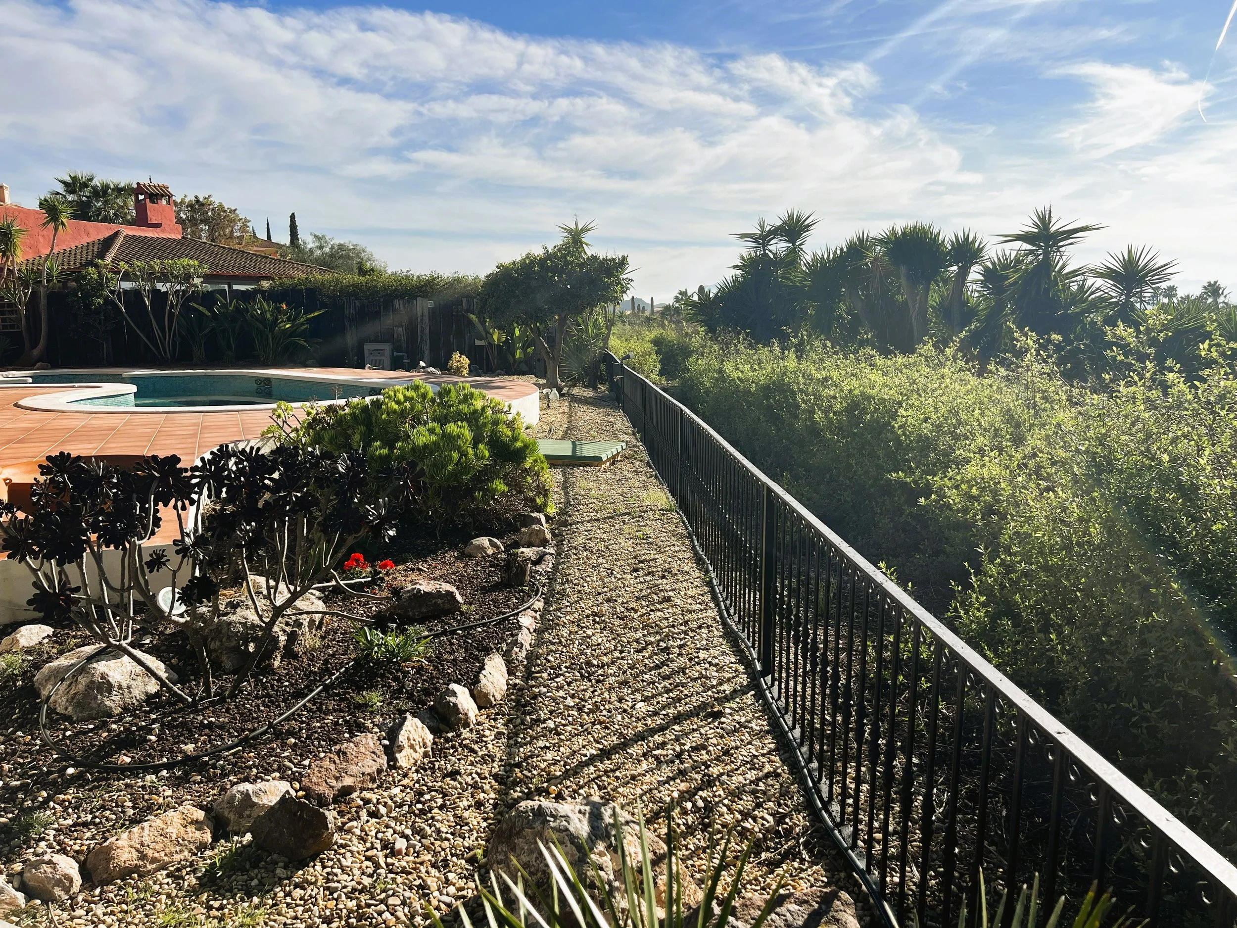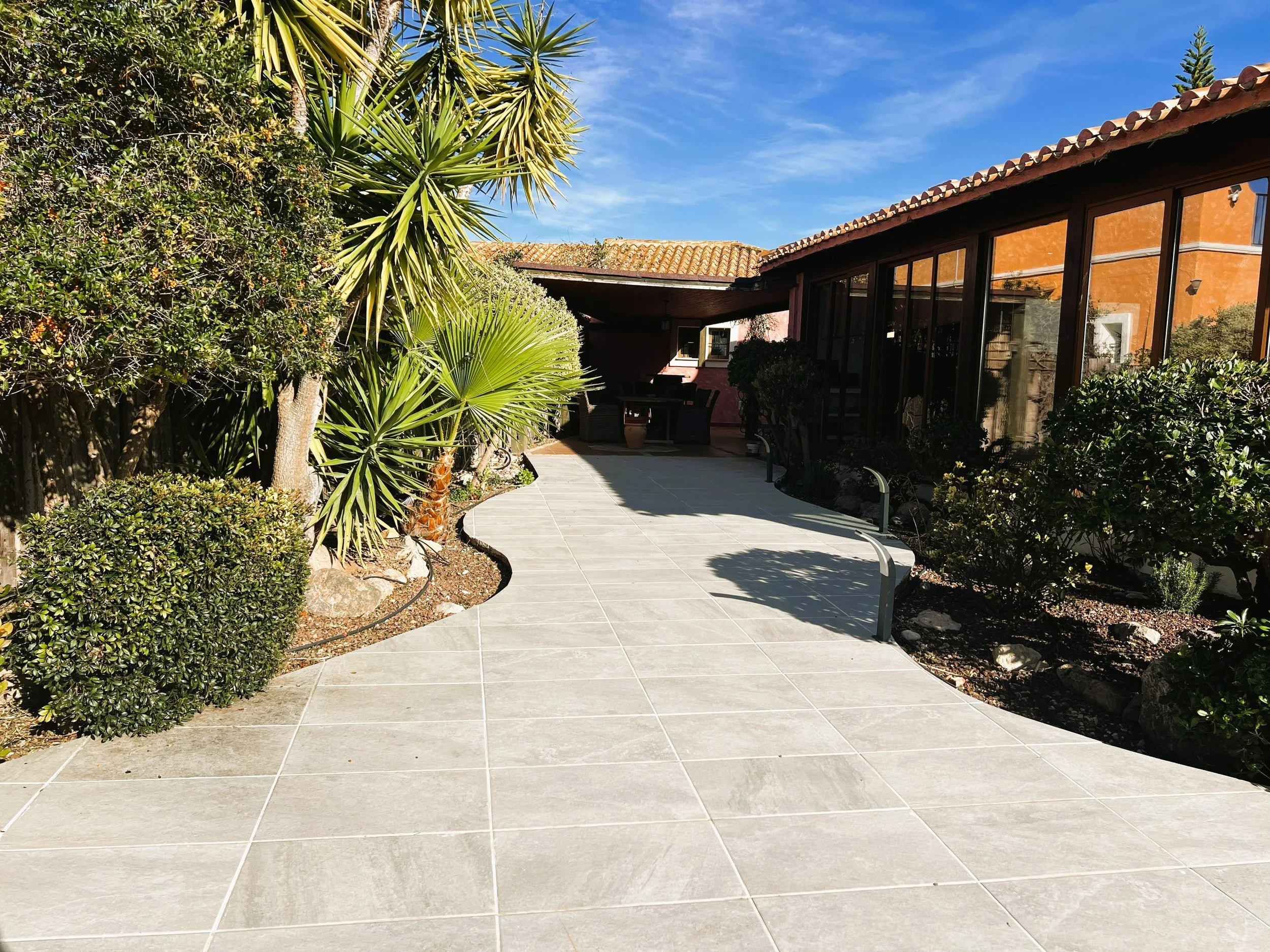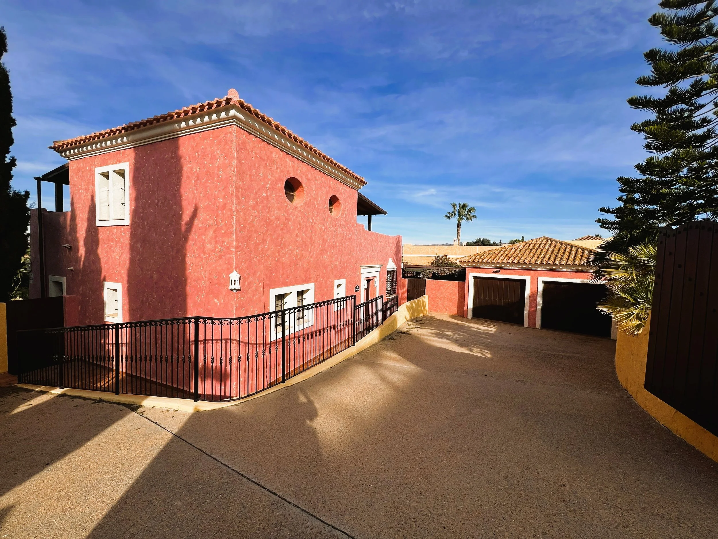 The double garage provides ample parking and storage space for bikes, golf clubs, and other sports equipment. Mature, well-planned gardens with fruit trees surround the property, enhancing the setting. A sizeable pool overlooks the golf course and is complemented by spacious sunbathing and relaxation zones. At the front, there is parking for several vehicles and a driveway leading to both the main entrance and the garage.