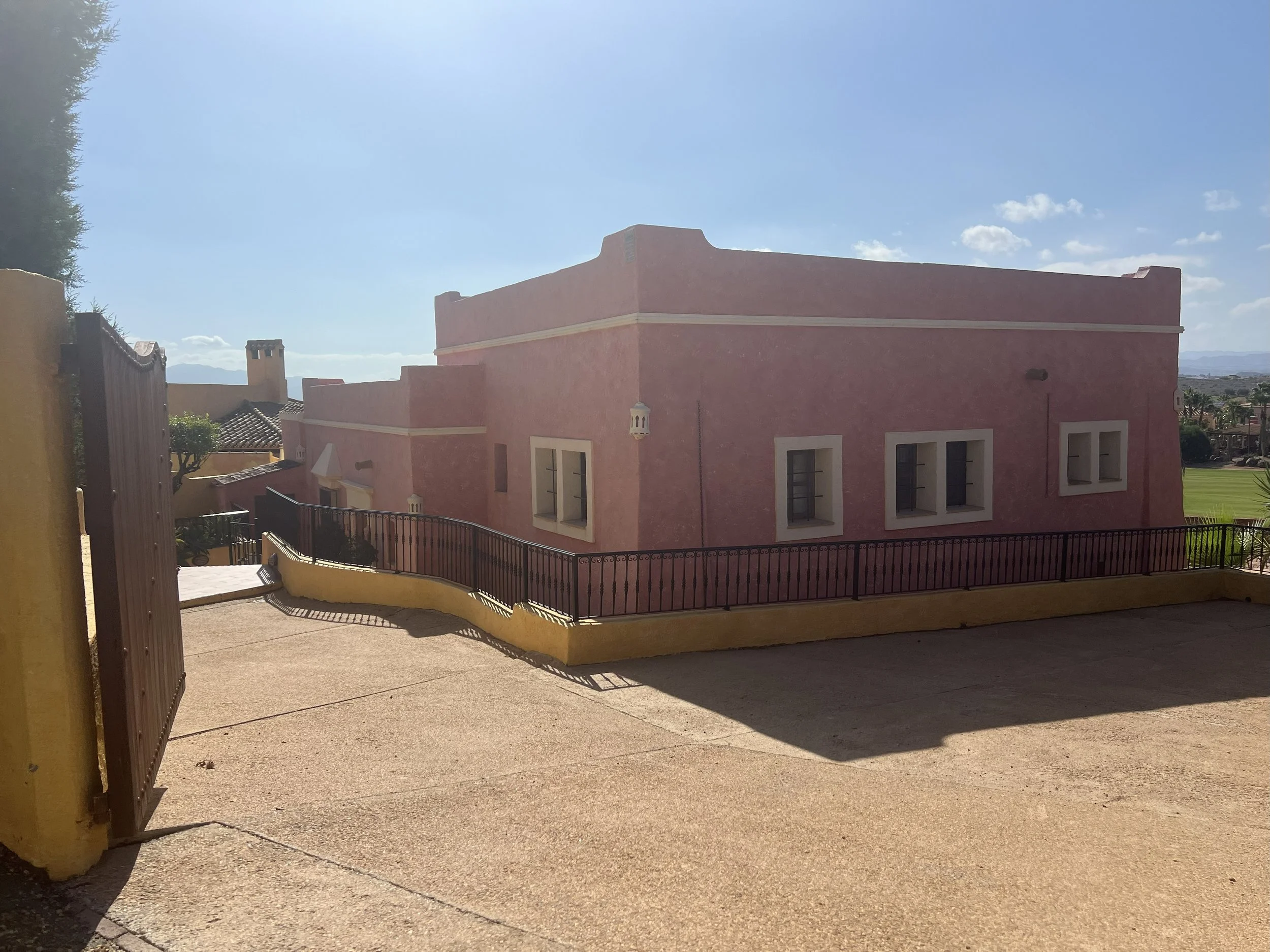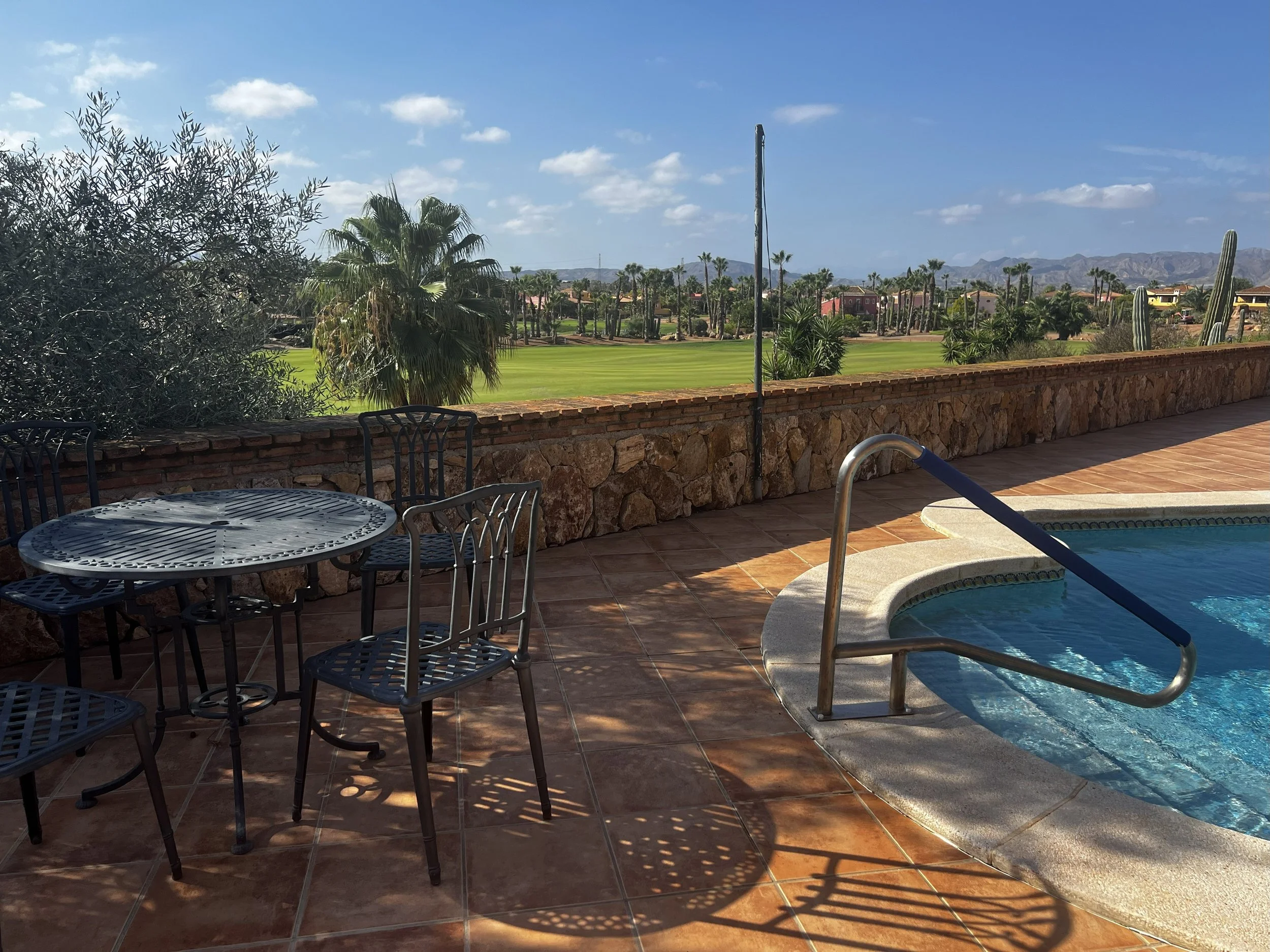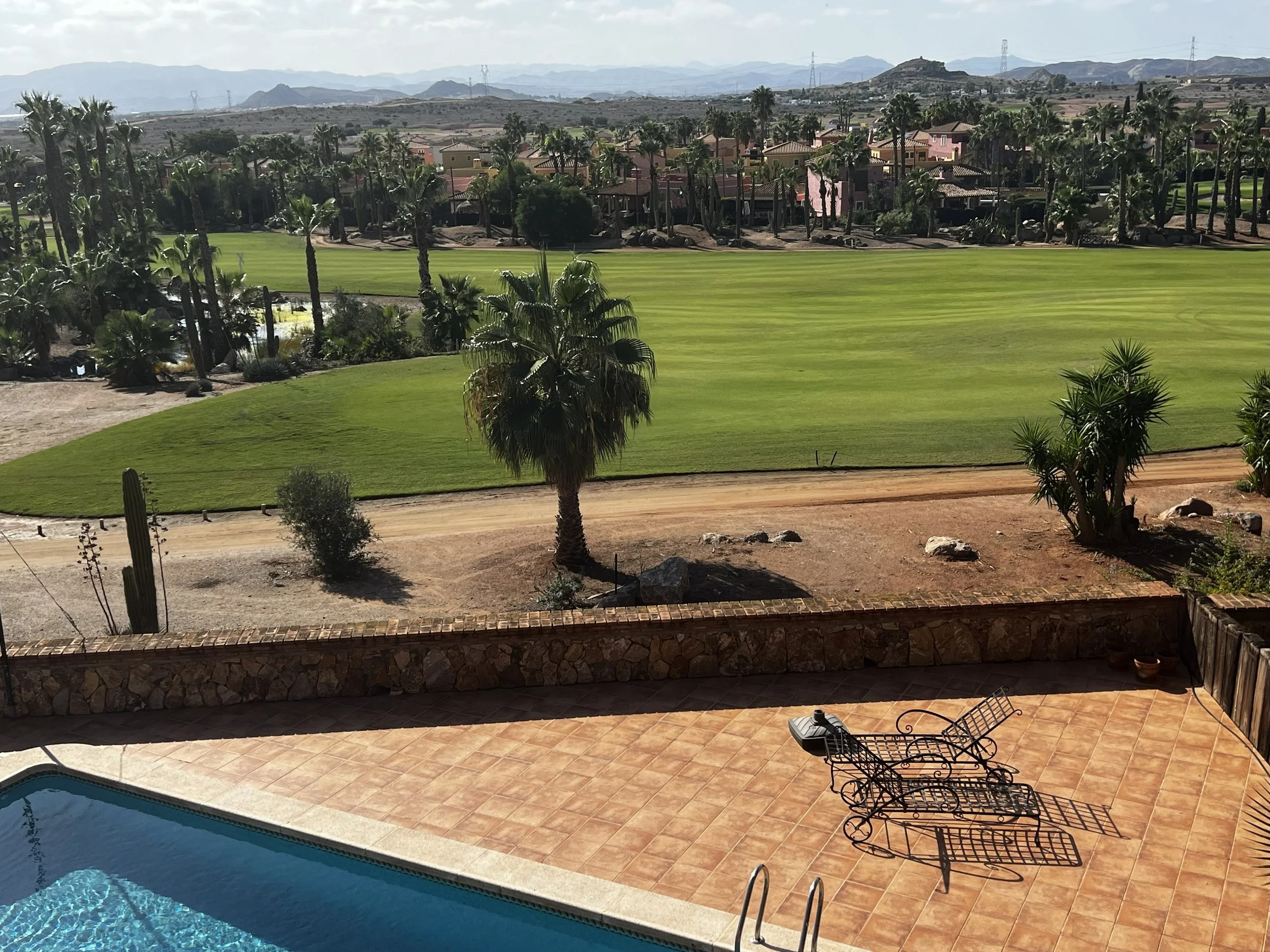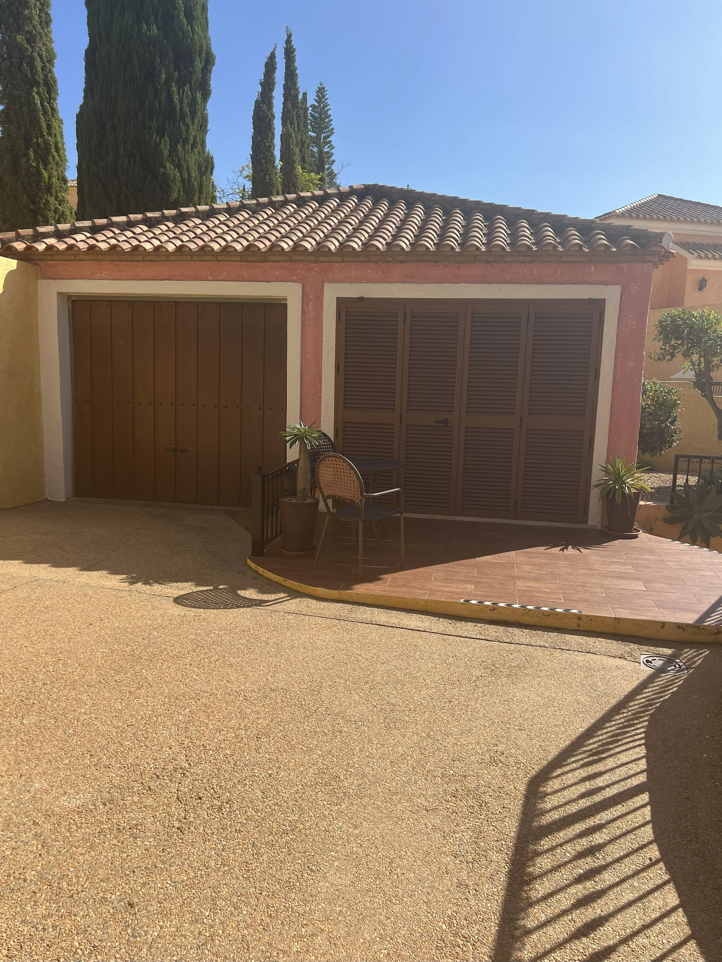 This villa is one of only 2 California style split-level villas on the resort. It offers exceptional accommodation with on the ground floor, hall, living/dining room with log burner. The kitchen is semi-open plan via a large hatch giving into the living room and has been skillfully extended with a spacious utility area with breakfast bar and access directly on to the terrace. There are 3 bedrooms, one with ensuite and family bathroom, with a lovely, light and spacious, high ceiling landing overlooking the dining and living room area. Off the living room is an enclosed sun room area with glass curtains providing a usable space for all year round living so you can enjoy the view over the pool, garden and golf course beyond. There is also a further terraced area used for barbecuing and relaxing, along with a spacious lower area with a hot tub. The solarium is also split level offering the opportunity to create a space for entertaining/sunbathing and also a planting/games area, as you so wish. The property provides generous, extensive views over the first and eighteenth holes and the mountains beyond. In addition, the double garage has been converted to provide a garage space, along with an additional double bedroom with ensuite and it’s own unique private sitting area. Surrounding the property are mature well laid out easy-maintenance gardens with fruit trees, a beautiful large pool overlooking the golf course with generous spaces for sunbathing and relaxing. To the front is a large parking area for several cars as well as a driveway leading down to the front door and garage.