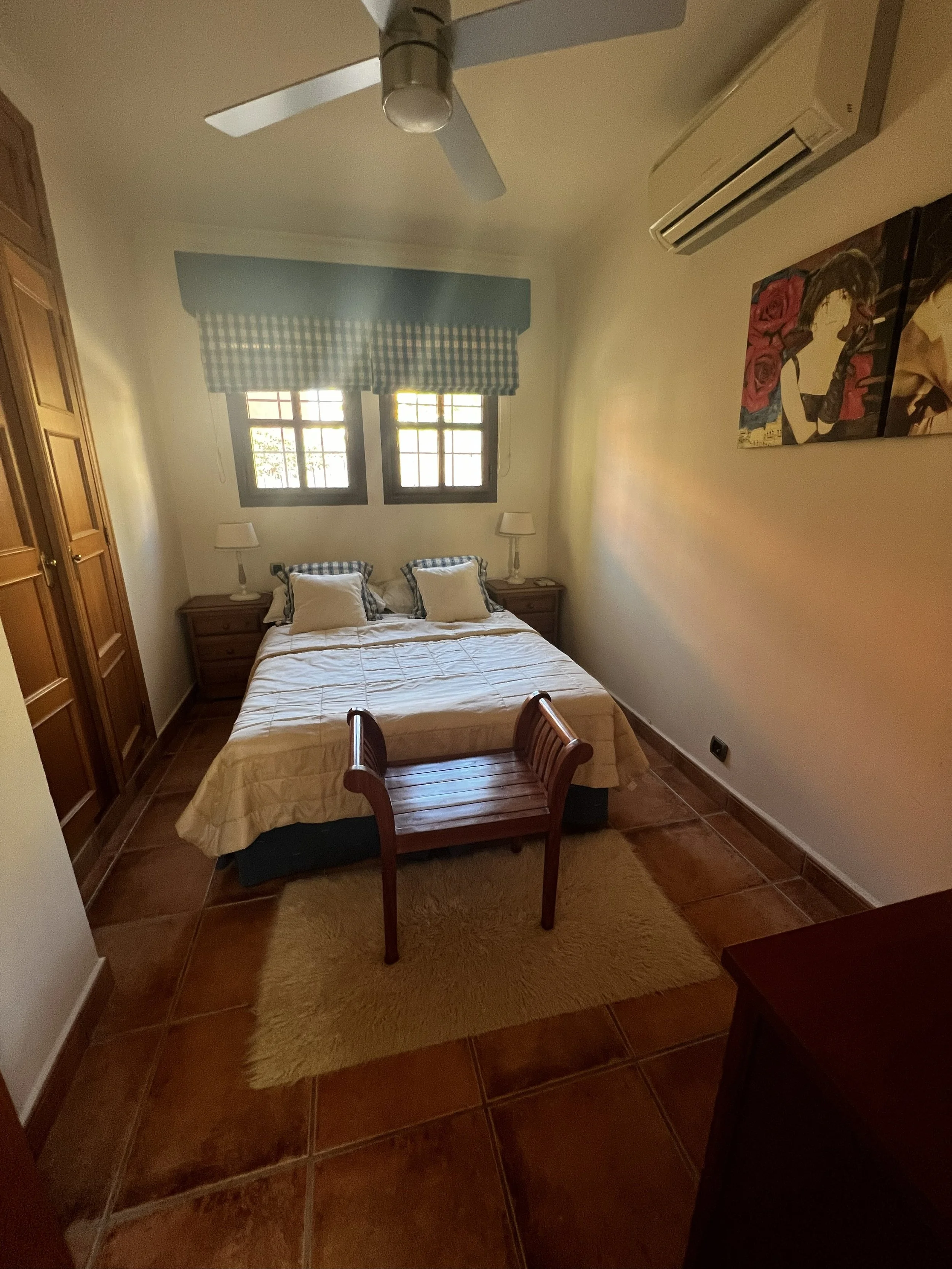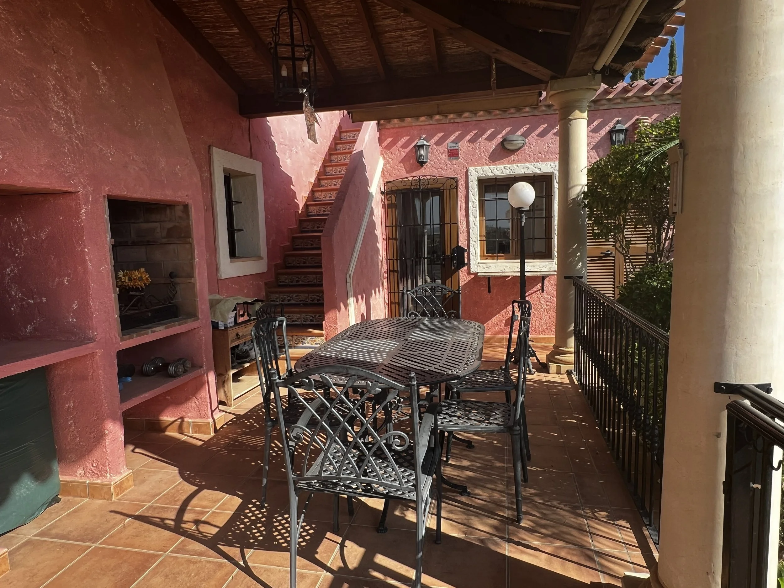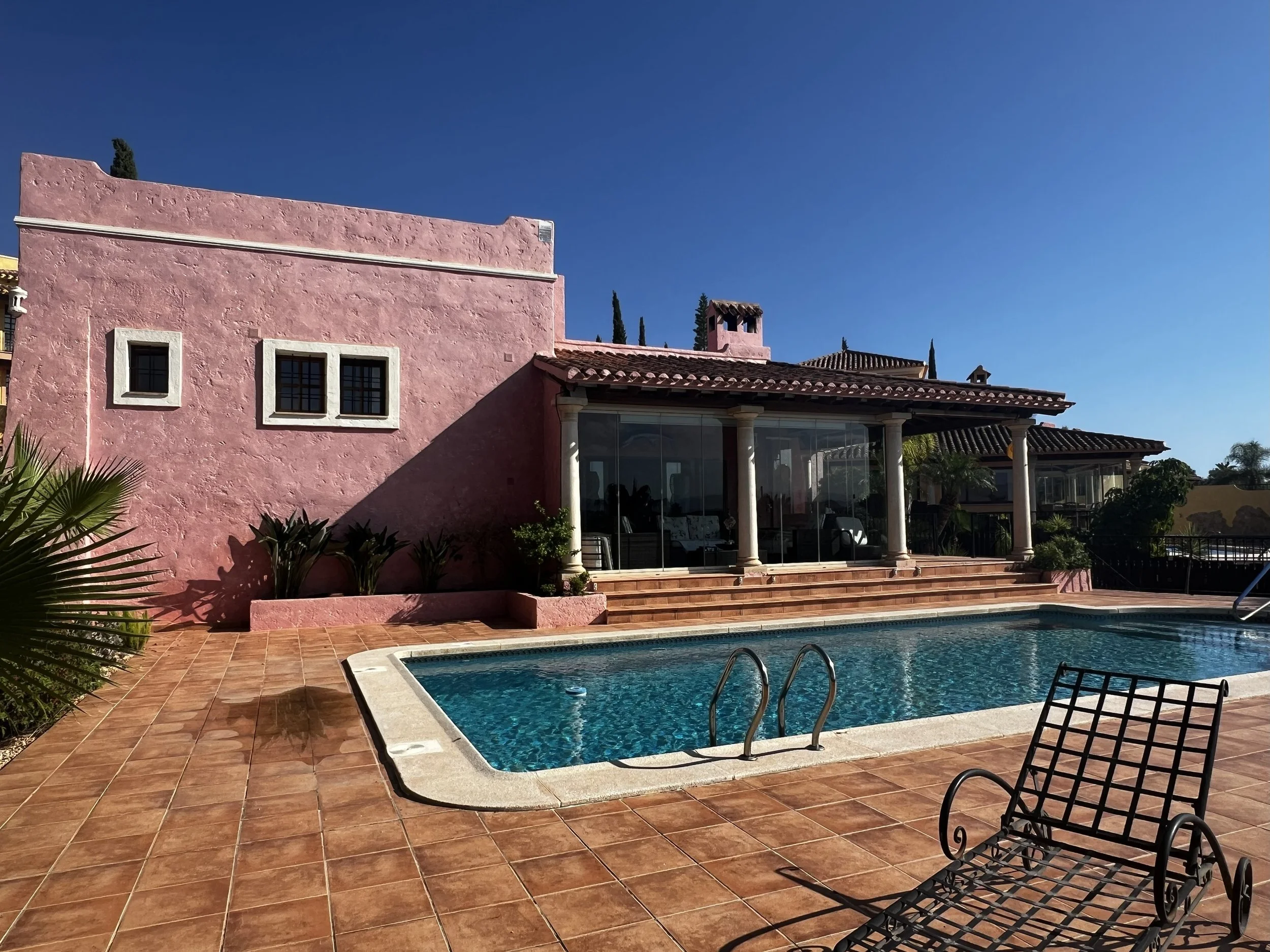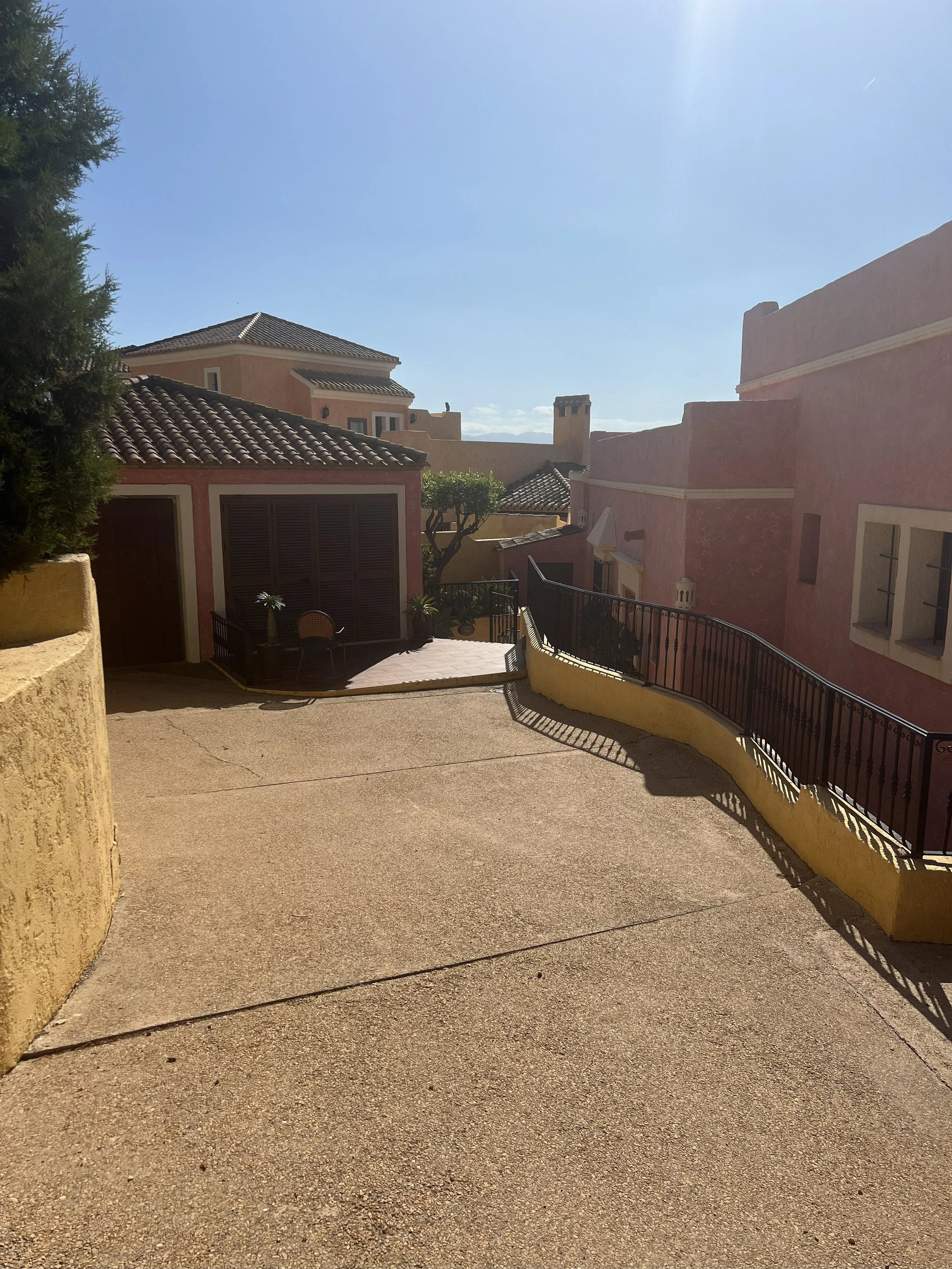This villa is one of only 2 California style split-level villas on the resort. It offers exceptional accommodation with on the ground floor, hall, living/dining room with log burner. The kitchen is semi-open plan via a large hatch giving into the living room and has been skillfully extended with a spacious utility area with breakfast bar and access directly on to the terrace. There are 3 bedrooms, one with ensuite and family bathroom, with a lovely, light and spacious, high ceiling landing overlooking the dining and living room area. Off the living room is an enclosed sun room area with glass curtains providing a usable space for all year round living so you can enjoy the view over the pool, garden and golf course beyond. There is also a further terraced area used for barbecuing and relaxing, along with a spacious lower area with a hot tub. The solarium is also split level offering the opportunity to create a space for entertaining/sunbathing and also a planting/games area, as you so wish. The property provides generous, extensive views over the first and eighteenth holes and the mountains beyond. In addition, the double garage has been converted to provide a garage space, along with an additional double bedroom with ensuite and it’s own unique private sitting area. Surrounding the property are mature well laid out easy-maintenance gardens with fruit trees, a beautiful large pool overlooking the golf course with generous spaces for sunbathing and relaxing. To the front is a large parking area for several cars as well as a driveway leading down to the front door and garage.