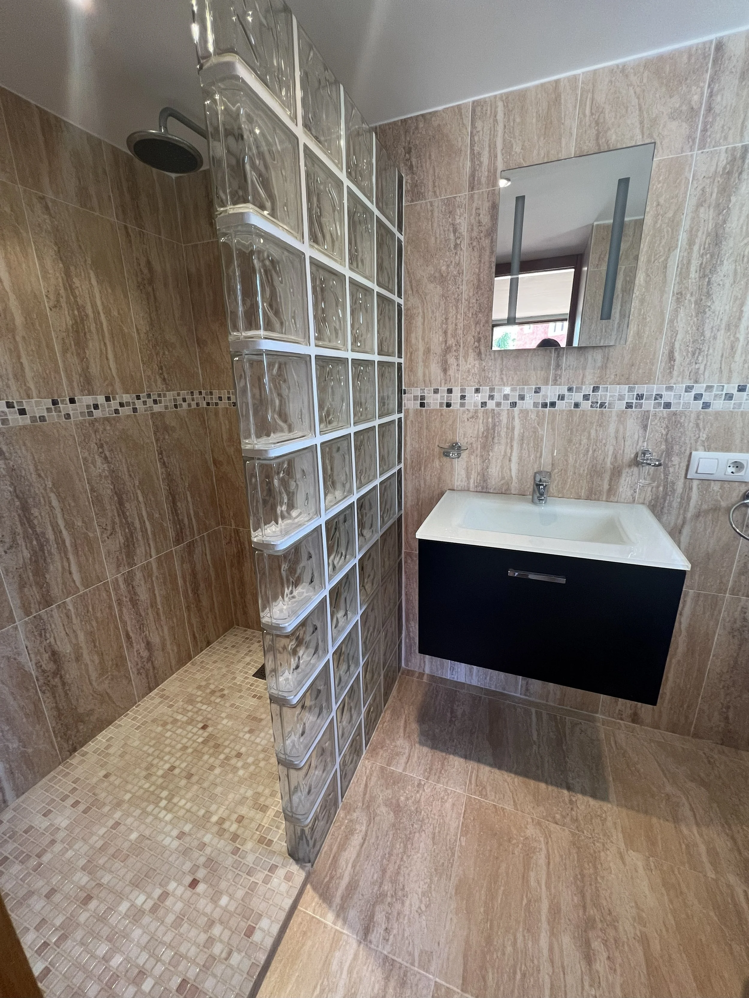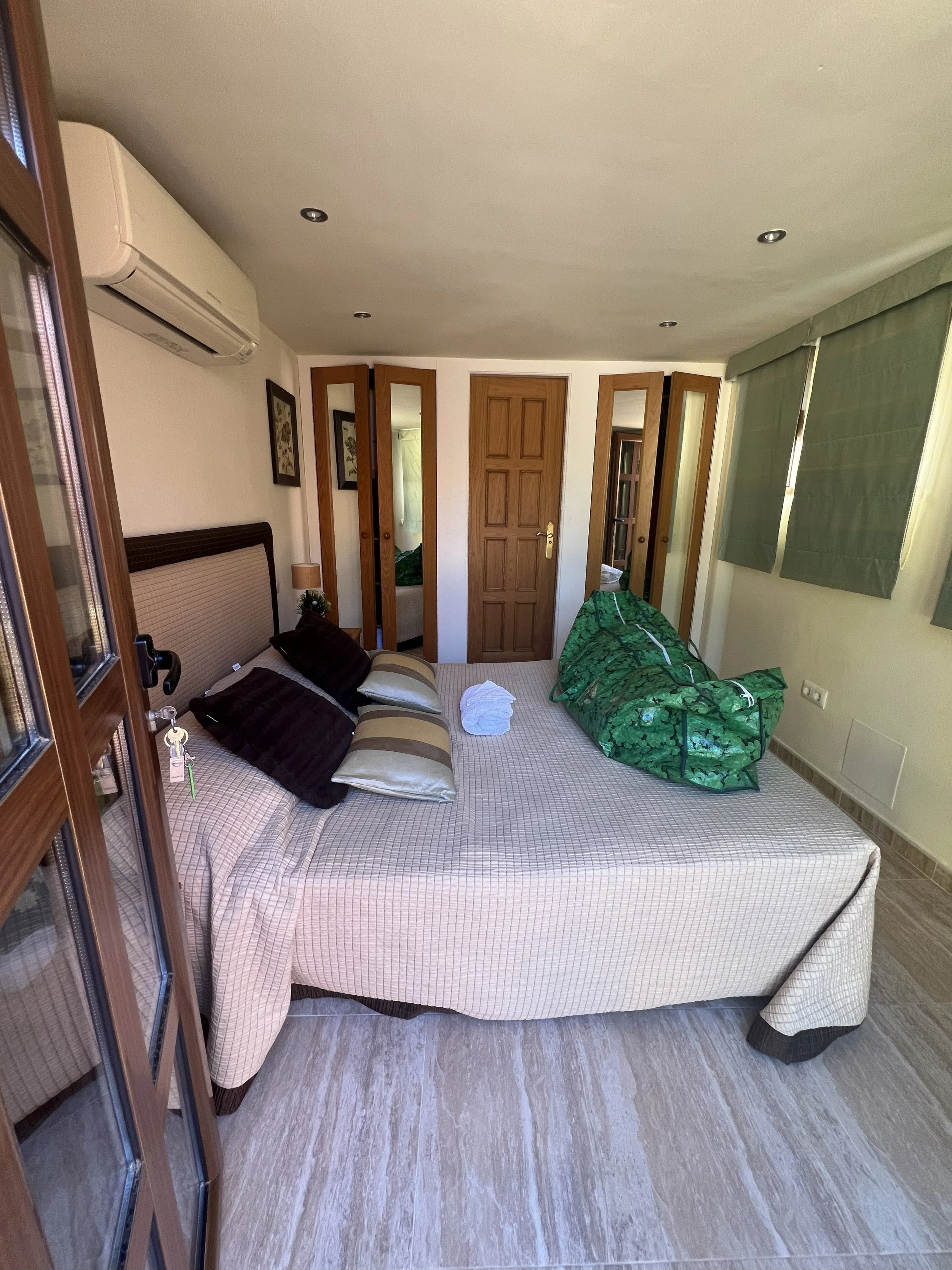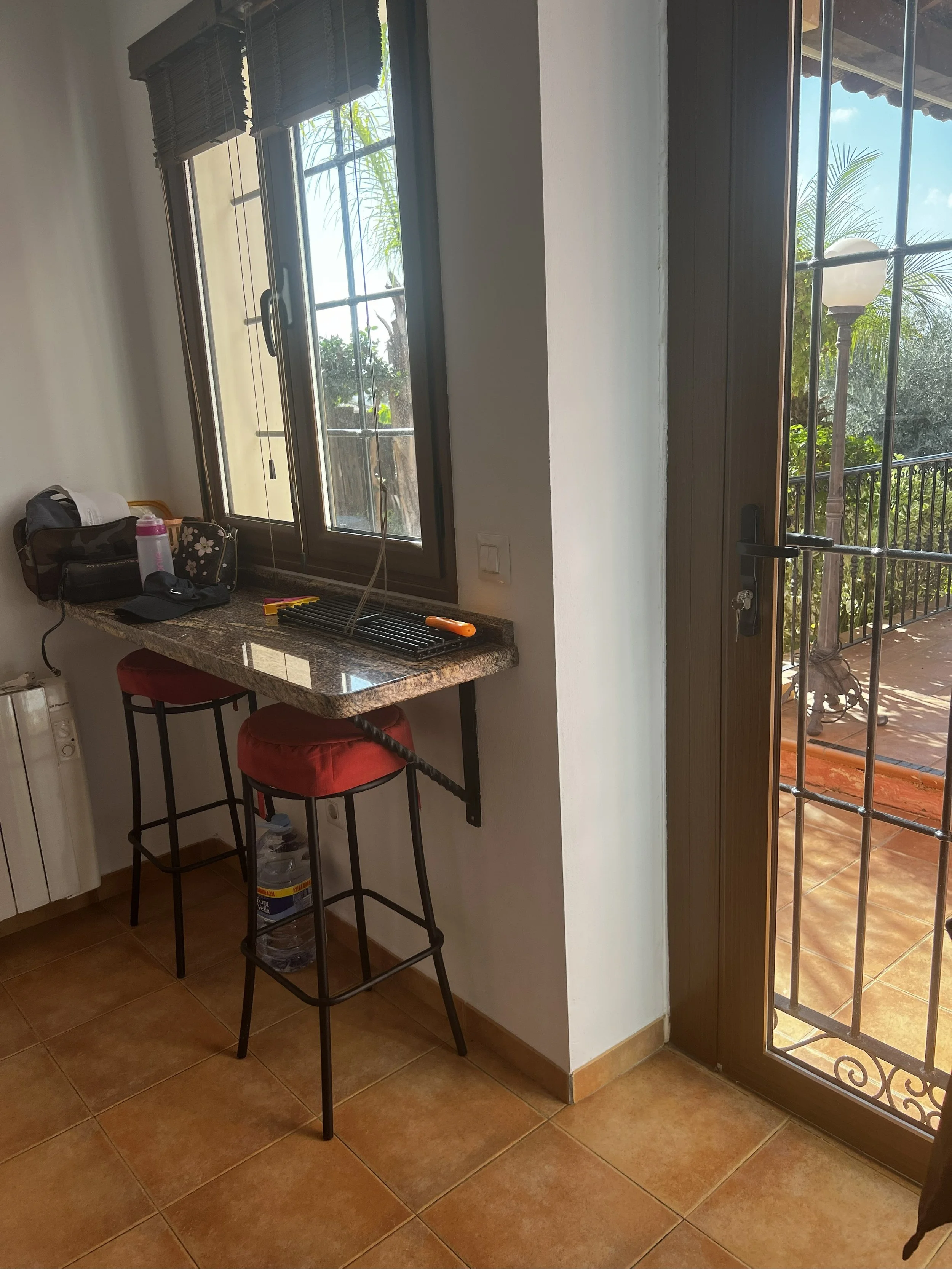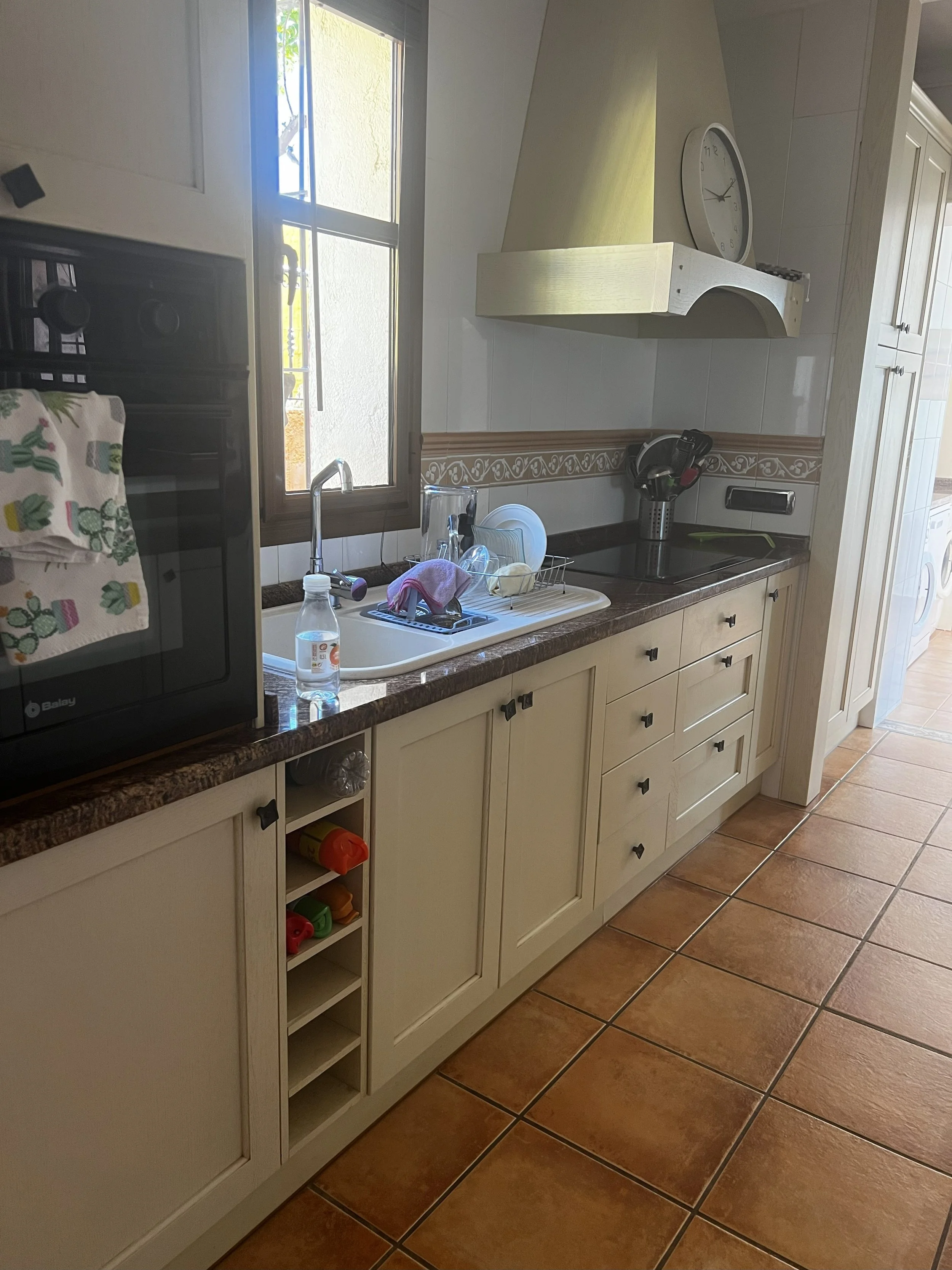 This villa is one of only 2 California style split-level villas on the resort. It offers exceptional accommodation with on the ground floor, hall, living/dining room with log burner. The kitchen is semi-open plan via a large hatch giving into the living room and has been skillfully extended with a spacious utility area with breakfast bar and access directly on to the terrace. There are 3 bedrooms, one with ensuite and family bathroom, with a lovely, light and spacious, high ceiling landing overlooking the dining and living room area. Off the living room is an enclosed sun room area with glass curtains providing a usable space for all year round living so you can enjoy the view over the pool, garden and golf course beyond. There is also a further terraced area used for barbecuing and relaxing, along with a spacious lower area with a hot tub. The solarium is also split level offering the opportunity to create a space for entertaining/sunbathing and also a planting/games area, as you so wish. The property provides generous, extensive views over the first and eighteenth holes and the mountains beyond. In addition, the double garage has been converted to provide a garage space, along with an additional double bedroom with ensuite and it’s own unique private sitting area. Surrounding the property are mature well laid out easy-maintenance gardens with fruit trees, a beautiful large pool overlooking the golf course with generous spaces for sunbathing and relaxing. To the front is a large parking area for several cars as well as a driveway leading down to the front door and garage.