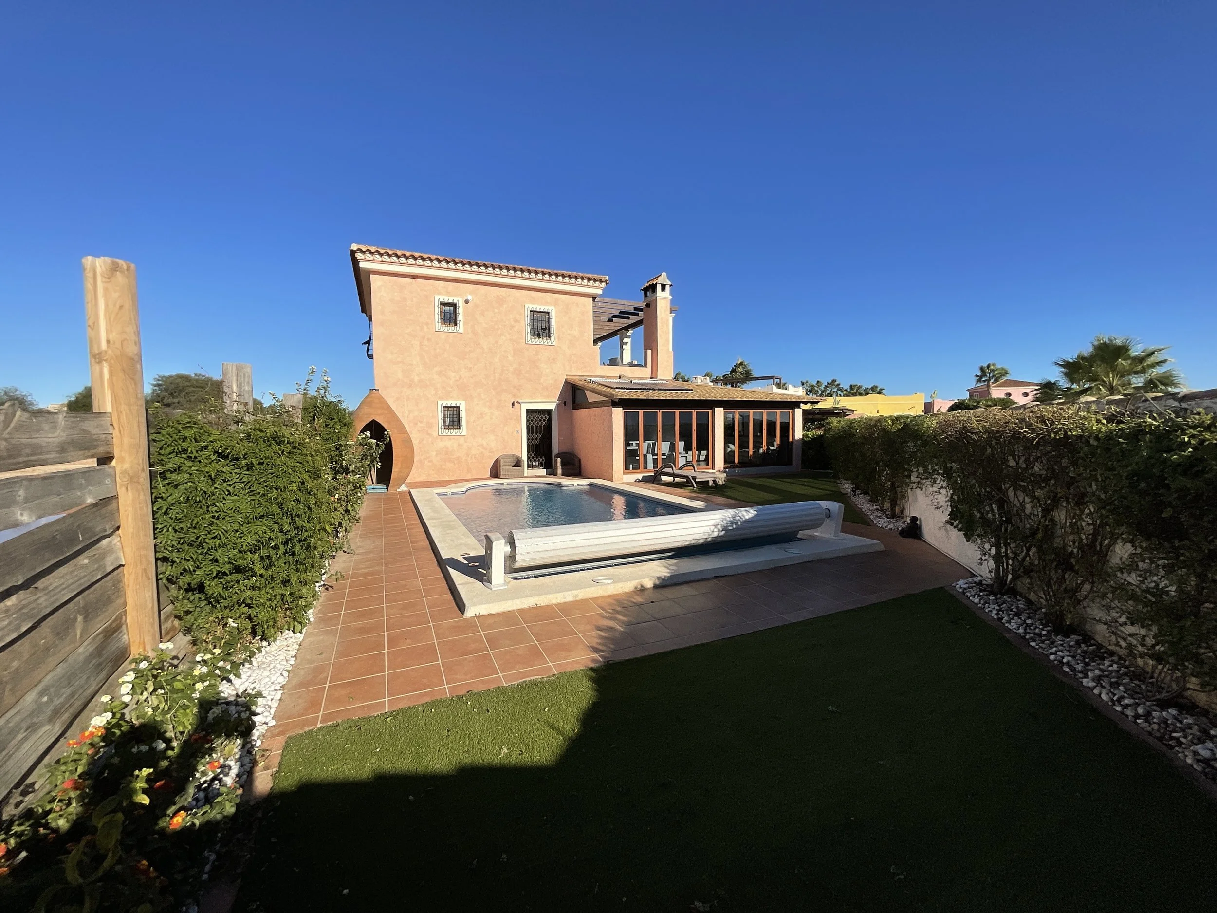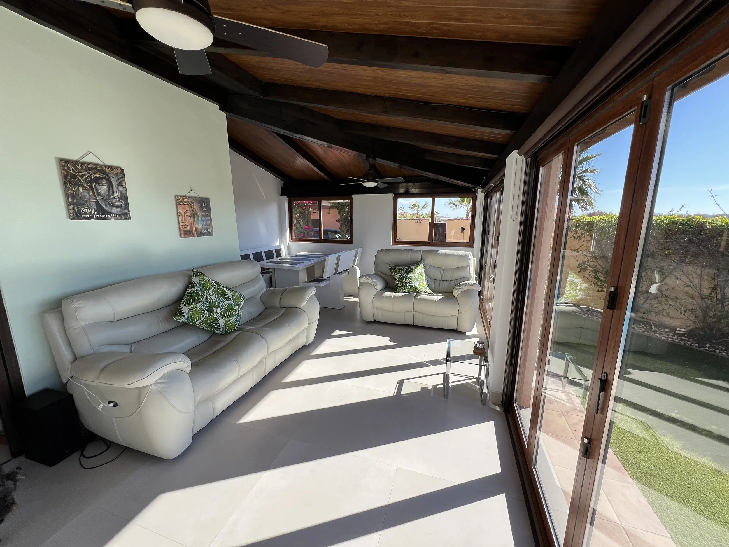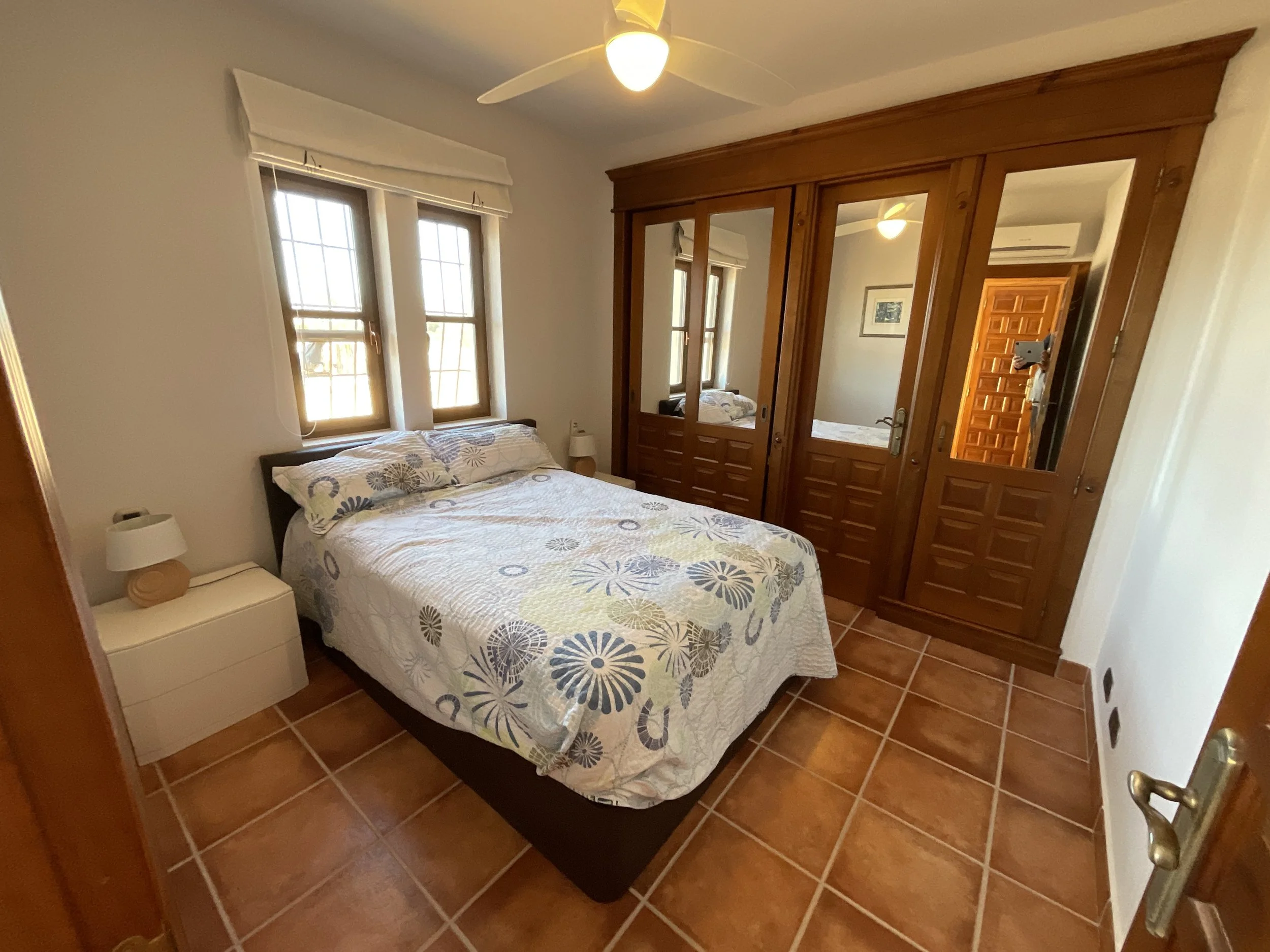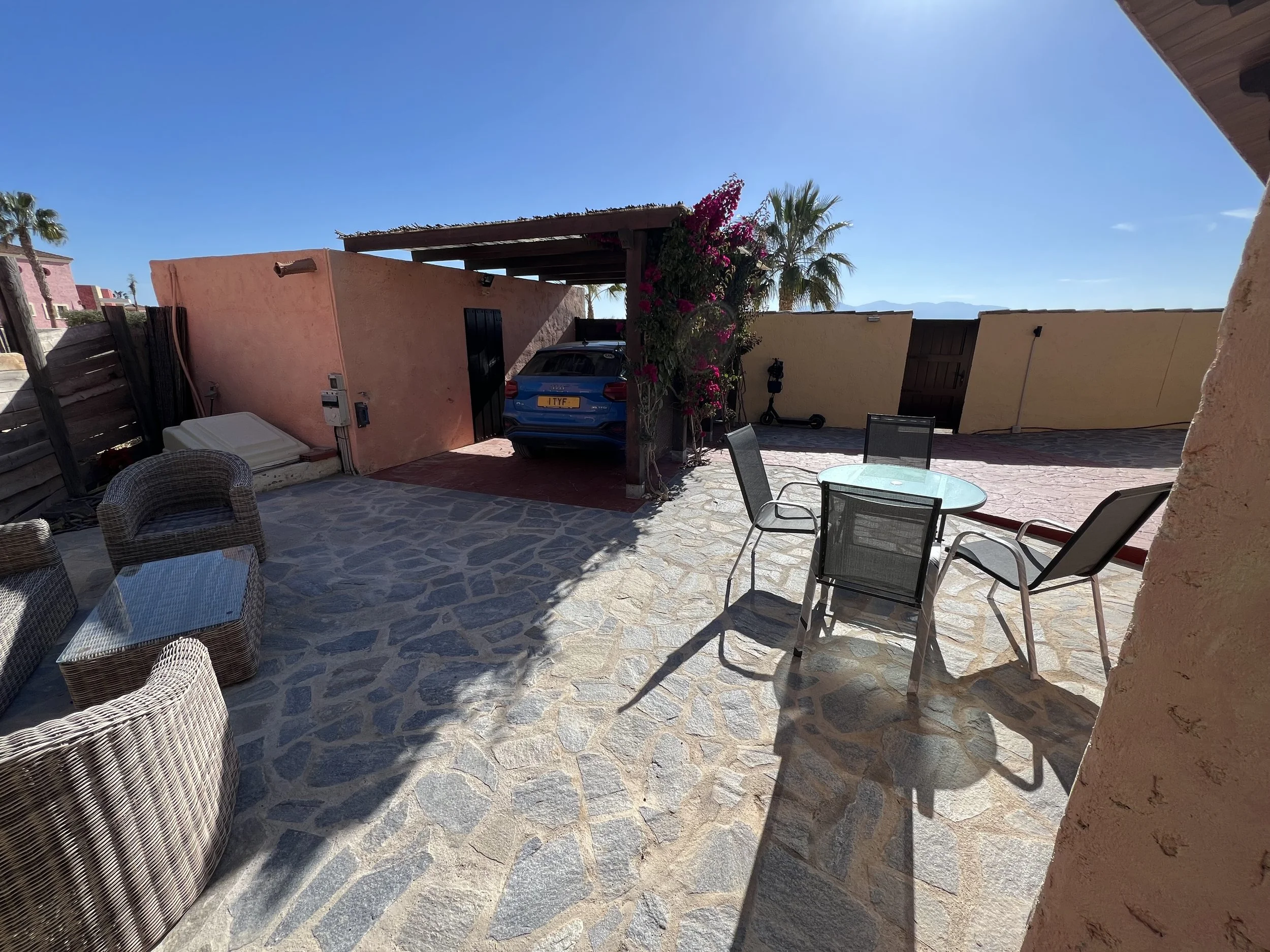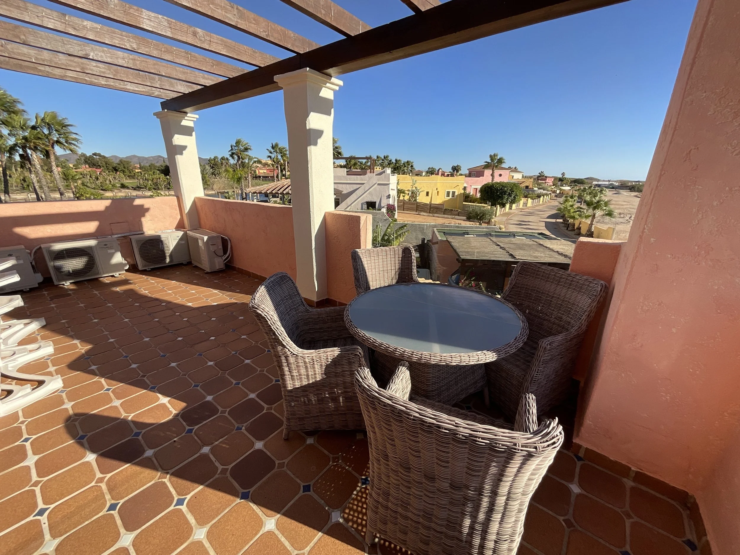 This beautiful, detached villa stands in a unique position in its own private grounds in the community of Sweetwater Island Drive. It has a private parking space and an individual garage within its boundary, not usually found in this design. The property has the benefit of a lovely, sunny location overlooking the mountains beyond, located close to the fourteenth and fifteenth tee and just a short stroll away from the lake and to all of the resorts facilities. Bright, airy, spacious and well-presented throughout, there is a large living/dining room with a glassed sun lounge, an open-plan, fully fitted kitchen, 1 bedroom and bathroom on the ground floor with a further 2 bedrooms both with ensuites on the first floor. The master bedroom opens out on to a large terrace with views across Mojacar. Situated in an easy-to-maintain garden, with storage areas, it has the added advantage of its own solar-heated individual pool. Efficiently powered by solar panels, this unique property also enjoys low-cost electricity.