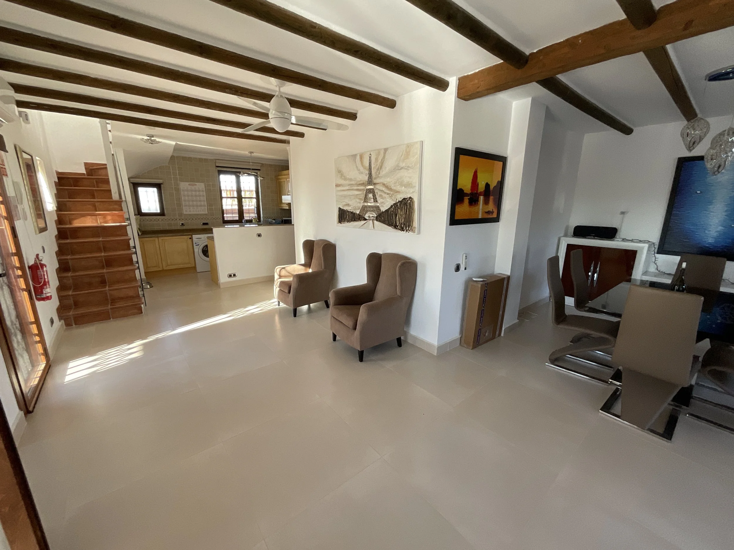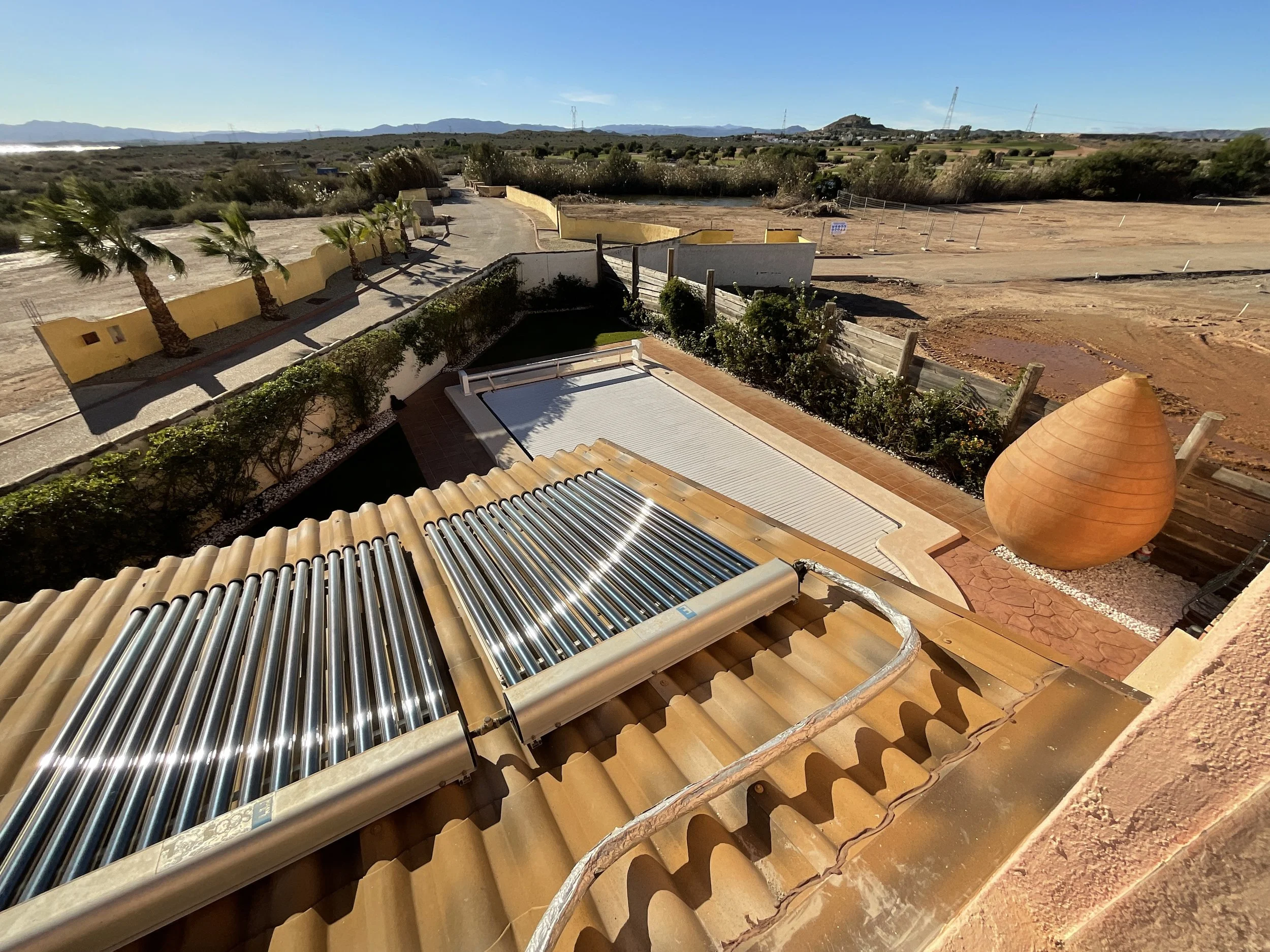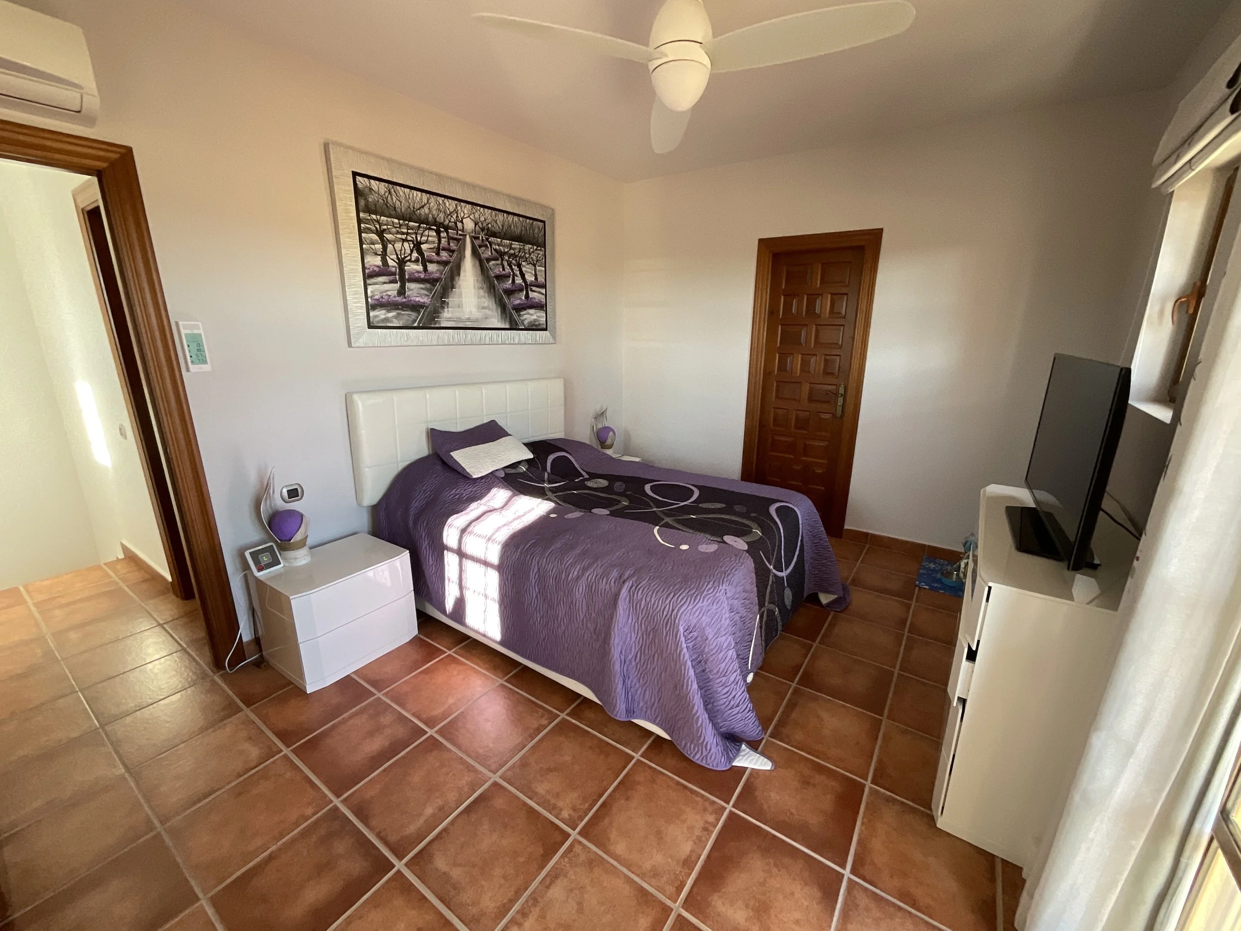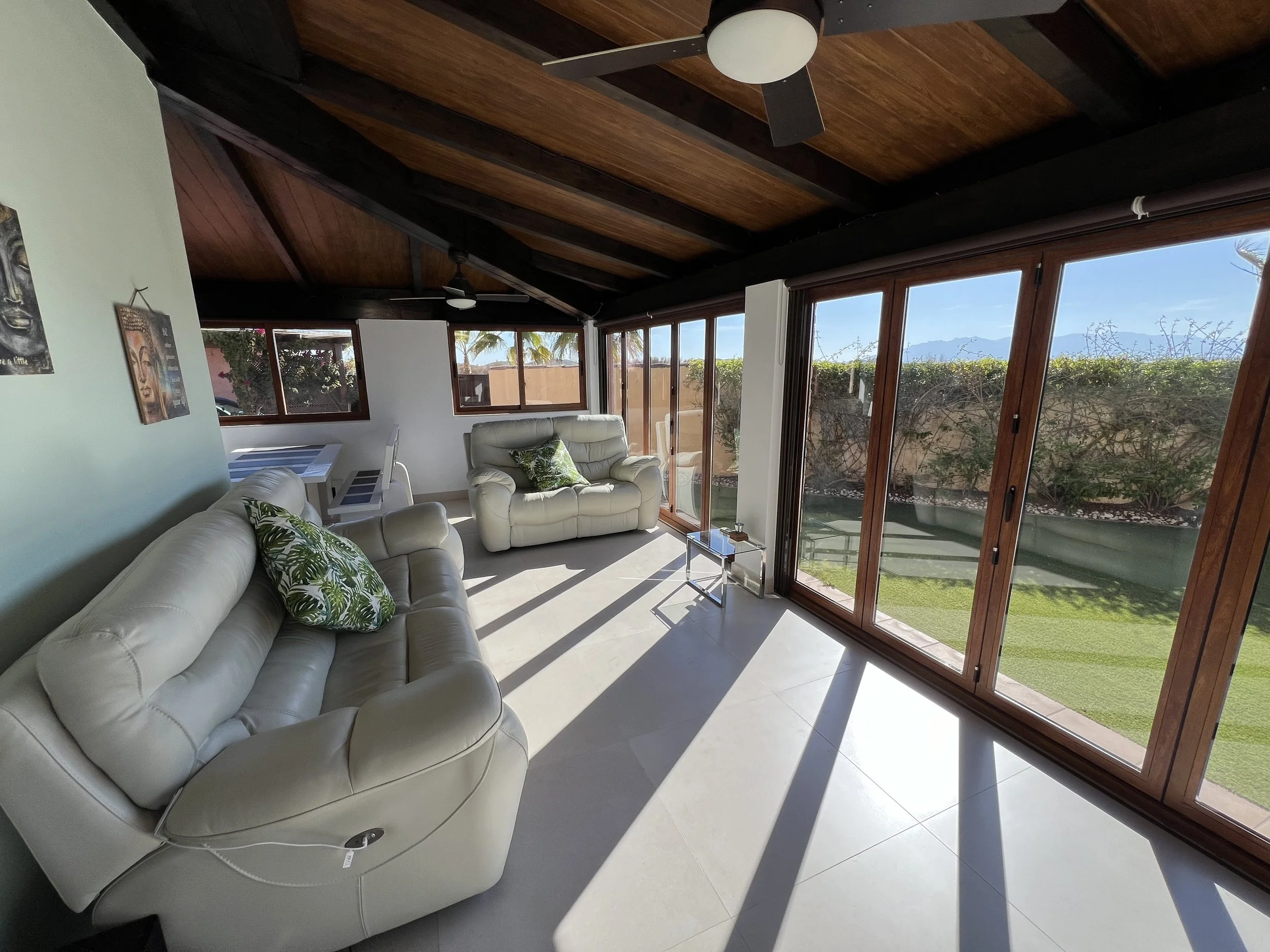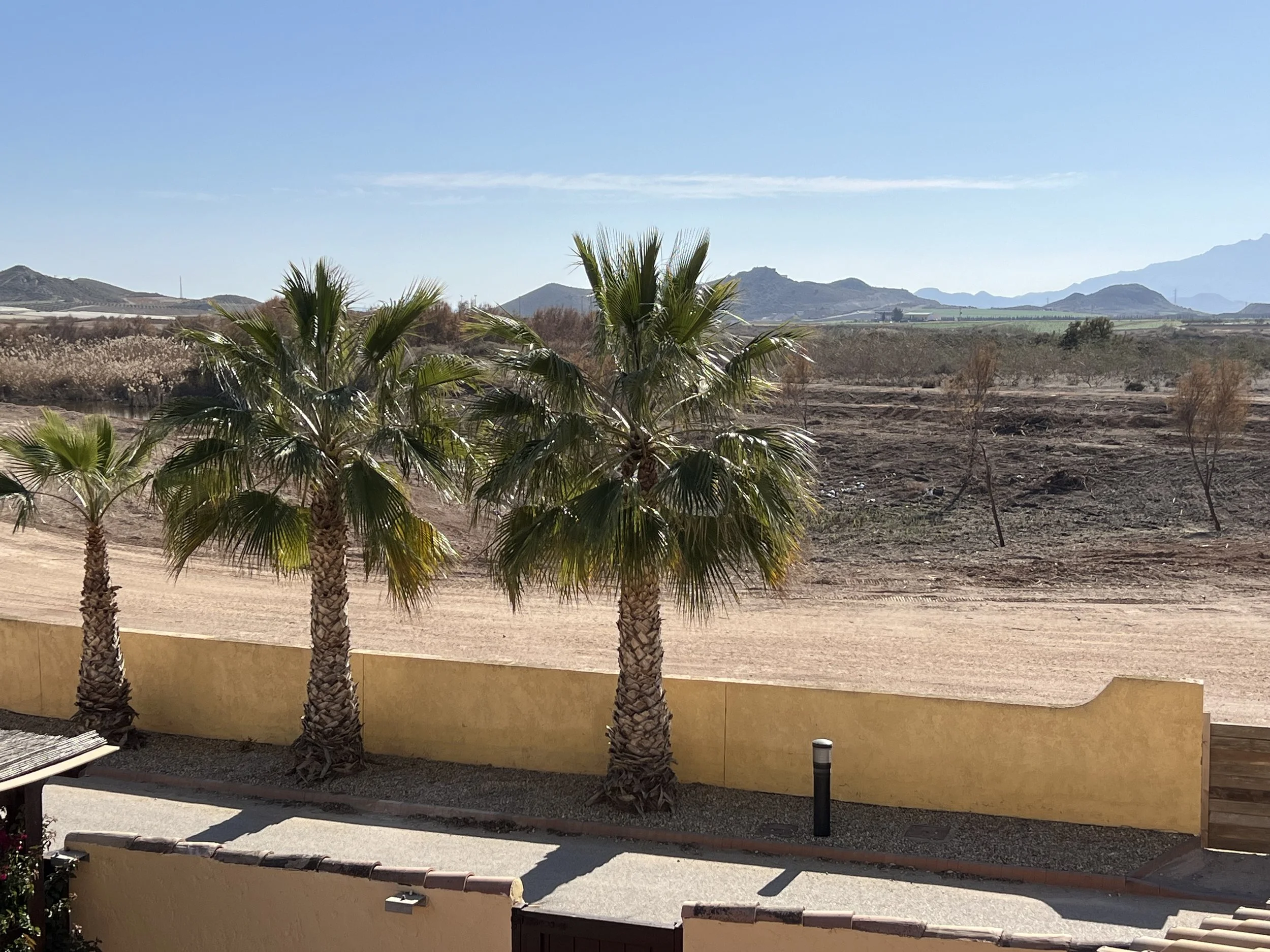 This beautiful, detached villa stands in a unique position in its own private grounds in the community of Sweetwater Island Drive. It has a private parking space and an individual garage within its boundary, not usually found in this design. The property has the benefit of a lovely, sunny location overlooking the mountains beyond, located close to the fourteenth and fifteenth tee and just a short stroll away from the lake and to all of the resorts facilities. Bright, airy, spacious and well-presented throughout, there is a large living/dining room with a glassed sun lounge, an open-plan, fully fitted kitchen, 1 bedroom and bathroom on the ground floor with a further 2 bedrooms both with ensuites on the first floor. The master bedroom opens out on to a large terrace with views across Mojacar. Situated in an easy-to-maintain garden, with storage areas, it has the added advantage of its own solar-heated individual pool. Efficiently powered by solar panels, this unique property also enjoys low-cost electricity.